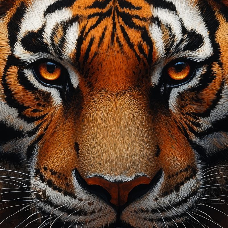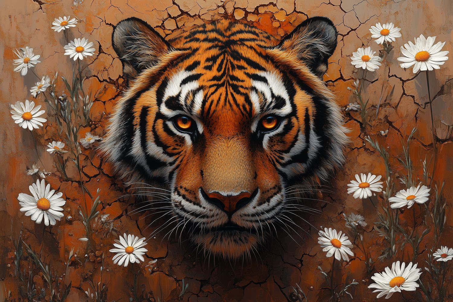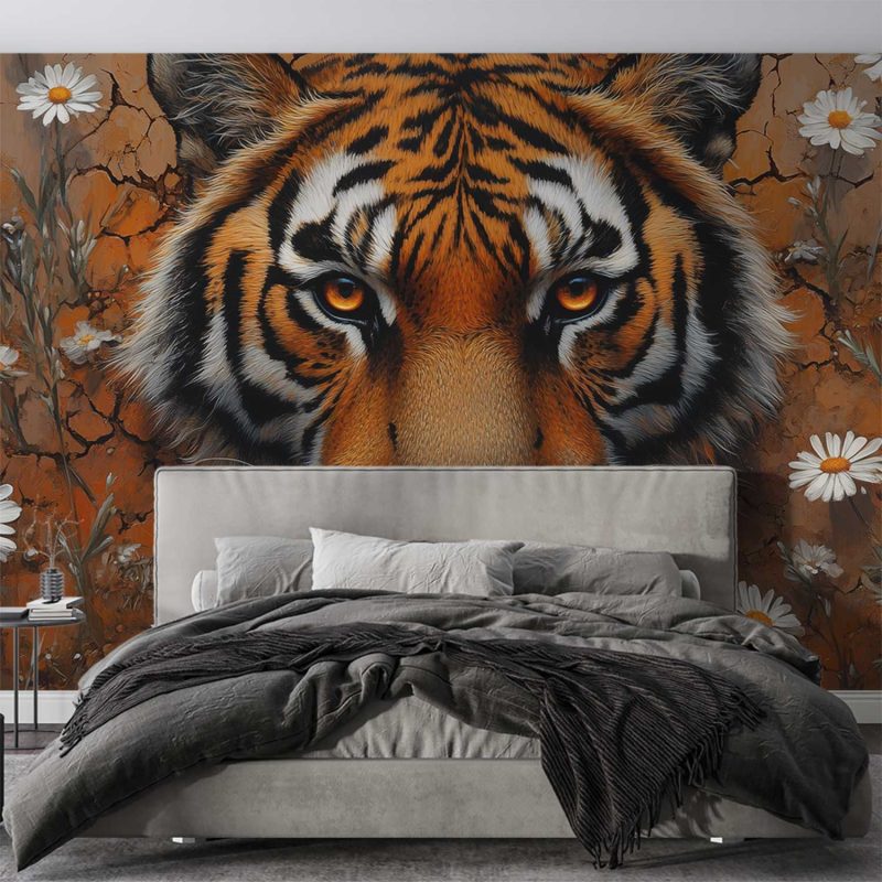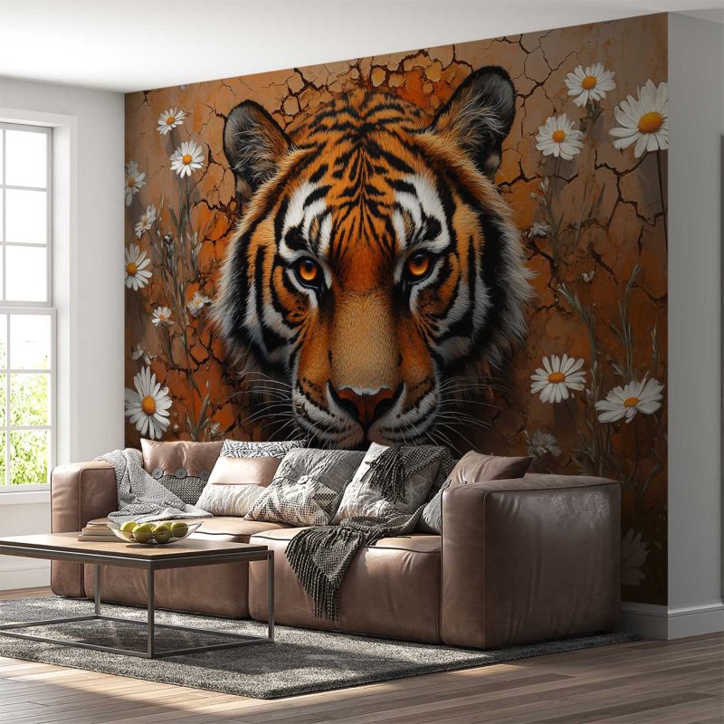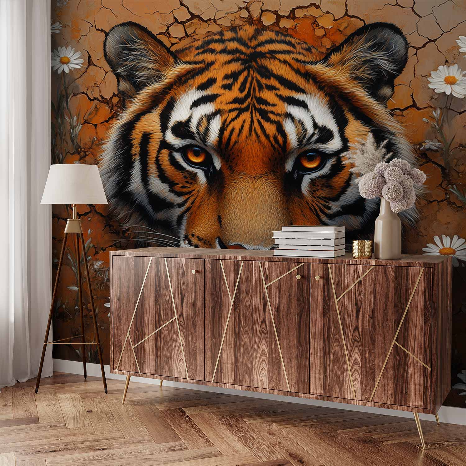 Vurige oranje tinten dansen rond de krachtige blik van deze tijger, wiens vacht levendig contrasteert met barstend muurwerk. Witte madeliefjes omkransen het geheel met tedere elegantie. Dit behang brengt een gevoel van wilde schoonheid en energie in je ruimte, perfect voor wie verlangt naar een statement vol natuurlijke harmonie en diepte.