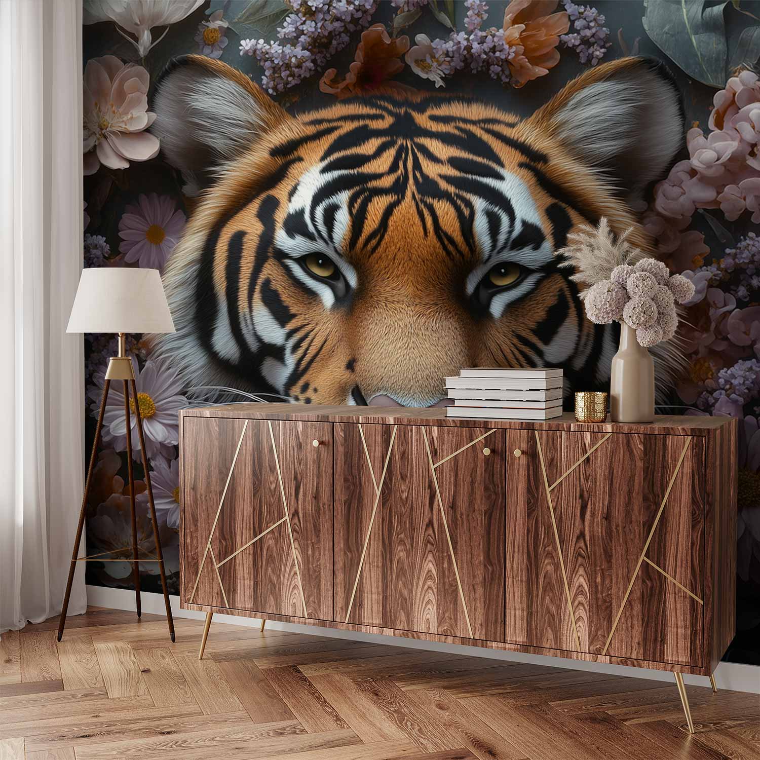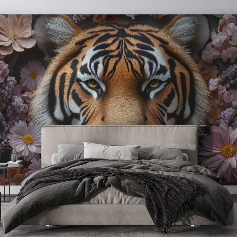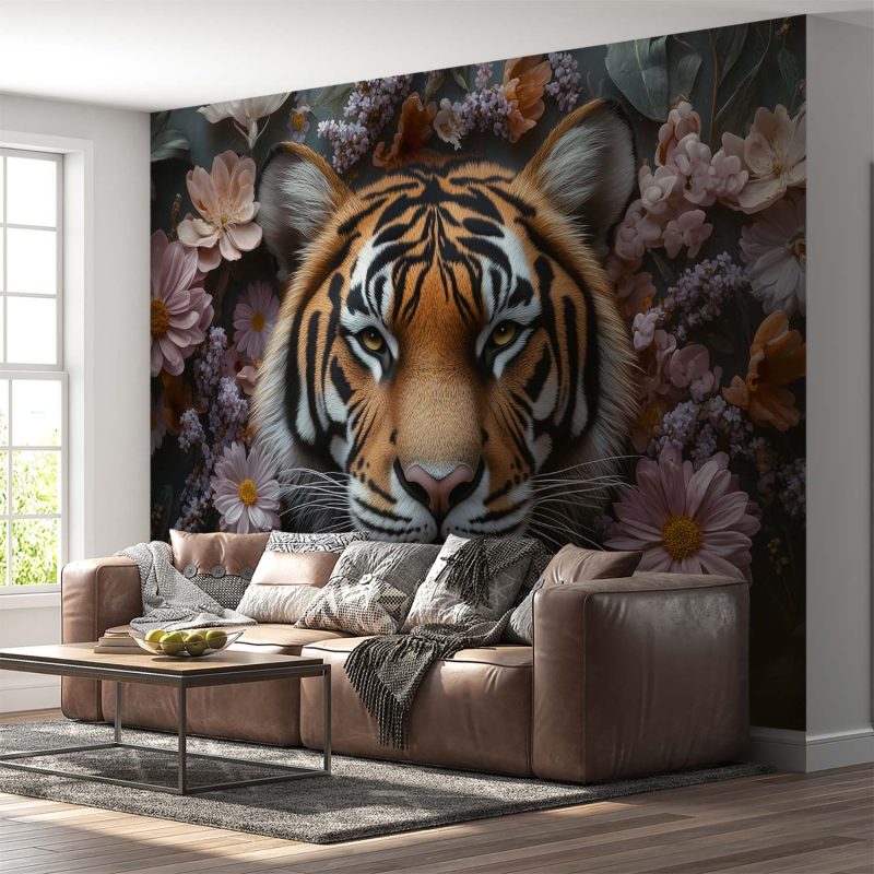 Tijger tussen bloemenpracht behang