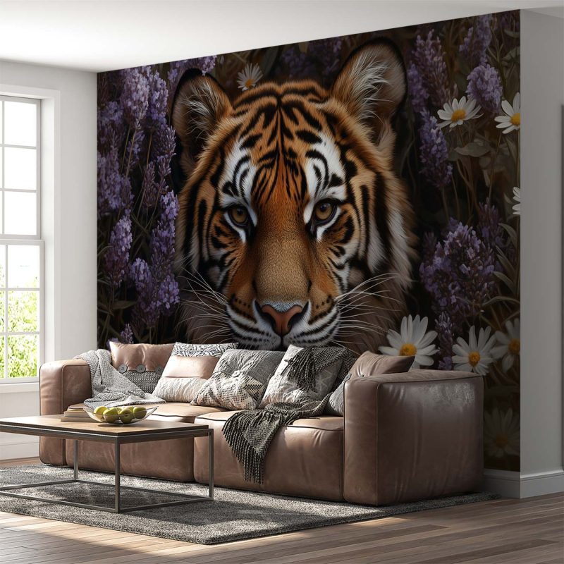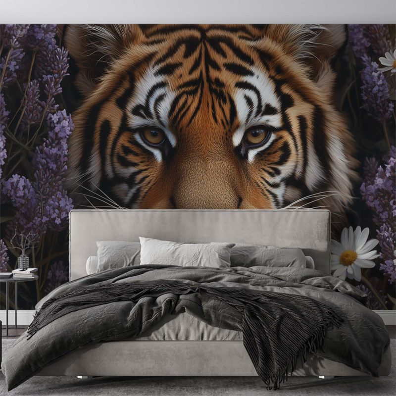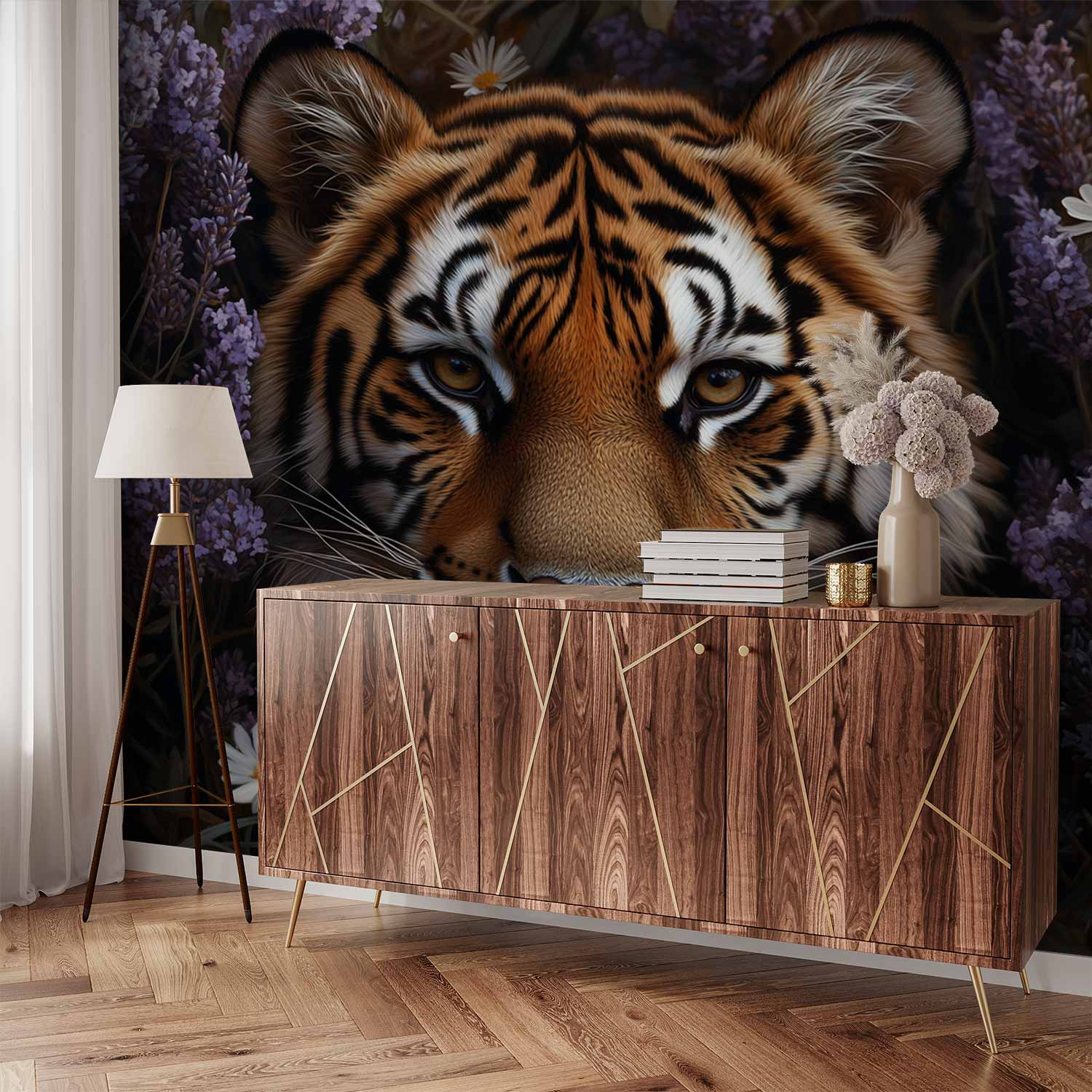 Ontwaakt in een zee van violette bloesems, de tijger kijkt doordringend met gouden ogen. Zijn oranje vacht gloeit tegen het zachte paars, een harmonieus samenspel van kracht en tederheid. Deze levendige scène brengt rustige wildernisenergie in je ruimte, perfect als statementwand die zowel avontuur als sereniteit uitstraalt.