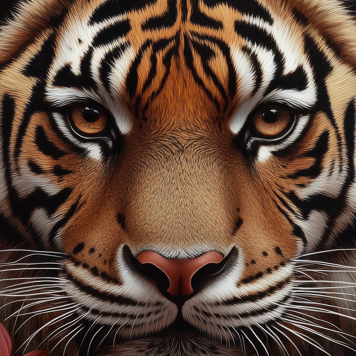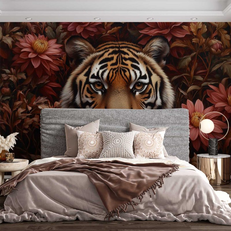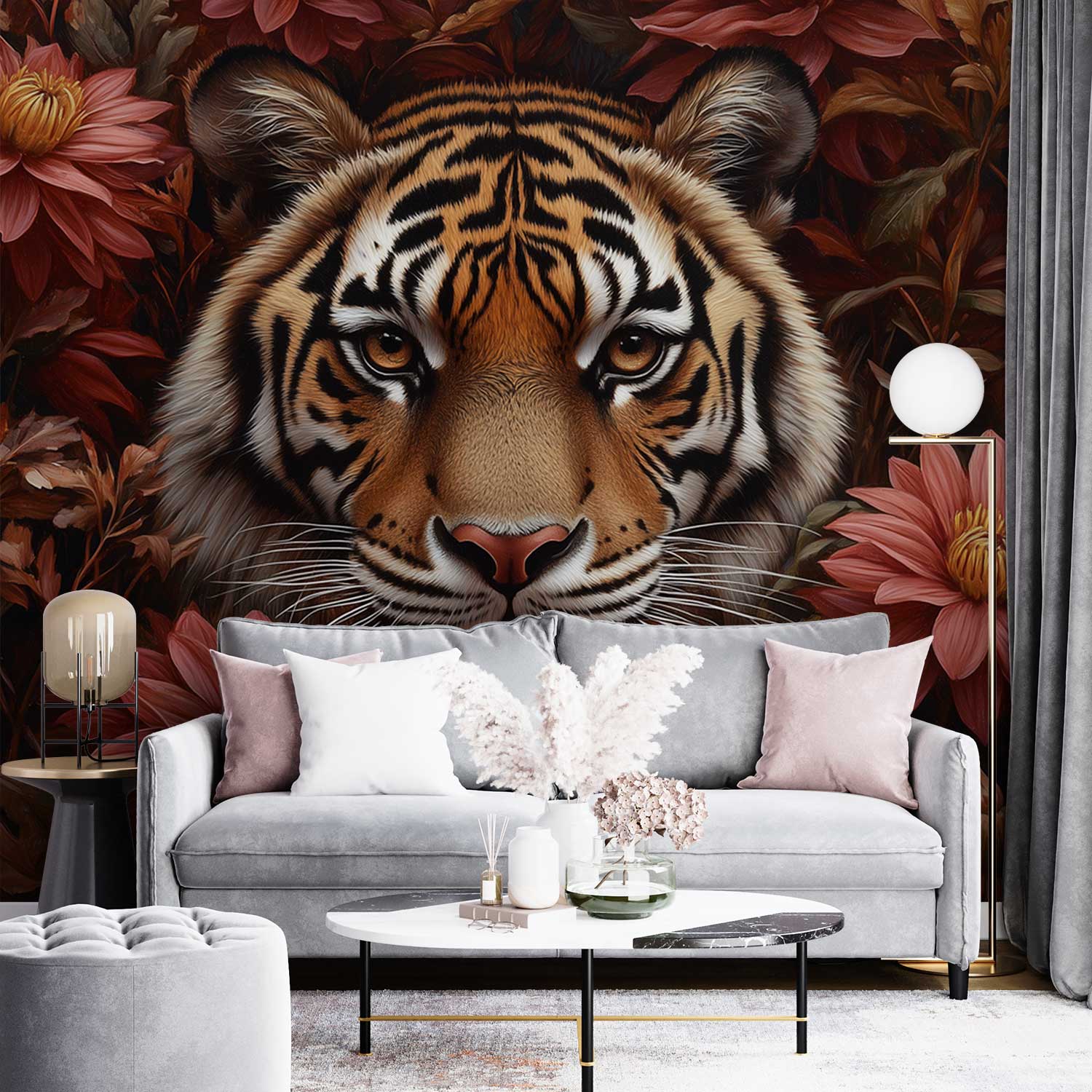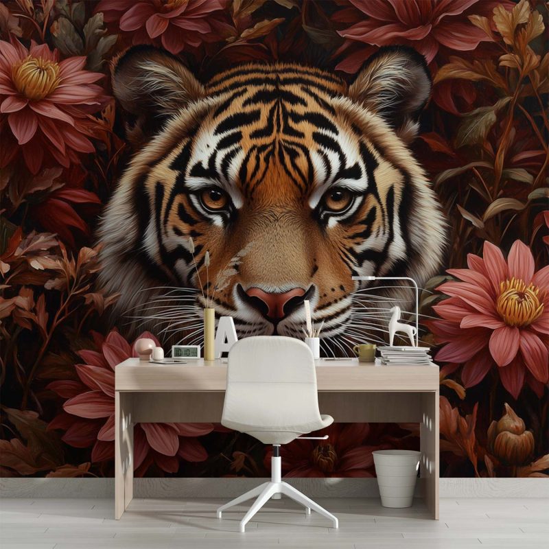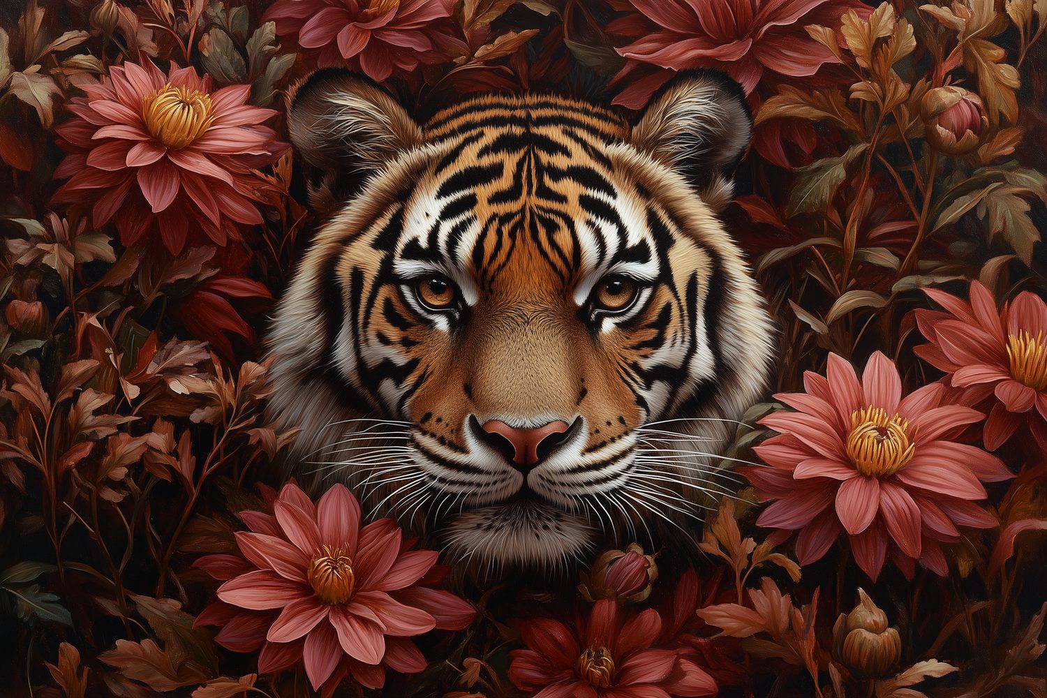 Vurige oranje en rode tinten dansen rond de trotse tijger, omringd door een zee van bloesems. Zijn serene blik weerspiegelt harmonie tussen wildernis en bloemenpracht. Dit levendige tafereel brengt warmte en energie in elke ruimte, perfect voor wie verlangt naar een statement vol natuurlijke elegantie.
