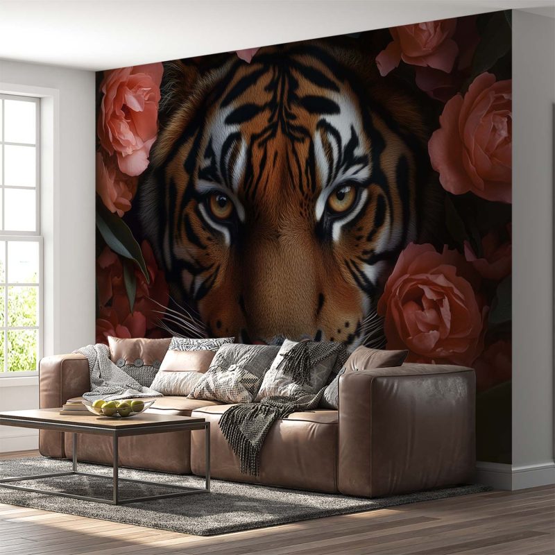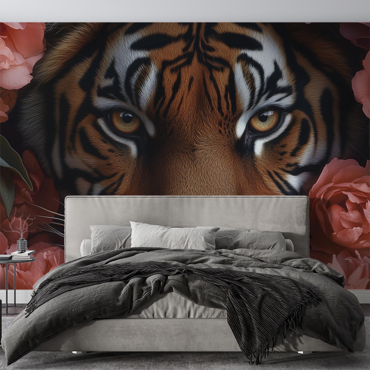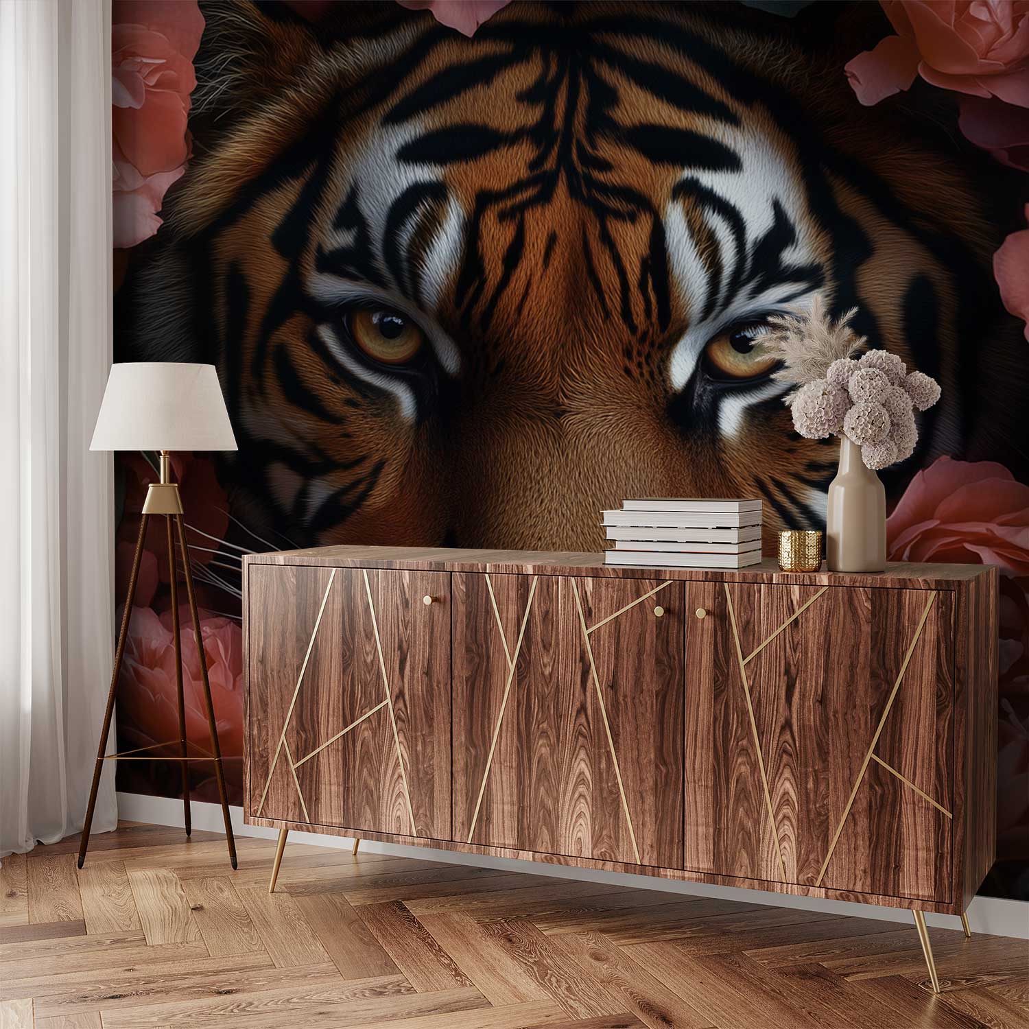 Verwarmend oranje en zacht roze dansen samen in dit levendige behang. De tijger kijkt doordringend tussen een zee van bloesems, vol serene kracht. Zijn blik trekt je de ruimte in, terwijl de bloemen een gevoel van harmonie brengen. Perfect voor een rustgevende woonkamer of een statement in de hal, waar natuur en rust samensmelten in een tijdloze sfeer.
