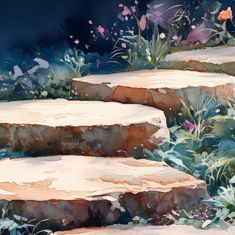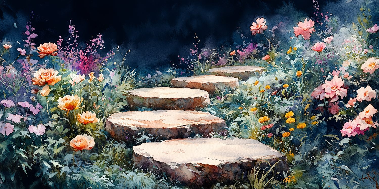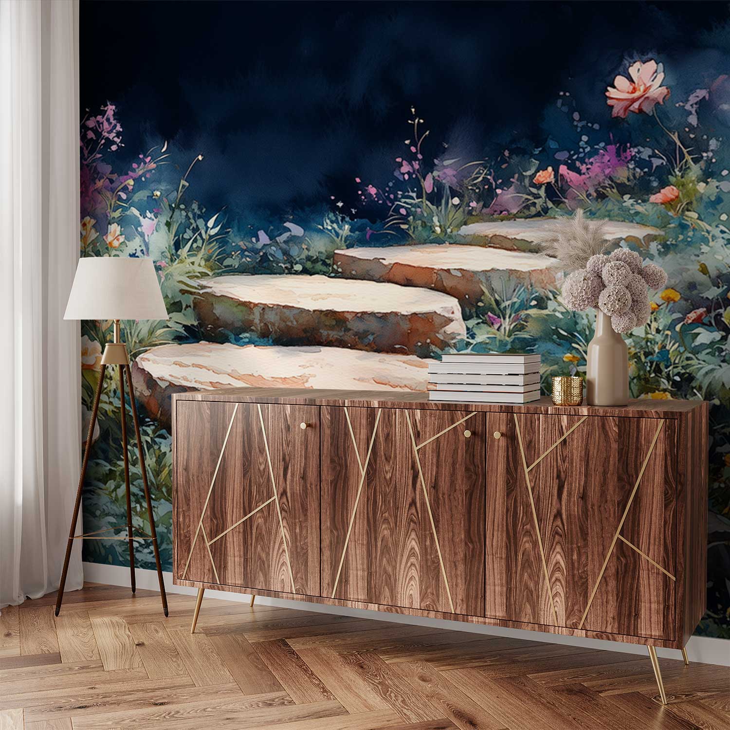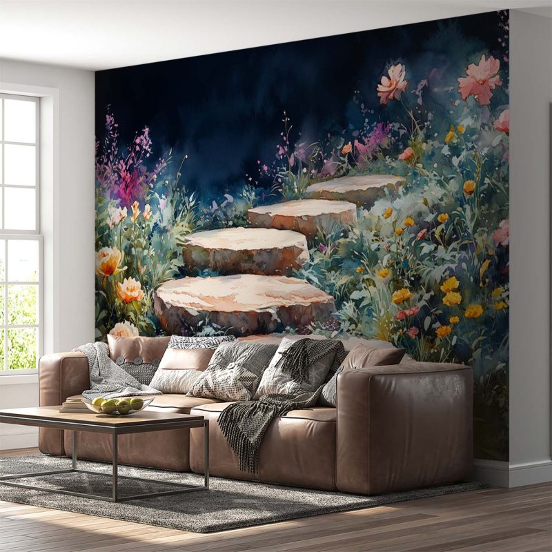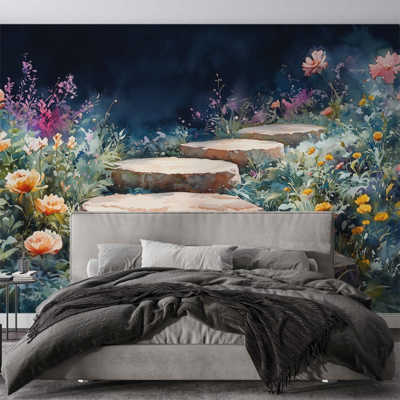 Zachte waterverfkleuren dansen over het behang, waar rozen en bloesems langs stenen traptreden wervelen. Een levendig tuintafereel in harmonieuze tinten groen, blauw en roze ademt pure sereniteit uit. Dit dromerige bloemenparadijs transformeert elke ruimte tot een oase van rust, waar de natuur zachtjes je interieur binnenstroomt en direct een gevoel van vrede brengt.