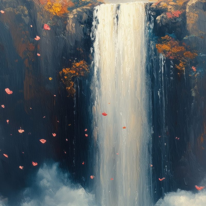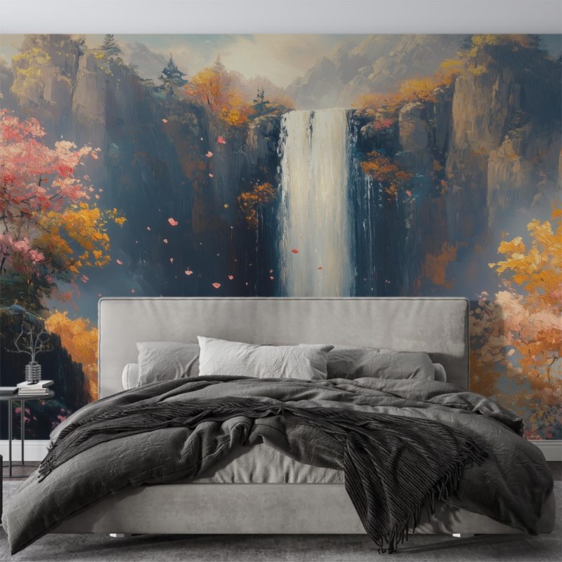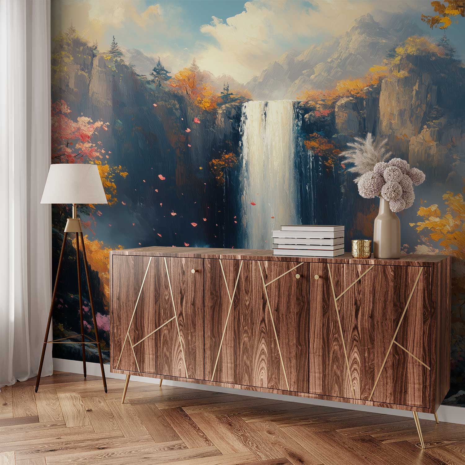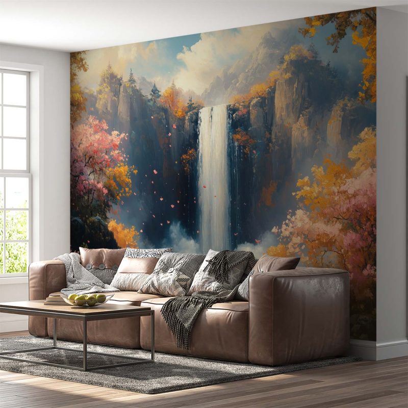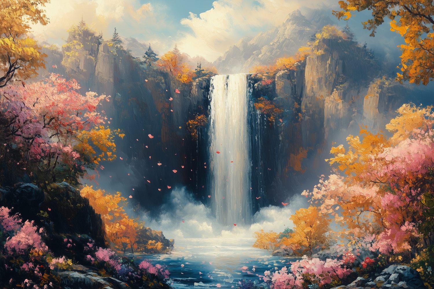 Betoverend waterval schouwspel in harmonieuze kleurenpracht. Levendige tinten blauw en groen dansen met warm oranje en roze, terwijl het krachtige water naar beneden stort. Dit kunstwerk ademt pure rust en brengt de serene kracht van de natuur recht je huis in. Perfect om elke ruimte te transformeren tot een oase van kleur en kalme energie.