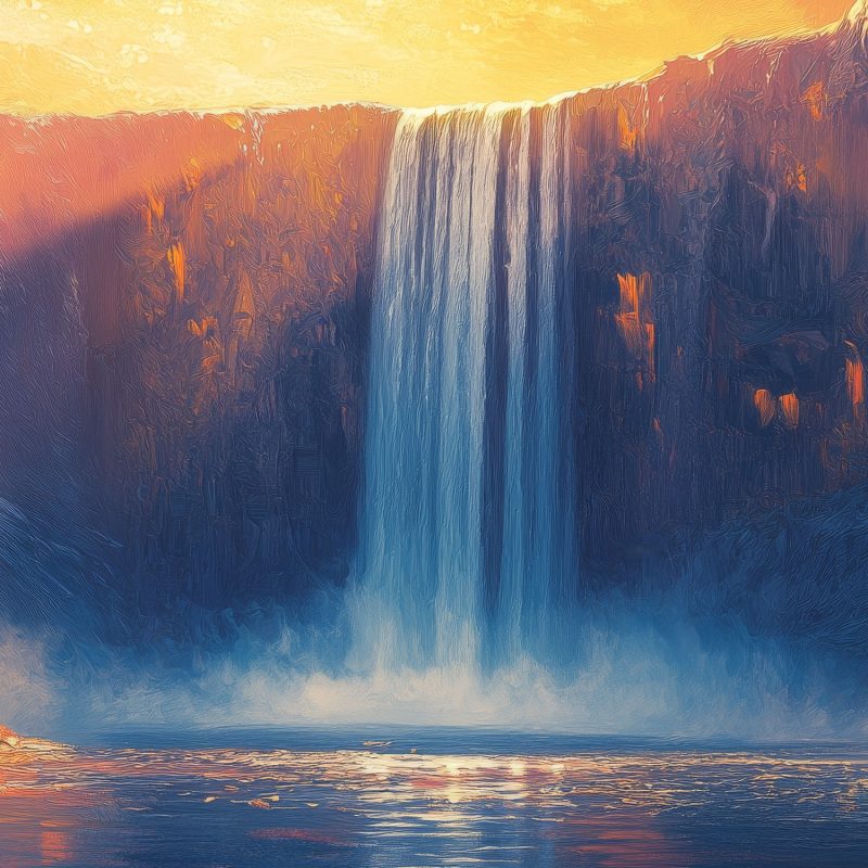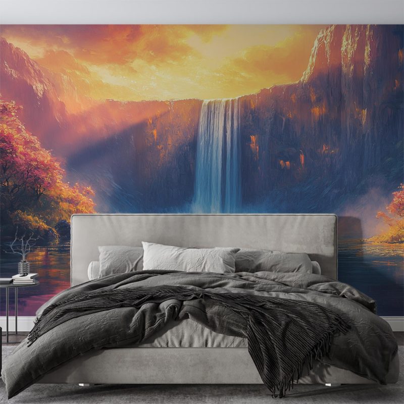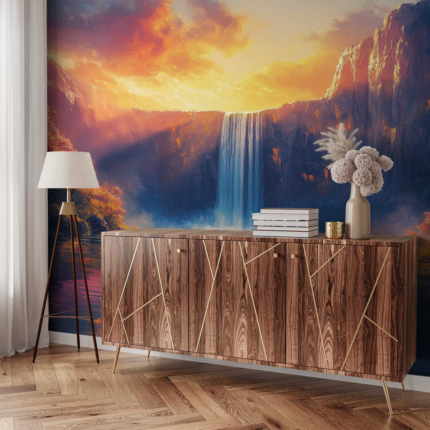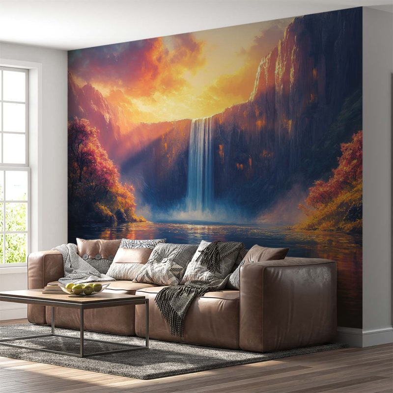 Warme oranje en gele tinten dansen boven een majestueuze waterval die zich een weg baant door het weelderige groen. Dit levendige tafereel brengt de rustgevende energie van de natuur in huis, perfect voor een ruimte waar ontspanning en natuurlijke schoonheid samenkomen. De harmonieuze kleuren en vloeiende beweging creëren een serene sfeer die elke kamer transformeert tot een persoonlijke oase.