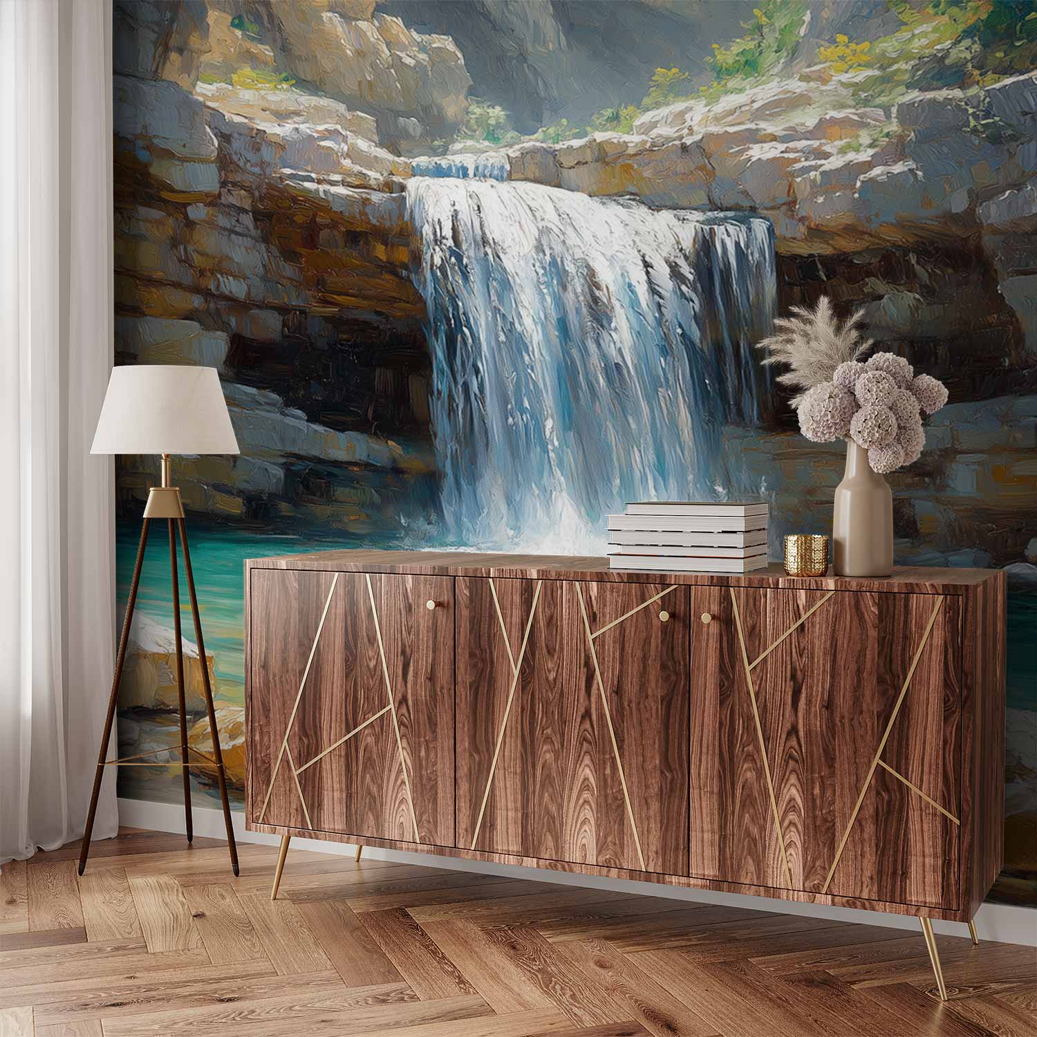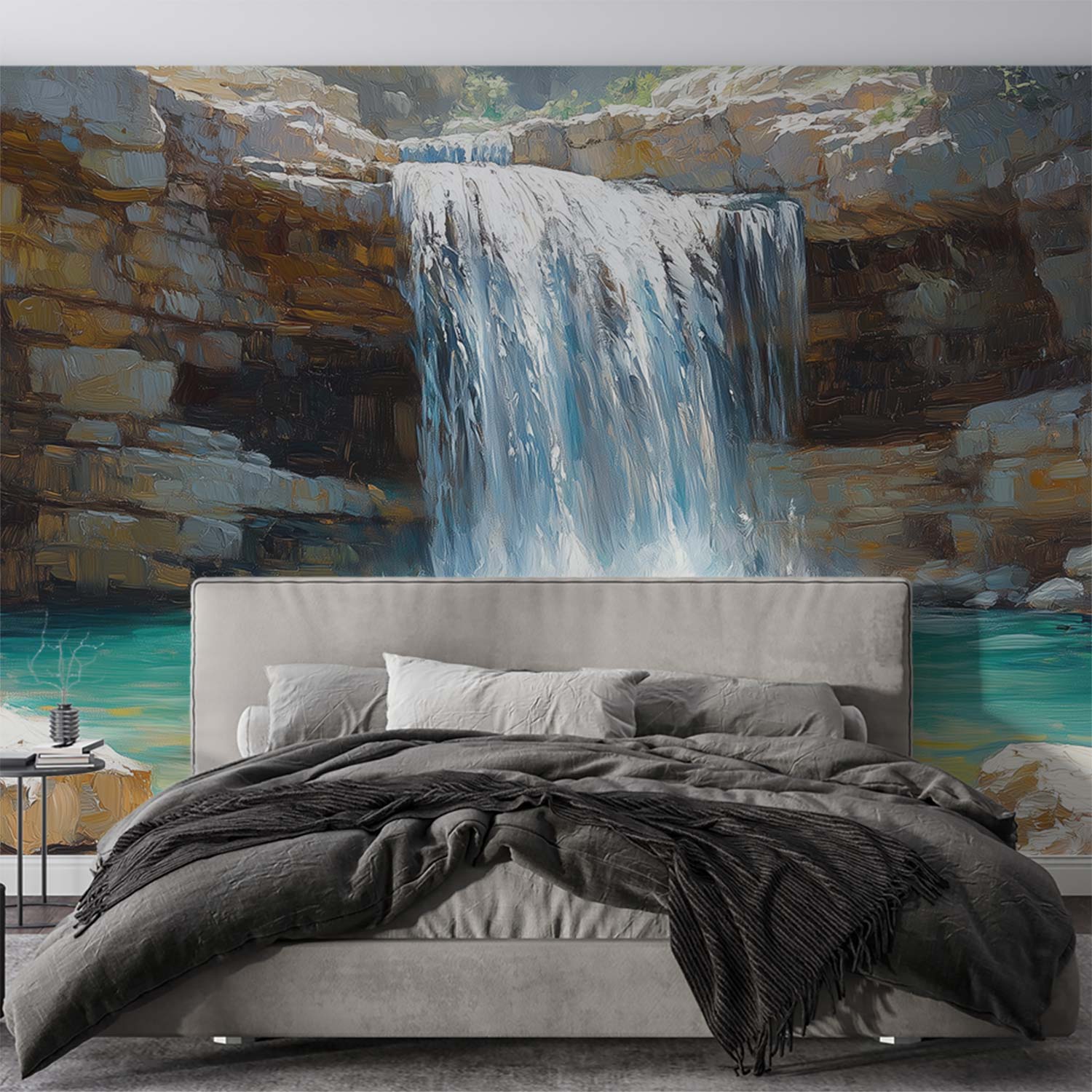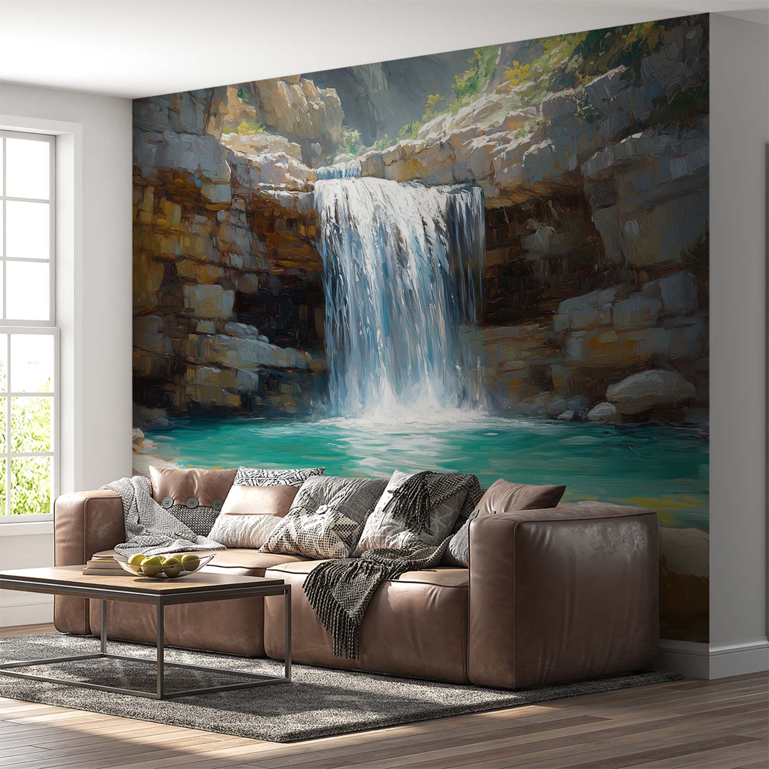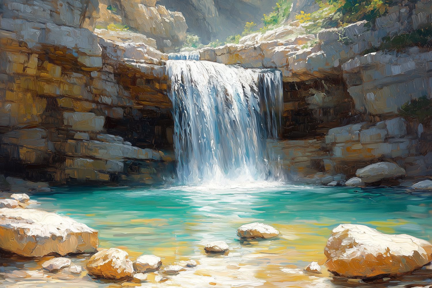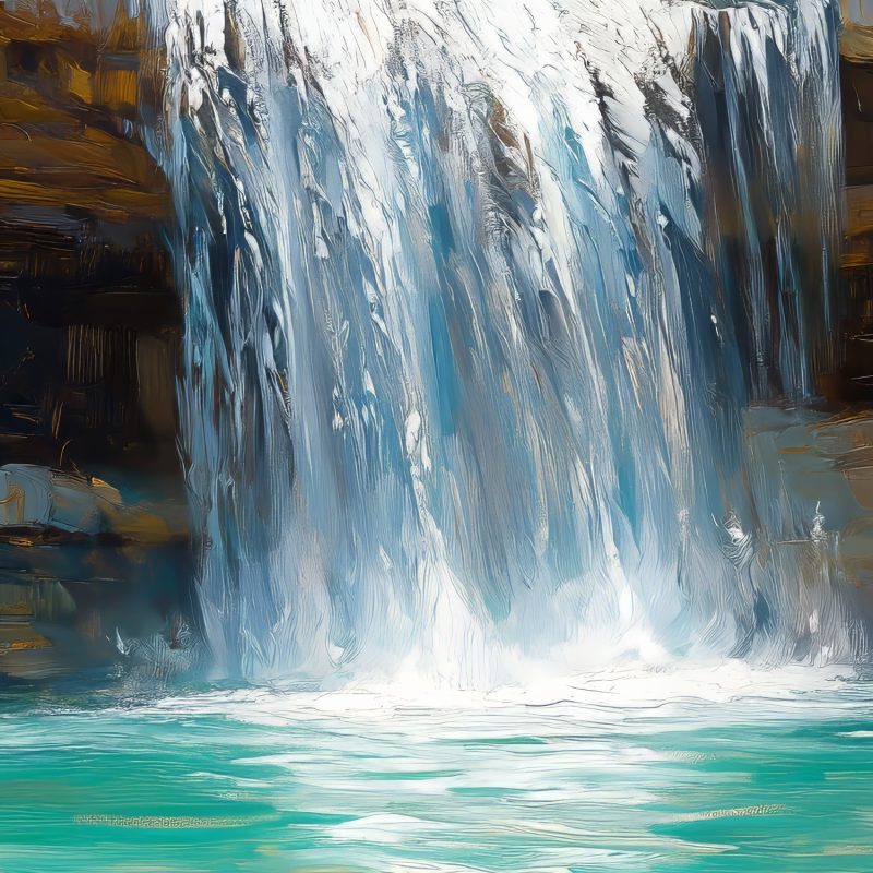 Ontwaak bij het rustgevende ritme van een waterval die langs rotsen danst. Frisse tinten blauw contrasteren met helder wit gesteente en weelderig groen. Dit levendige tafereel brengt de serene kracht van de natuur naar binnen, perfect om elke ruimte tot een oase van kalmte te transformeren. De realistische diepte en lichtspelingen creëren een adembenemend accent dat zowel energie als rust uitstraalt.