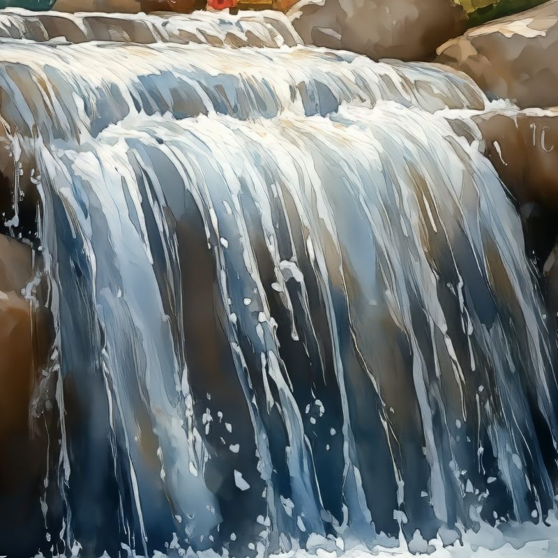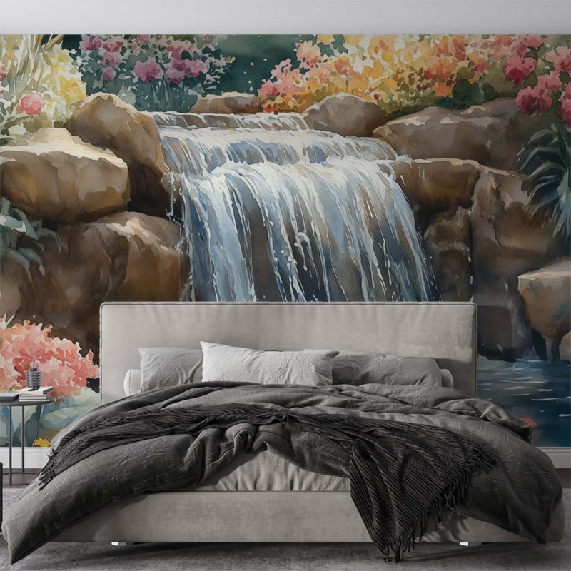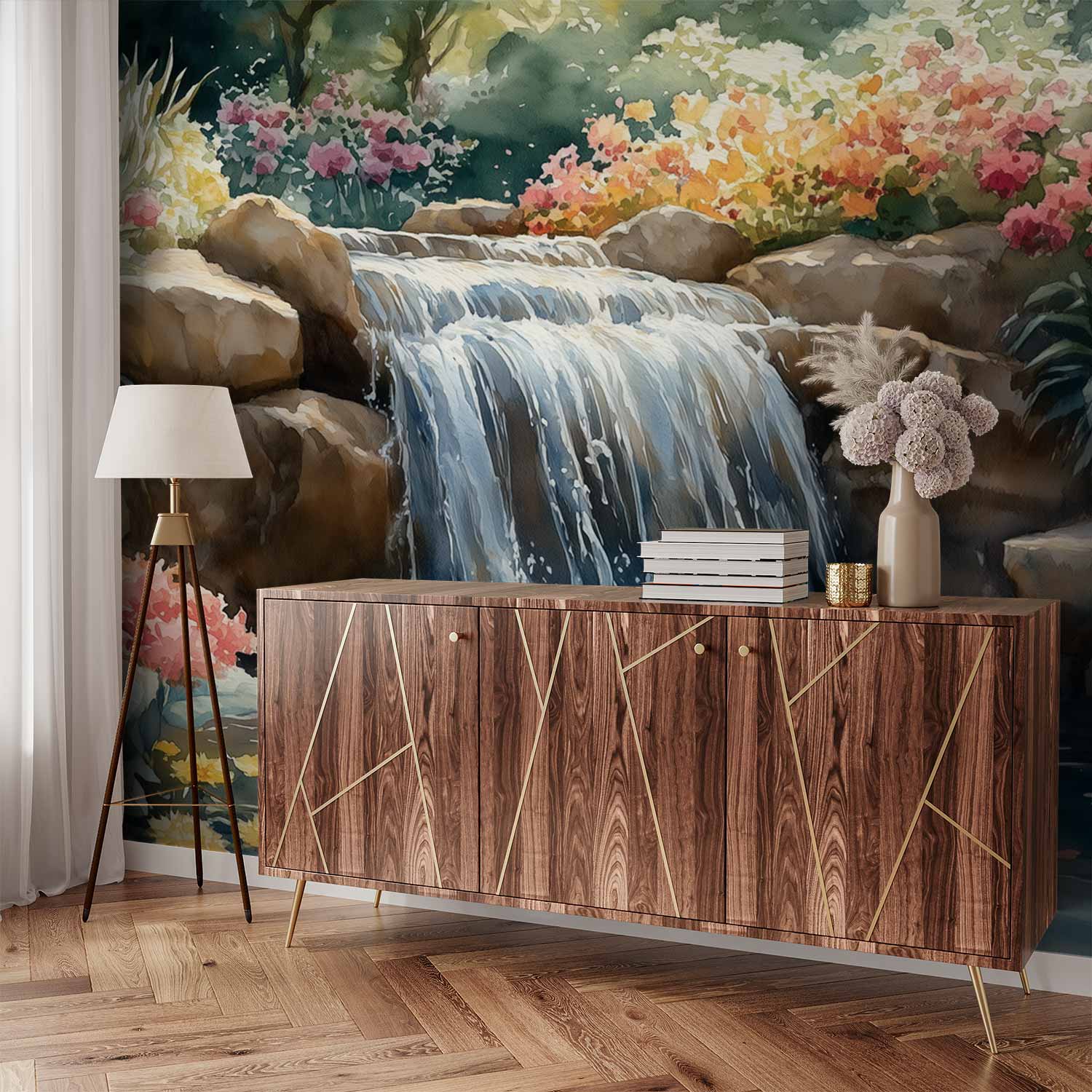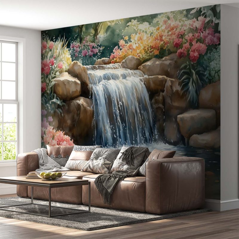 Ontwaakt een waterval vol leven, omringd door een weelderige bloemenzee in zachte blauwe, groene en roze tinten. Het water stroomt sereen tussen rotsen, terwijl levendige bloemen dansen in de bries. Brengt de rust en harmonie van de natuur naar binnen, perfect voor een ruimte waar ontspanning en kleurrijke elegantie samenkomen.