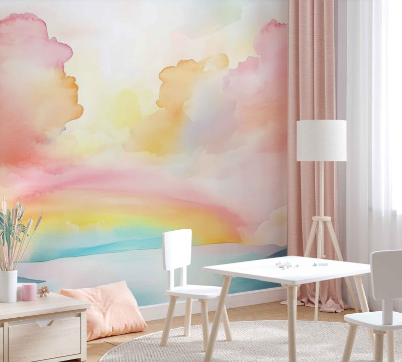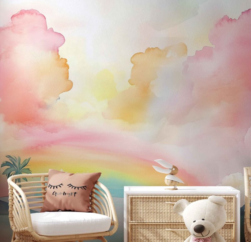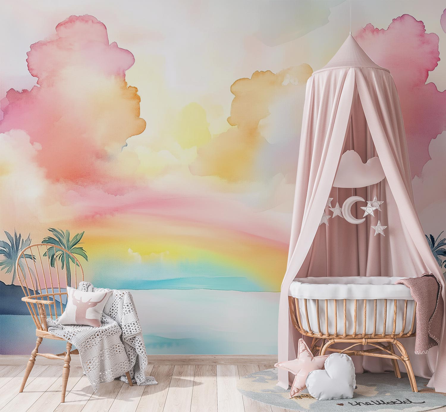 Zachte waterverfkleuren dansen over de muur in een betoverend zonsondergangsspektakel. Roze, oranje en goudgeel omarmen een tropisch eilandje waar palmbomen zachtjes wiegen. Deze dromerige scène brengt rust en avontuur in de kinderkamer – perfect om in weg te dromen of verhalen te verzinnen voor het slapengaan.