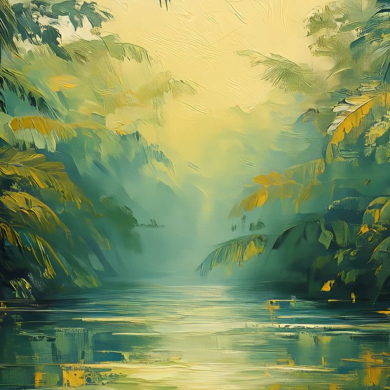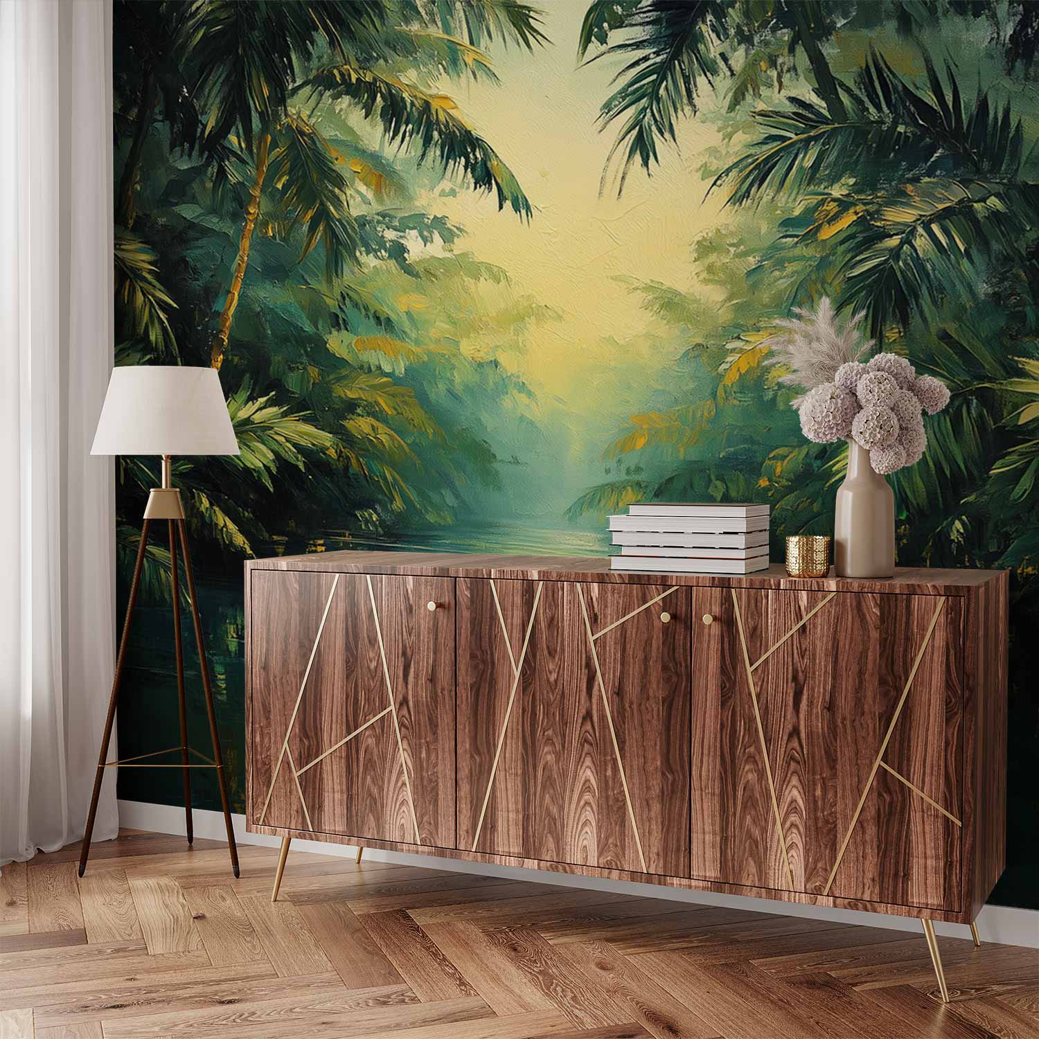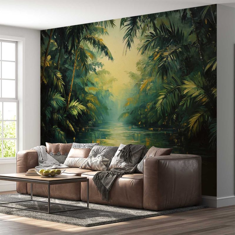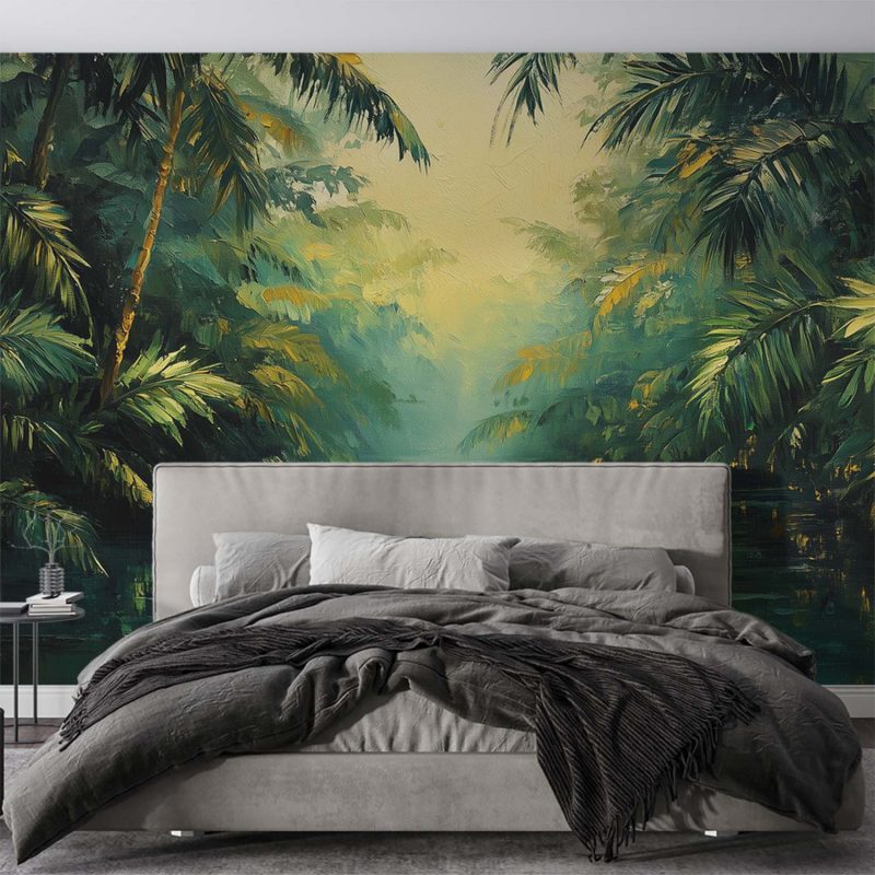 Zachte groene en gouden tinten dansen over dit behang. Palmbladeren wiegen zachtjes in een denkbeeldige bries en creëren een levendig, impressionistisch woud. Deze serene tropische sfeer brengt onmiddellijke rust en een gevoel van ontsnapping in je huis. De harmonieuze compositie voegt diepte en natuurlijke energie toe aan elke ruimte, perfect voor een kalme achtergrond die toch vol leven zit.