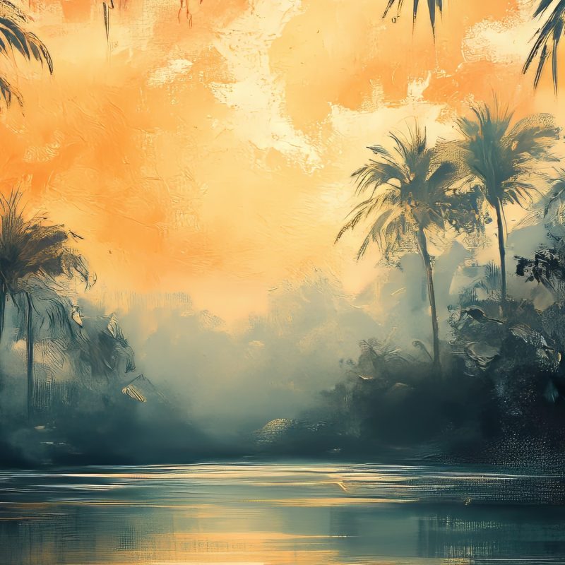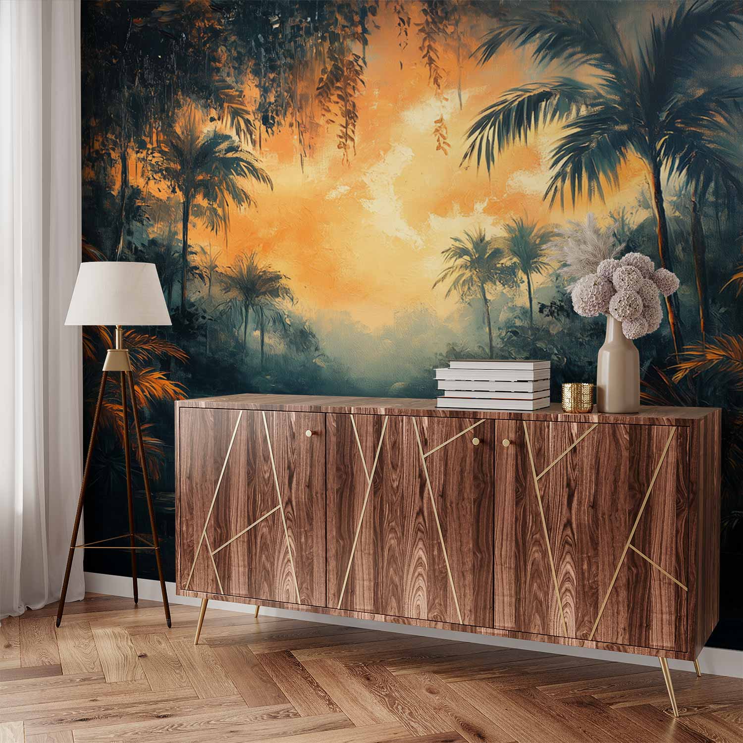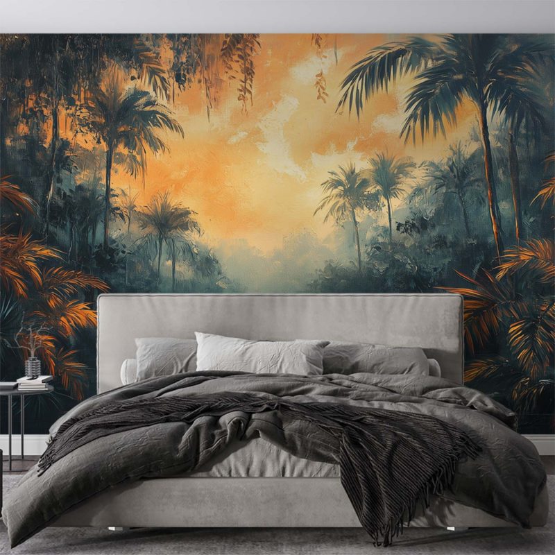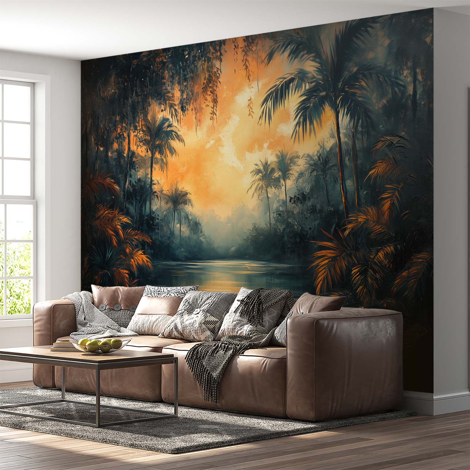 Gouden zonnestralen dansen over het water, omarmd door weelderige palmen. Dit levendige tropische tafereel ademt pure rust met zijn warme oranje gloed en frisse groene tinten. Breng de serene sfeer van een azuurblauwe lagune direct je huis binnen. Perfect voor een rustgevende accentmuur die elke ruimte transformeert tot een persoonlijke oase van kalmte.