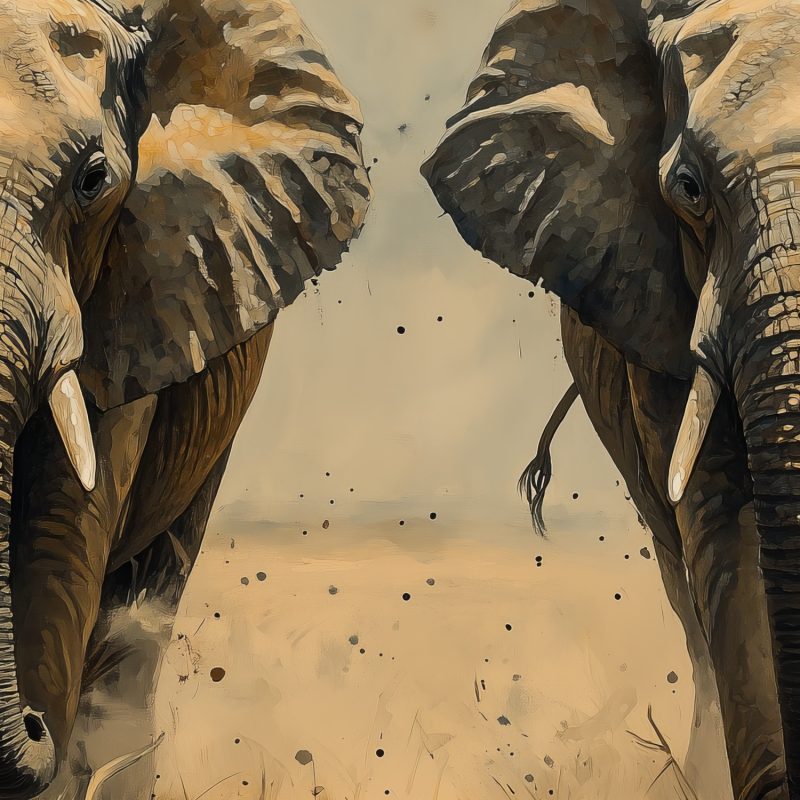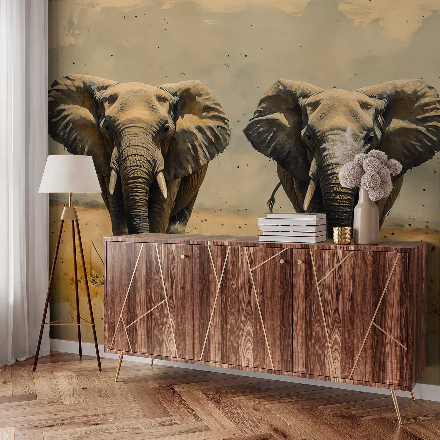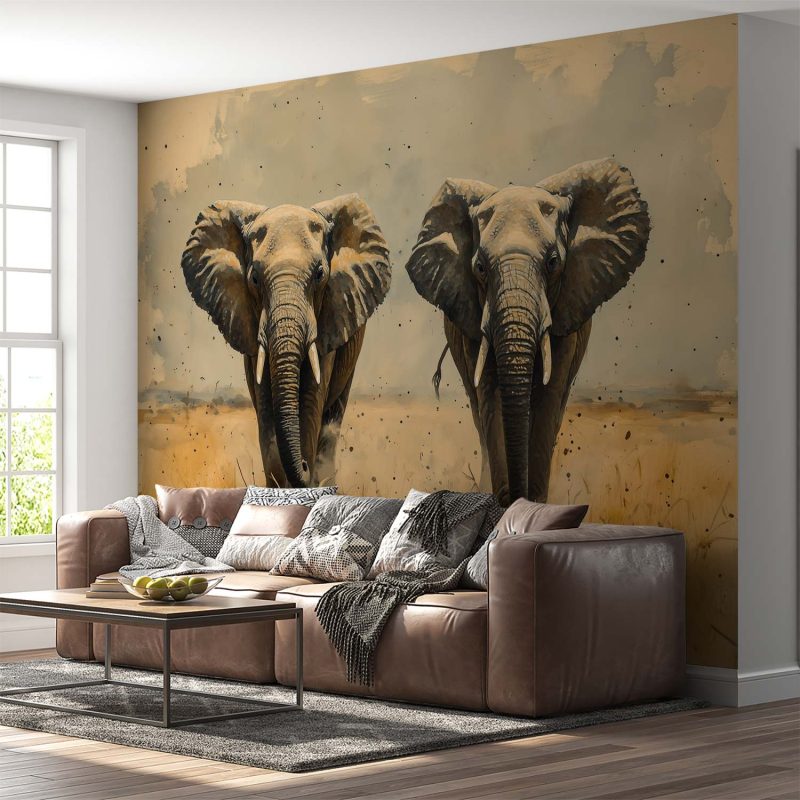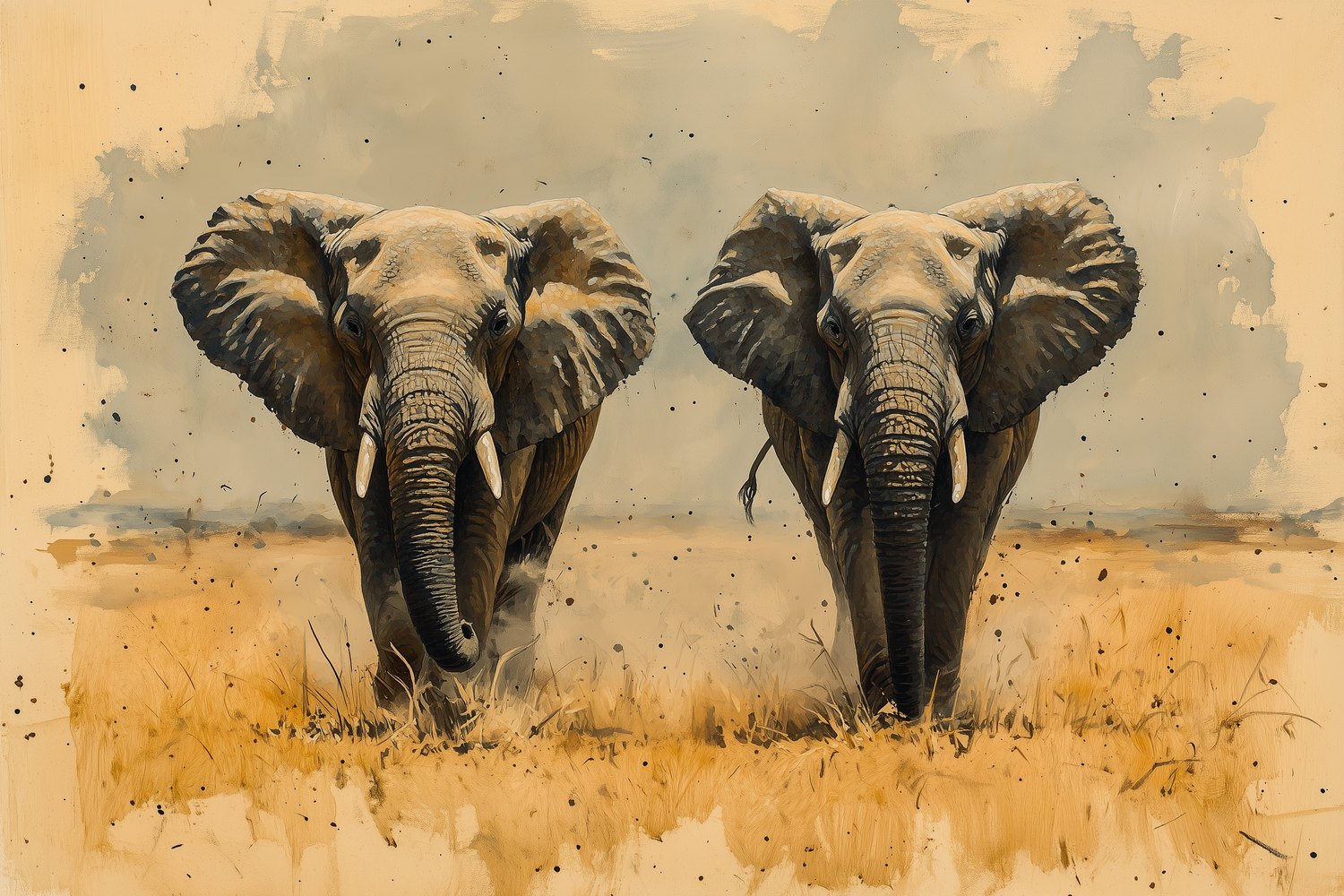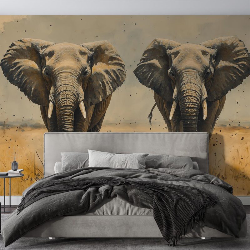 Zachte aarde tinten omarmen twee majestueuze olifanten die zij aan zij door een veld schrijden. Hun slurf reikt zachtjes vooruit, terwijl het realistische detail hun kracht en gratie viert. Deze serene scène brengt rust en natuurlijke harmonie in je interieur, en creëert een warme, tijdloze sfeer die zowel uitnodigt als inspireert.