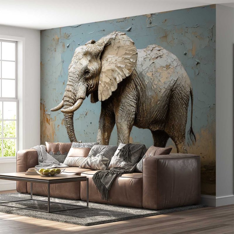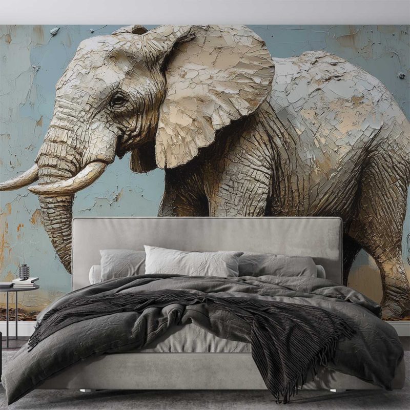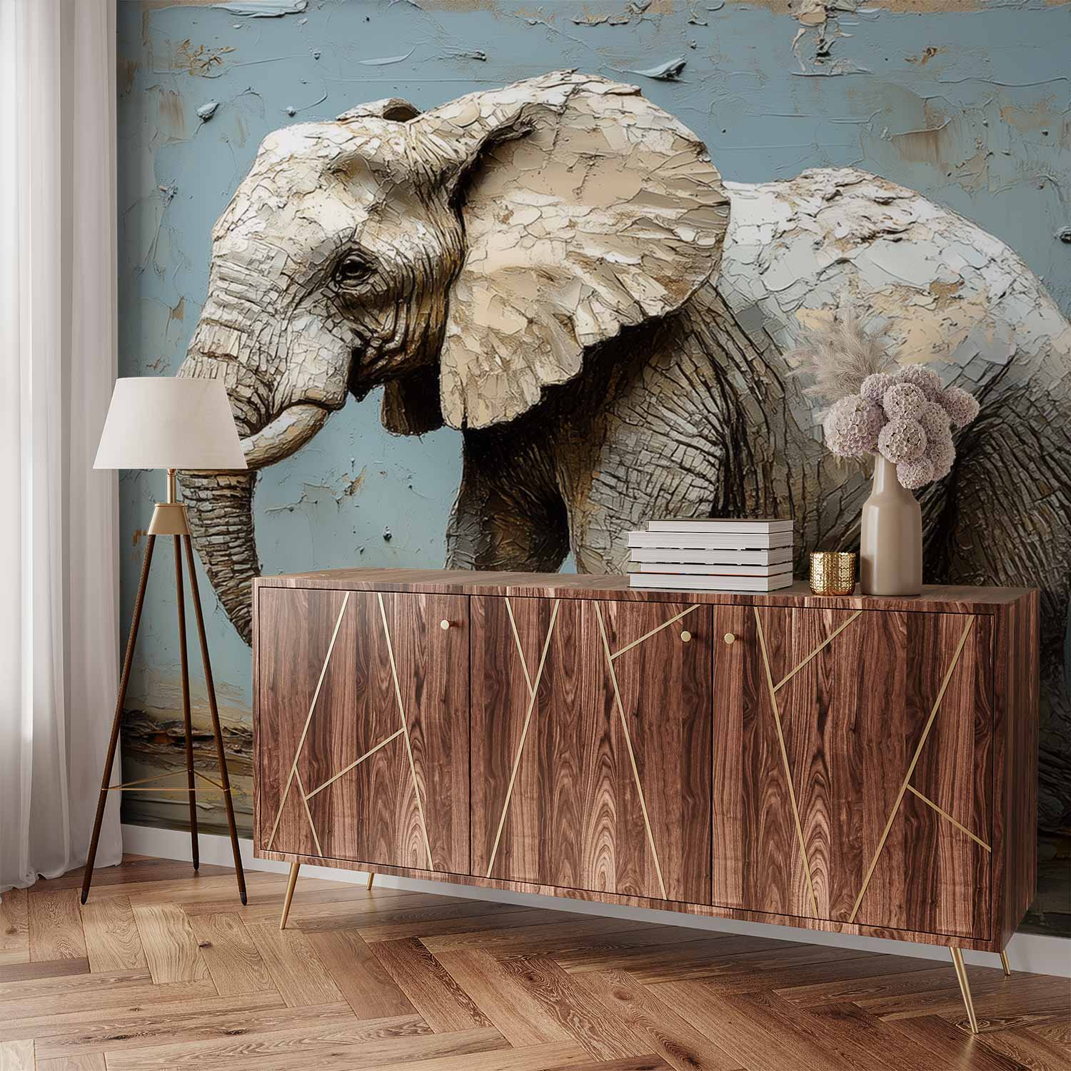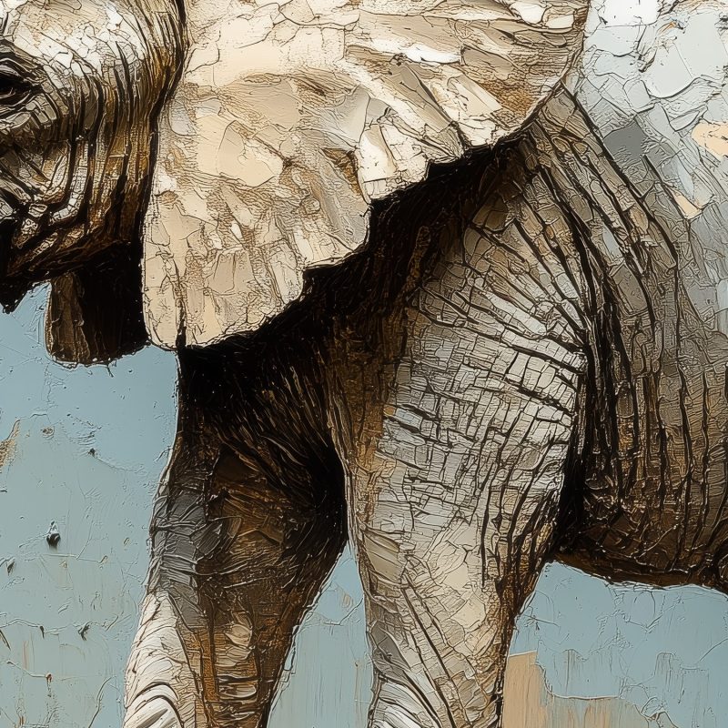 Verweerde blauwe tinten omhullen deze majestueuze olifant in een aangrijpend moment. Zijn vermoeide houding raakt direct, terwijl de textuur diepte en karakter toevoegt. Dit krachtige statement brengt een emotionele laag in je ruimte, ideaal voor een moderne woonkamer of studeerhoek waar kunst écht moet spreken.
