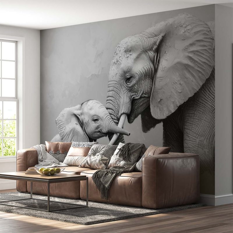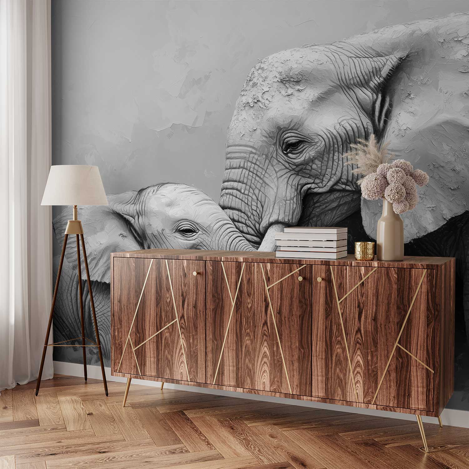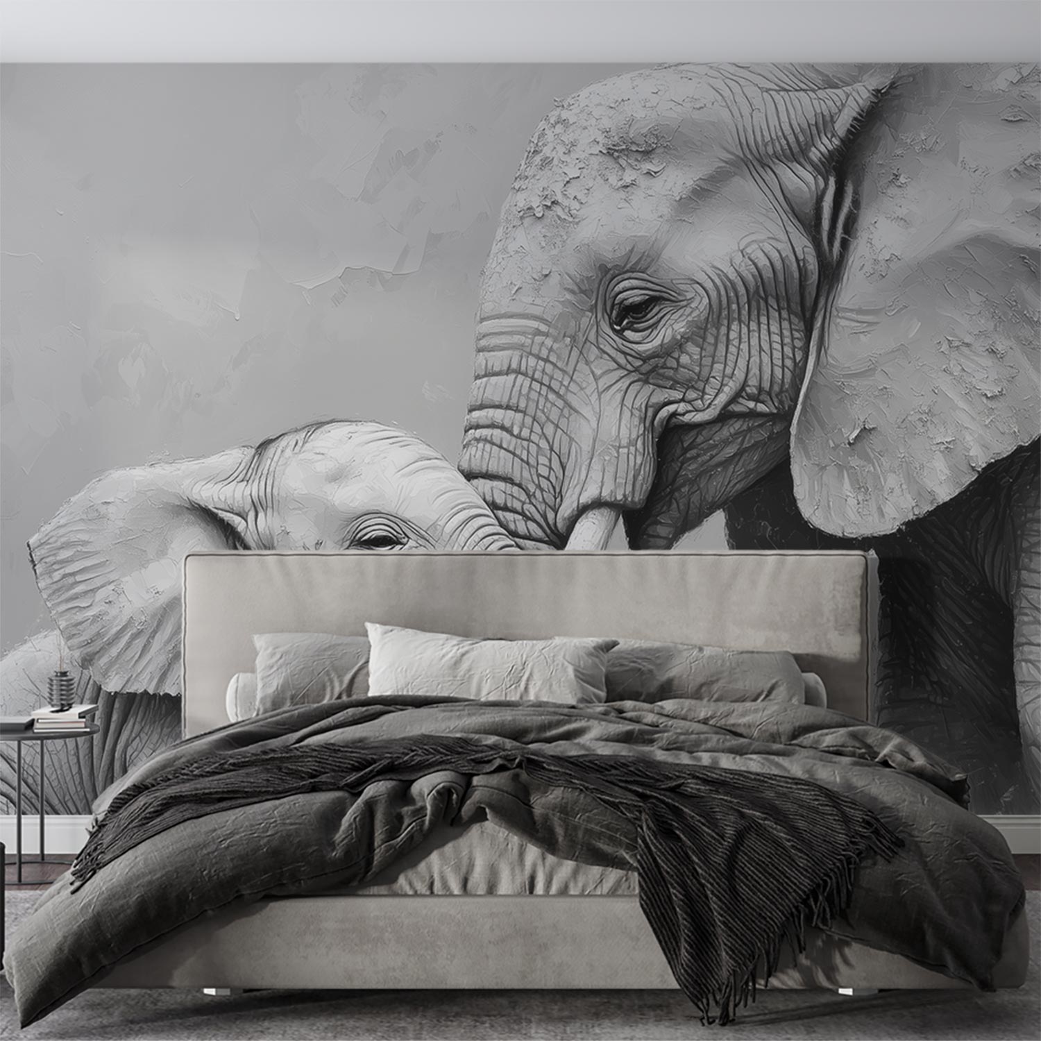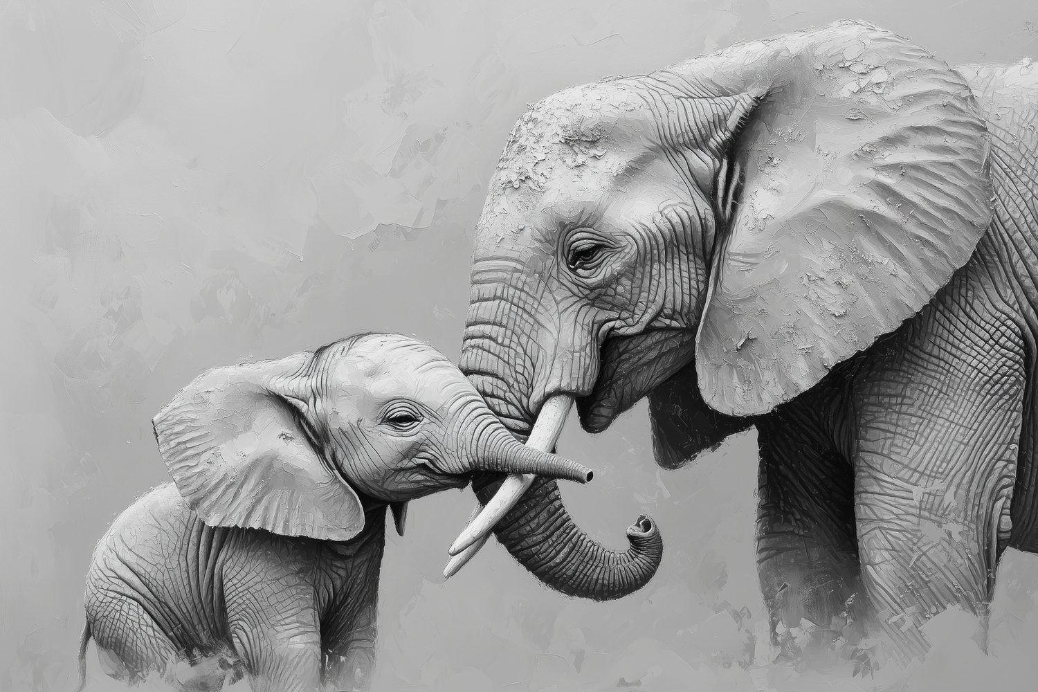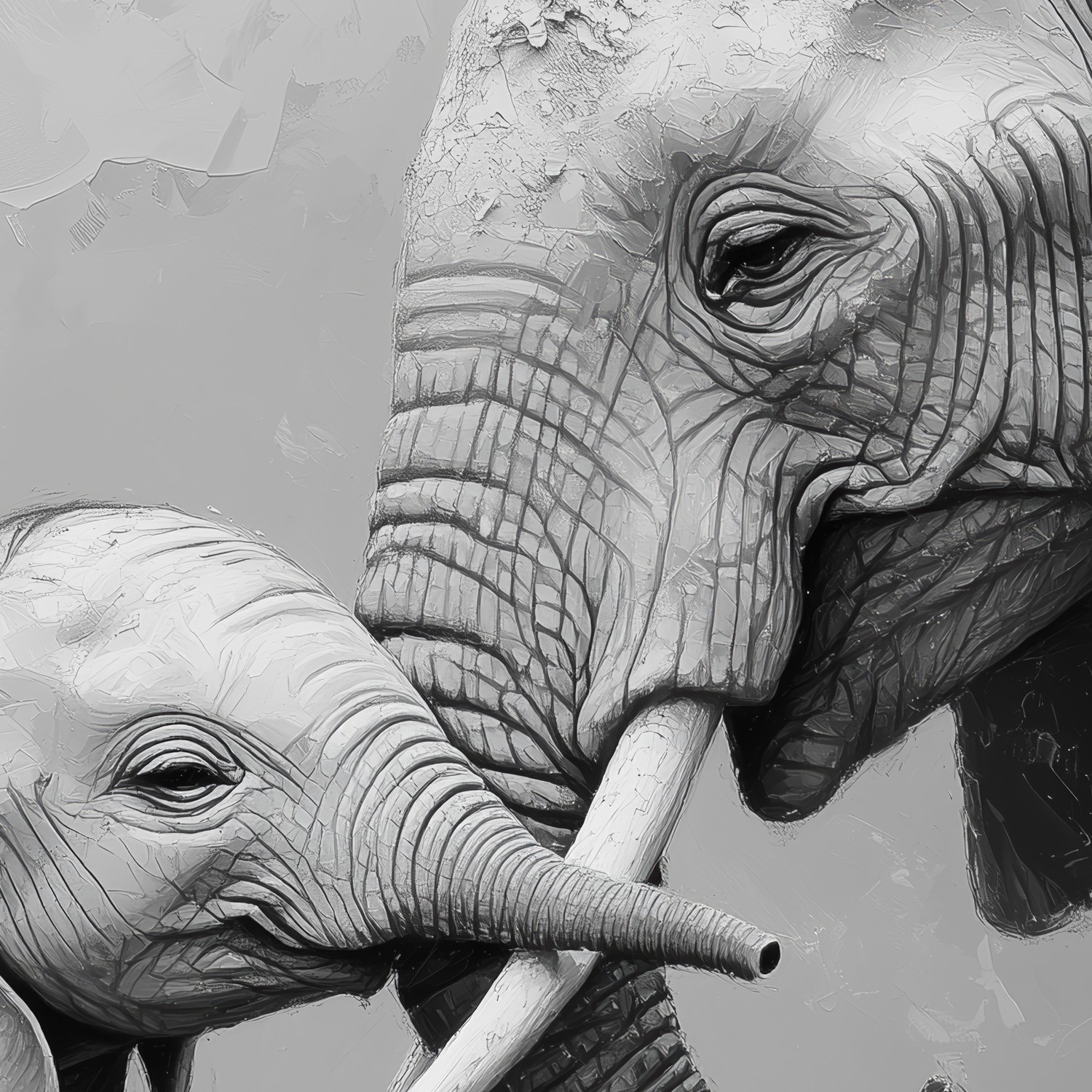 Ontroerend zwart-wit beeld van twee olifanten wiens slurfjes teder verstrengeld zijn. Hun diepe verbondenheid straalt een tijdloze warmte uit, terwijl de texturen en vormen levensecht lijken. Dit behang brengt een rustgevende, emotionele diepte in je interieur en vertelt een stil verhaal van onvoorwaardelijke liefde dat elke ruimte tot een thuis maakt.