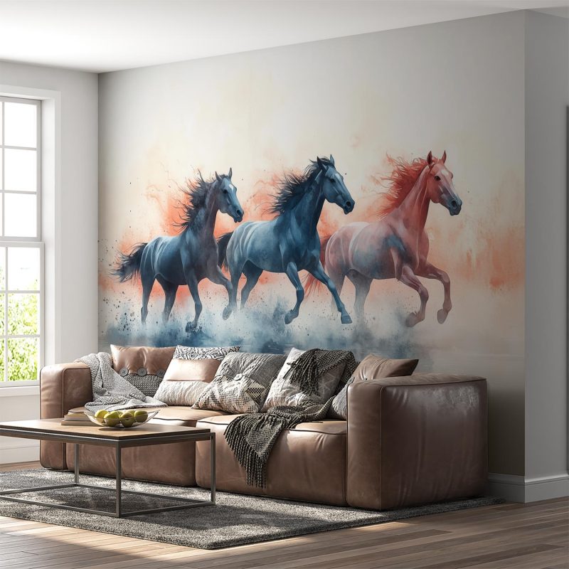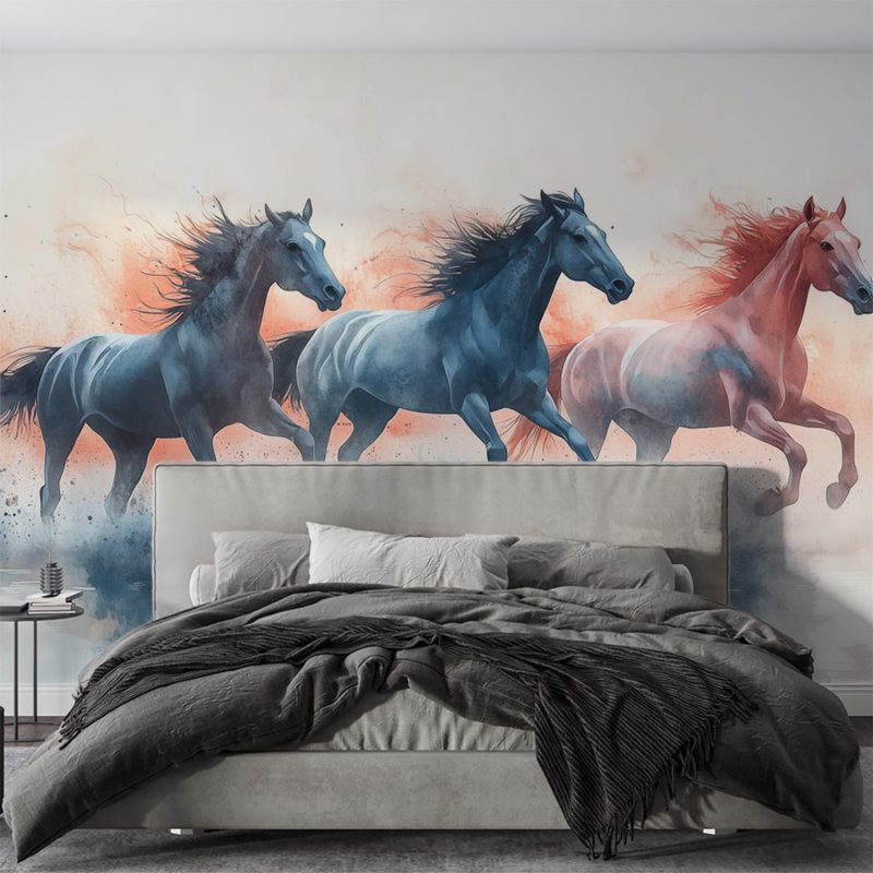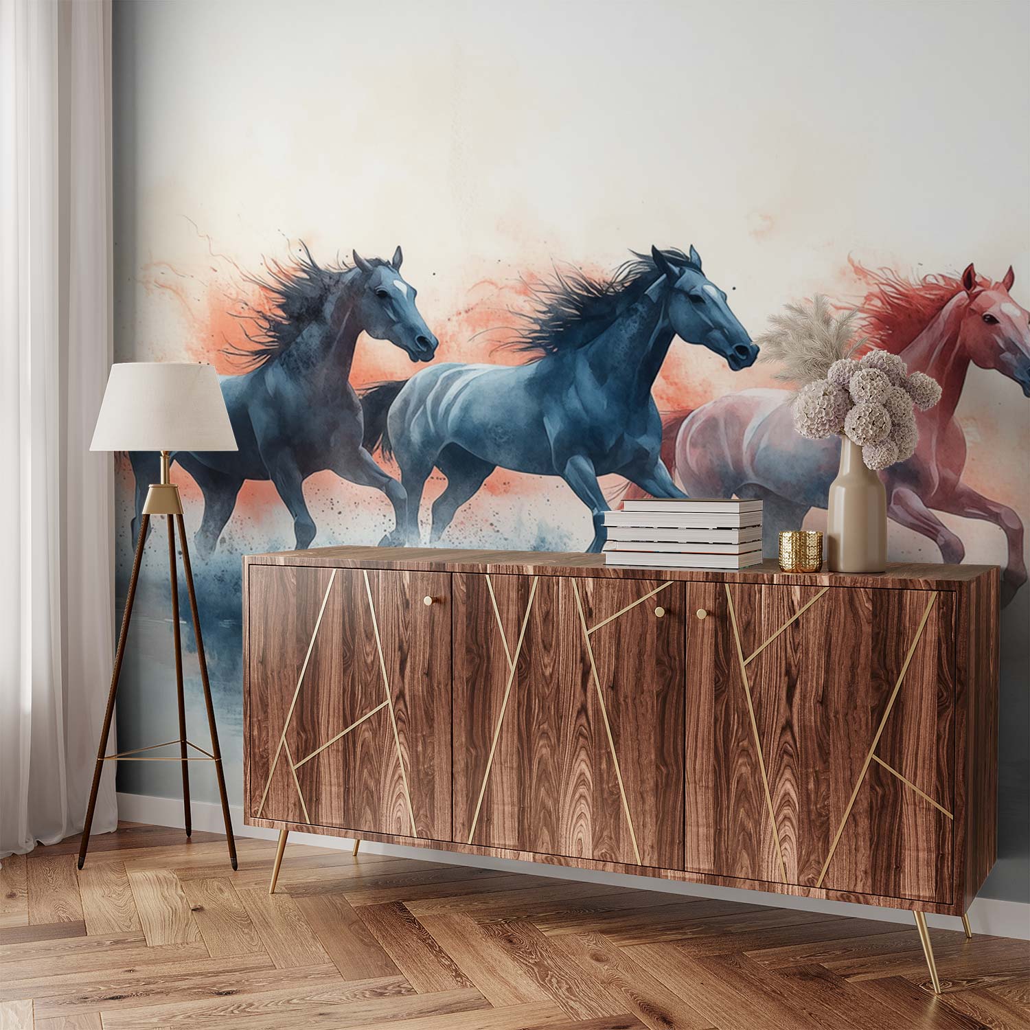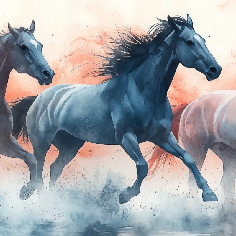 Vurige oranje en blauwe tinten omarmen drie paarden die dynamisch over het water galopperen. Bruine, grijze en zwarte vachten glanzen terwijl water opspat achter hun energieke beweging. Dit levendige tafereel brengt pure actie en emotie in je ruimte, perfect voor een statementmuur die elke kamer tot leven wekt met zijn onweerstaanbare energie en kleurrijke diepte.