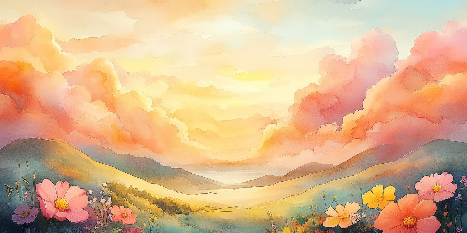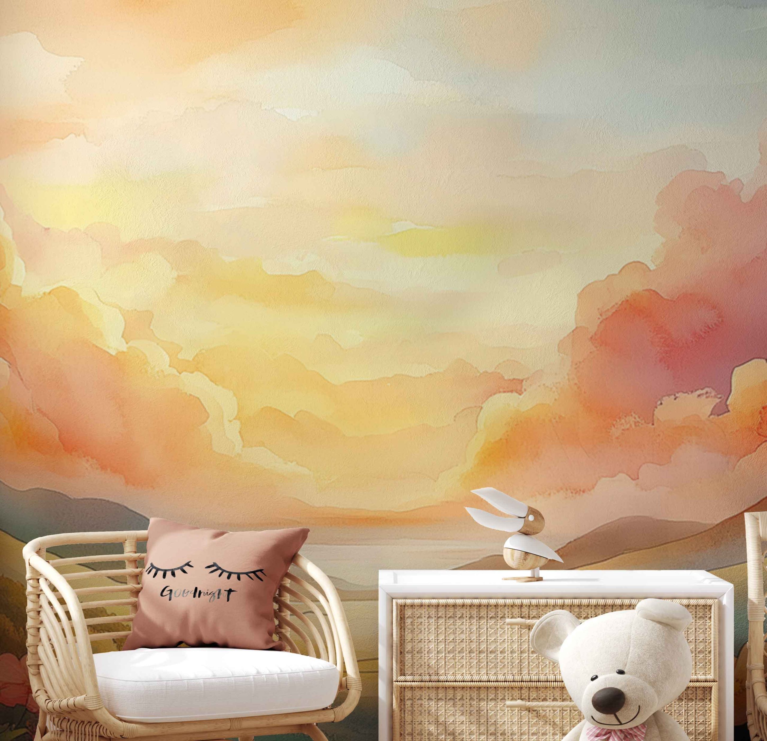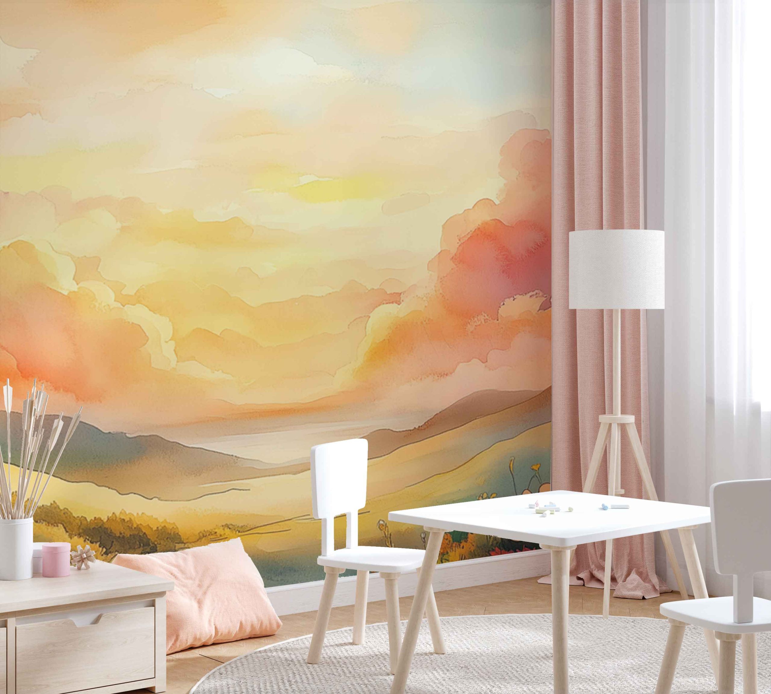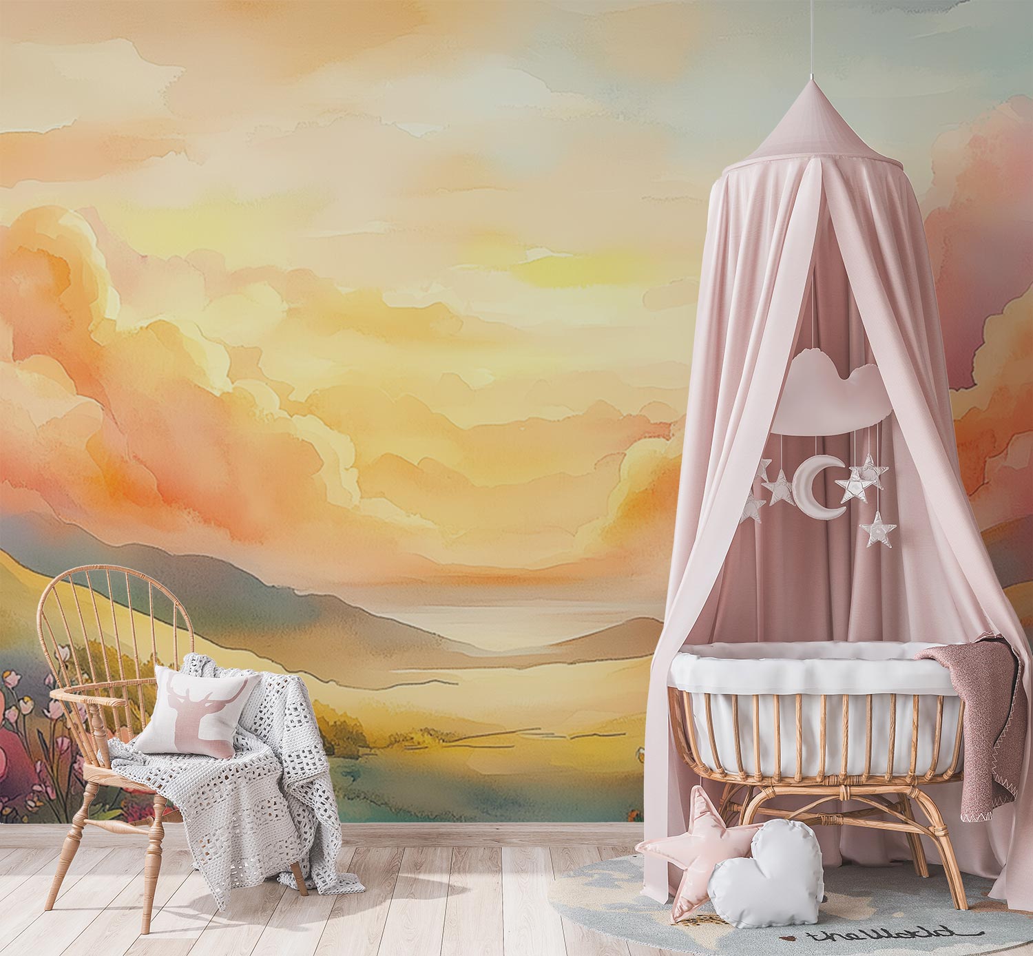 Betoverend kleurenpalet van oranje, roze en geel doordrenkt dit dromerige berglandschap. Bloemen dansen op de voorgrond terwijl wolkenflarden over de vallei zweven. Dit behang transformeert de kamer in een warm, vredig avonturenland waar kinderlijke fantasie tot leven komt – perfect voor dromen over verre reizen en magische ontdekkingen in eigen safe space.