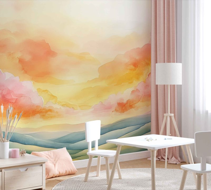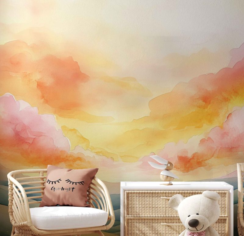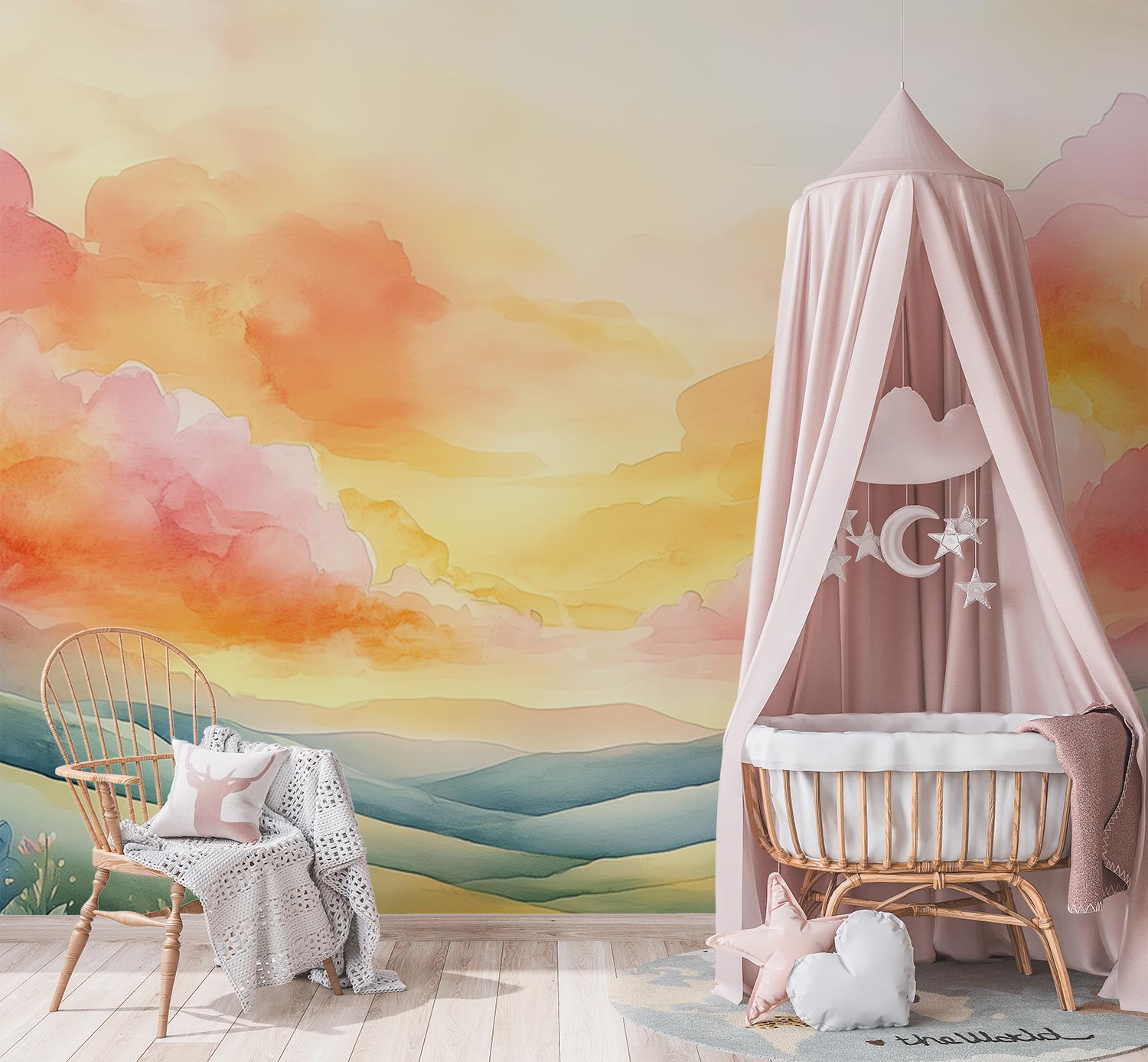 Betoverende oranje en roze wolken dansen over een zachtgele hemel, terwijl besneeuwde bergen in de verte toekijken. Dit levendige waterlandschap brengt magische beweging en warmte in de kamer, perfect om kleine dromers te omringen met rustgevende energie voor fantasievolle avonturen.