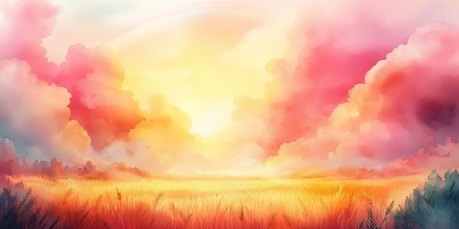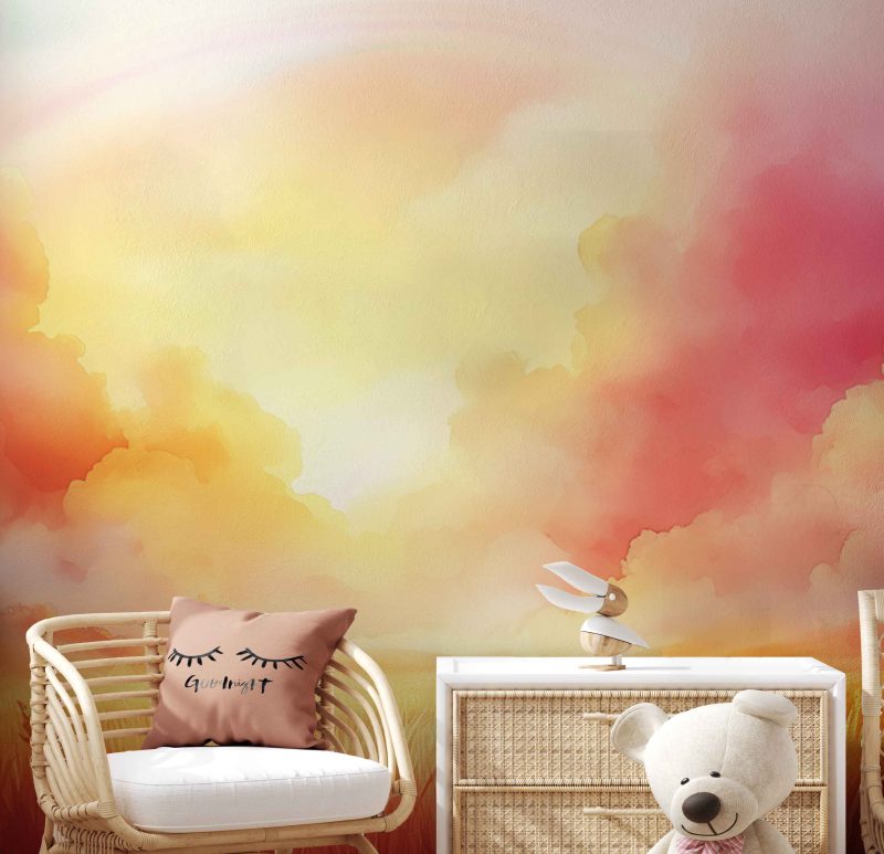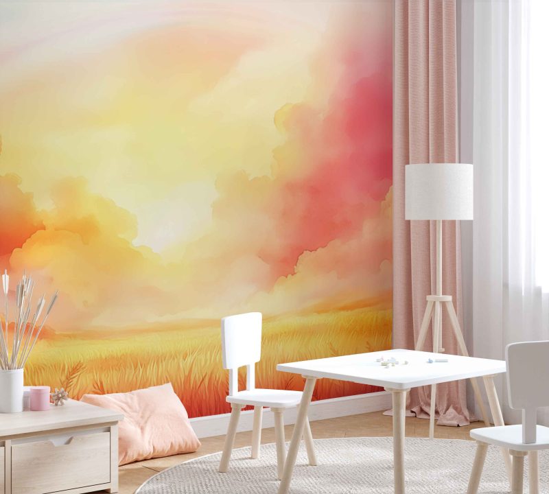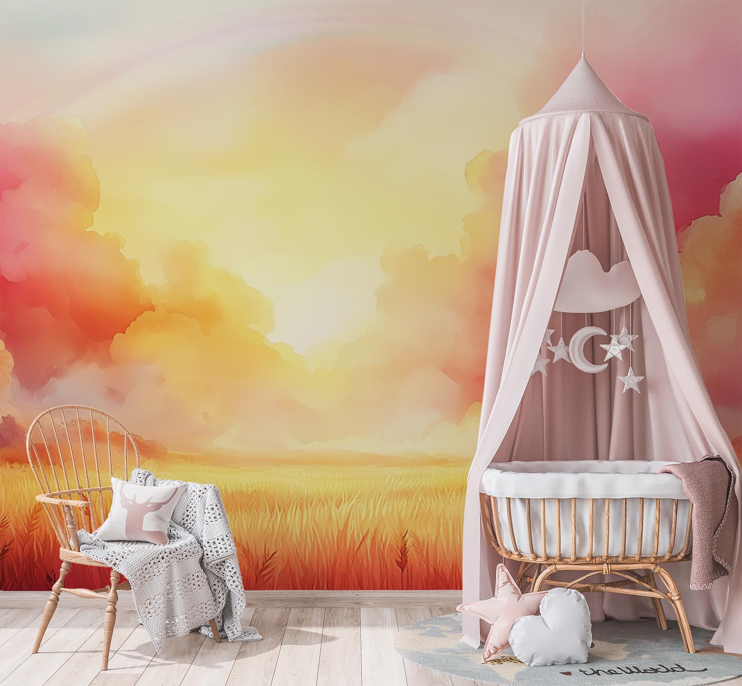 Zachte oranje en roze tinten dansen over de horizon terwijl het gouden avondlicht over het hoge gras strijkt. Pluizige wolken zweven door de lucht vol warme kleuren die een dromerige sfeer creëren. Dit rustgevende landschap brengt magische zonsondergangen de kinderkamer binnen en nodigt uit tot kalme momenten en zoete dromen.