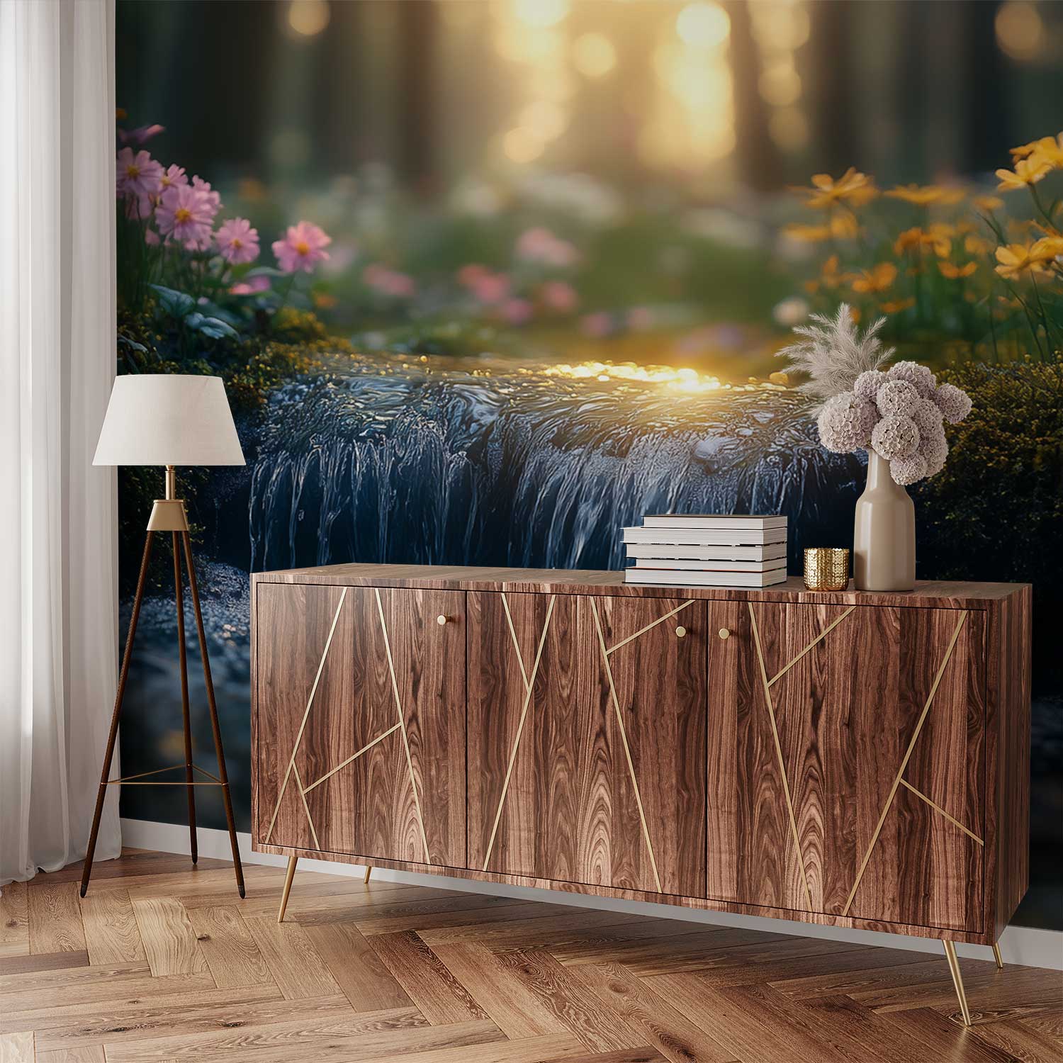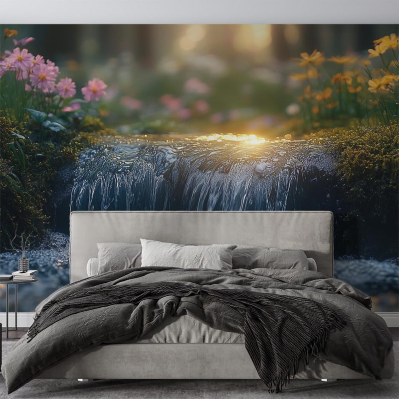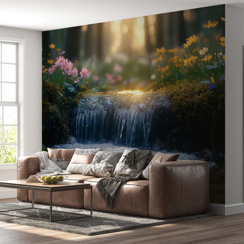 Zachte waterval danst over mosrijke rotsen, omringd door weelderig groen. Zonnestralen spelen door het lover en weerspiegelen in het kabbelende water. Frisse tinten groen en blauw worden opgefleurd met vrolijke gele en roze accenten. Deze levendige natuurscène brengt onmiddellijke rust en harmonie in je ruimte, alsof je elk moment kunt stappen in dit vredige bosparadijs. Perfect om dagelijkse stress te verdrijven.