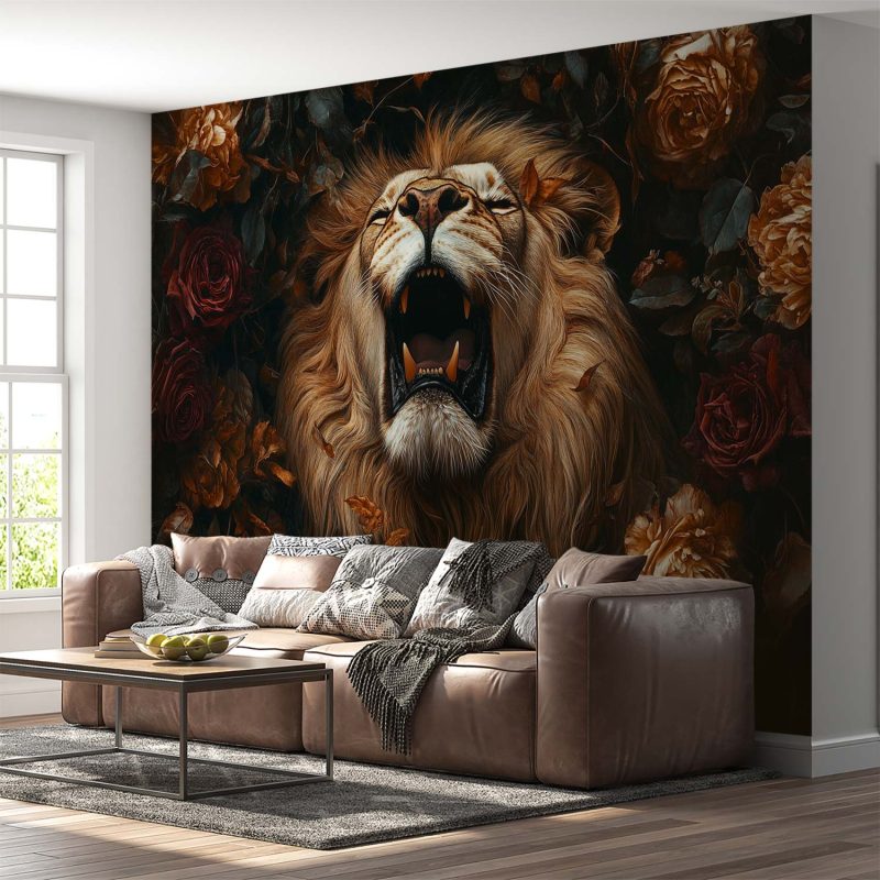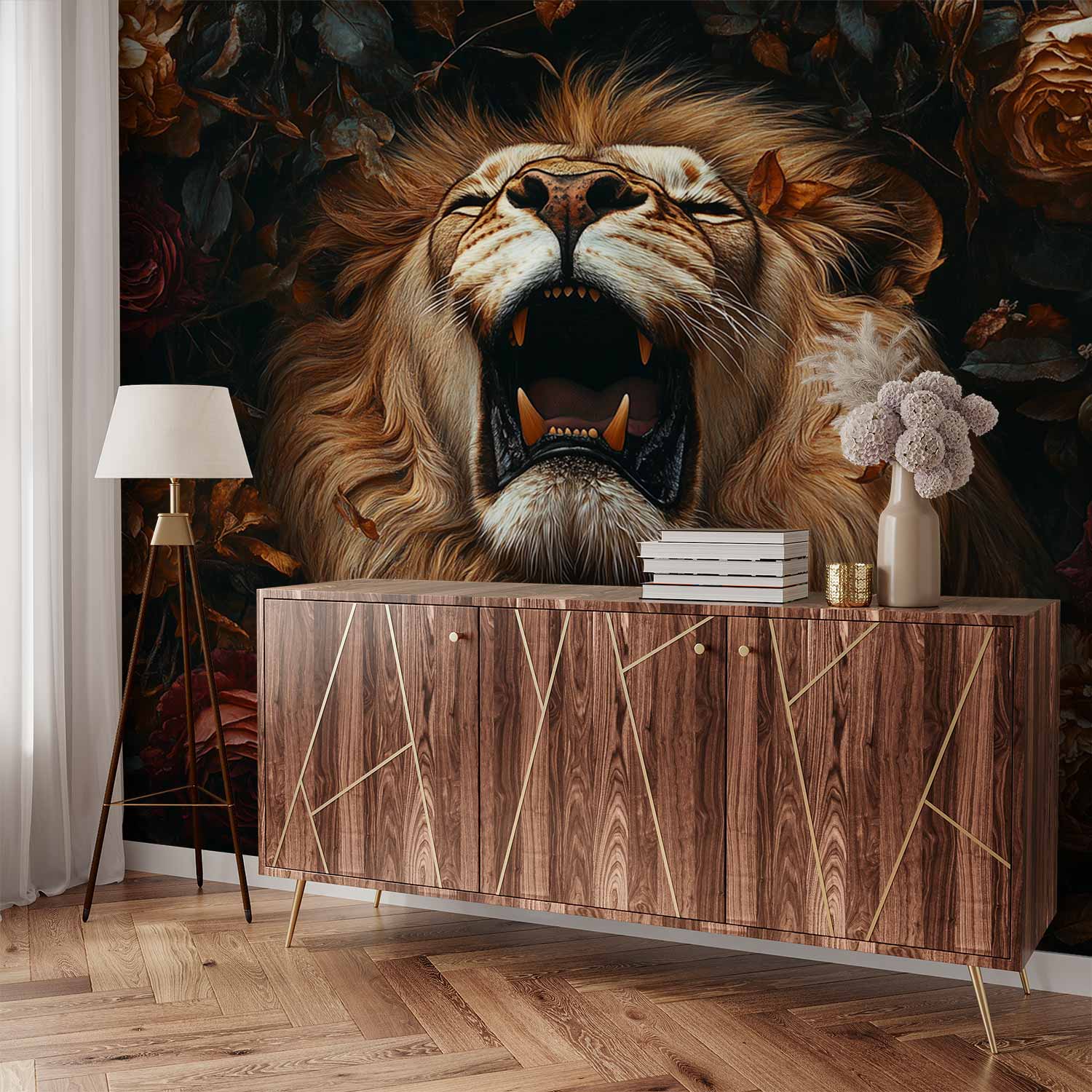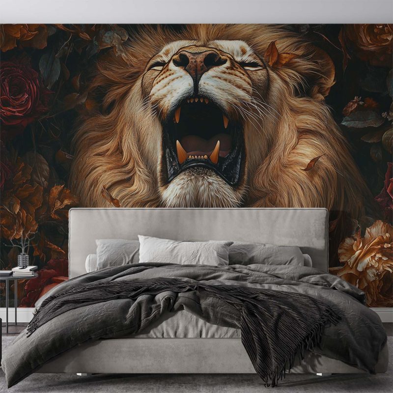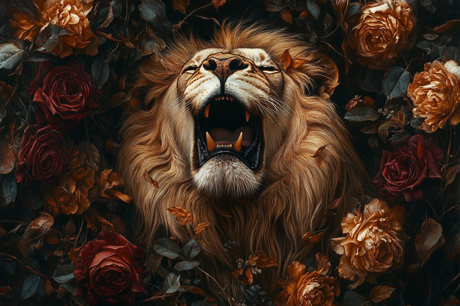 Ontwaakt in warme tinten van oranje en bruin, sluimert deze majestueuze leeuw te midden van een weelderige bloemenzee. Zijn gesloten ogen en geopende muil stralen rust uit, omringd door levendige rode rozen en groene bladeren. Brengt harmonie en sereniteit in elke ruimte, perfect voor een rustgevende woon of slaapkamer.