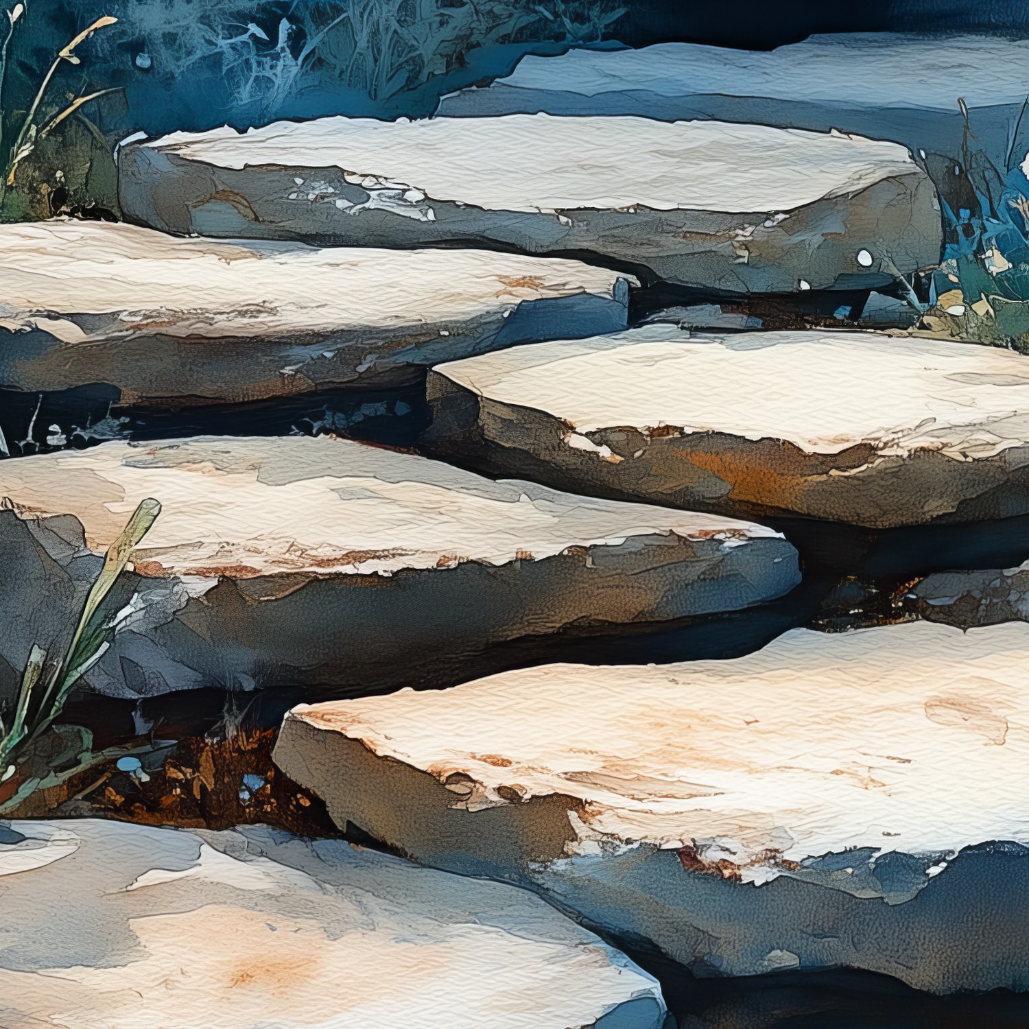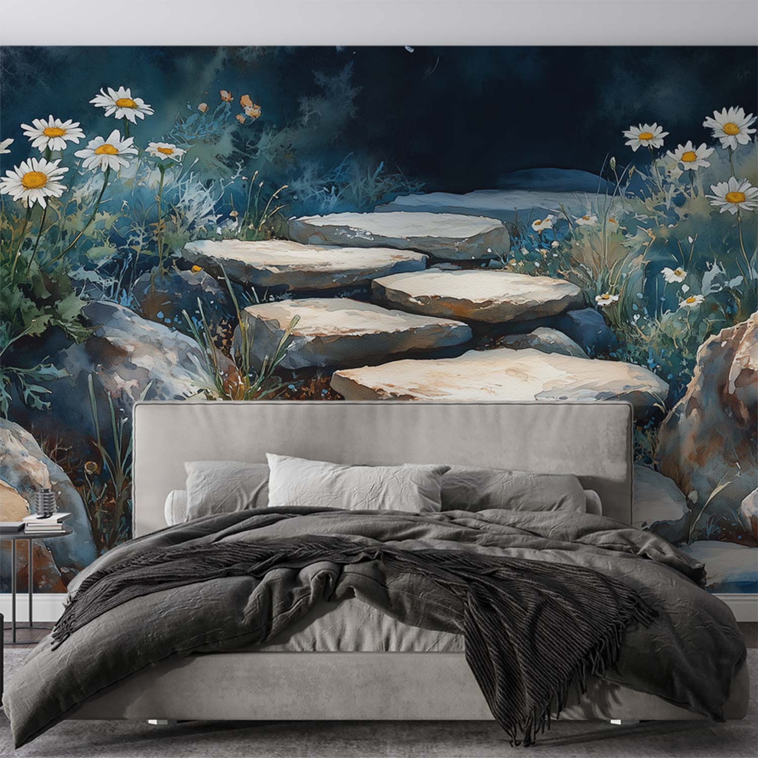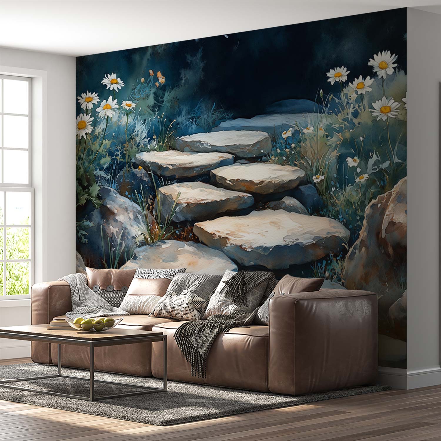 Zachte waterverfkleuren van groen, blauw en wit laten een stenen pad slingeren tussen wilde madeliefjes. Dit levendige tuintafereel ademt pure rust en brengt de harmonie van de natuur naar binnen. Ideaal om elke ruimte te voorzien van een kalmerende, organische sfeer die zowel verfrist als ontspant.