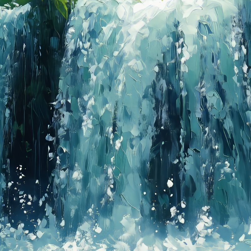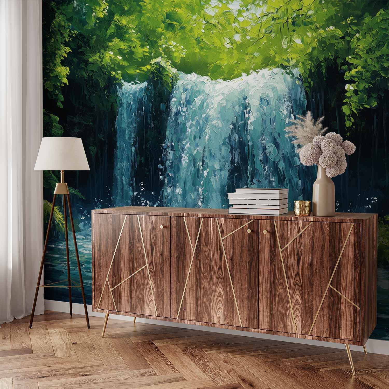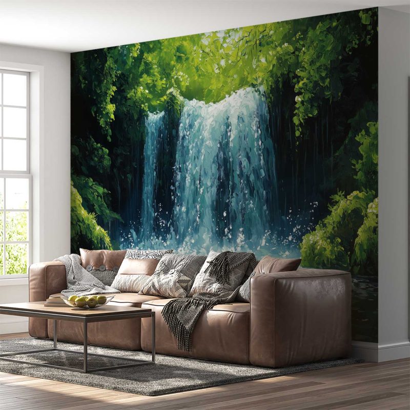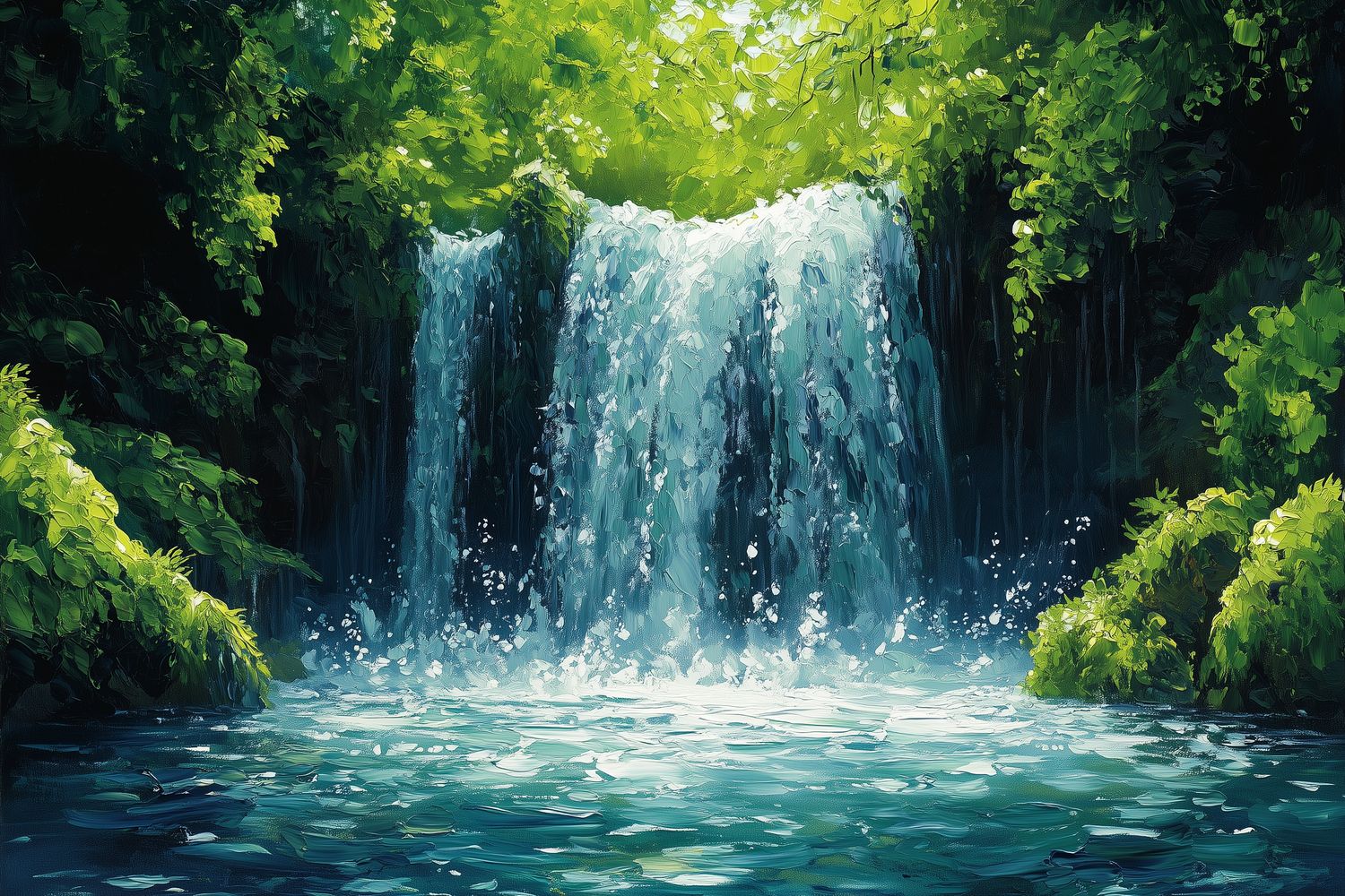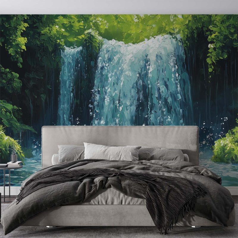 Mistig water stort zich krachtig naar beneden tussen weelderig groen gebladerte. Frisse tinten blauw en groen dansen over het doek en brengen de levendige energie van de waterval je interieur binnen. Deze rustgevende scène transformeert elke ruimte tot een oase van natuurlijke sereniteit, waar de harmonie van het landschap zorgt voor een altijd kalmerende sfeer.