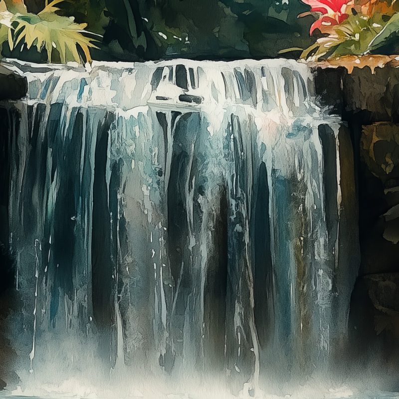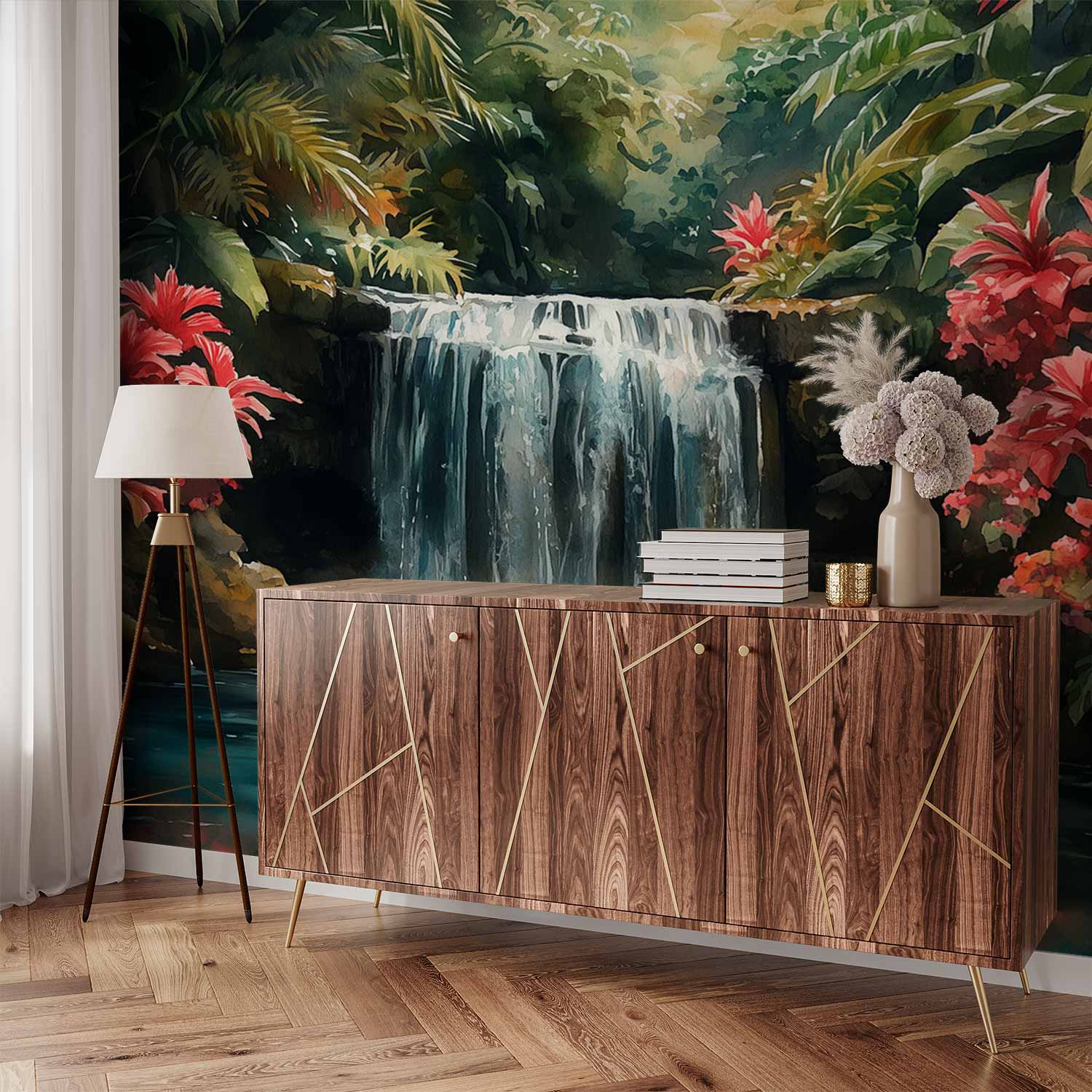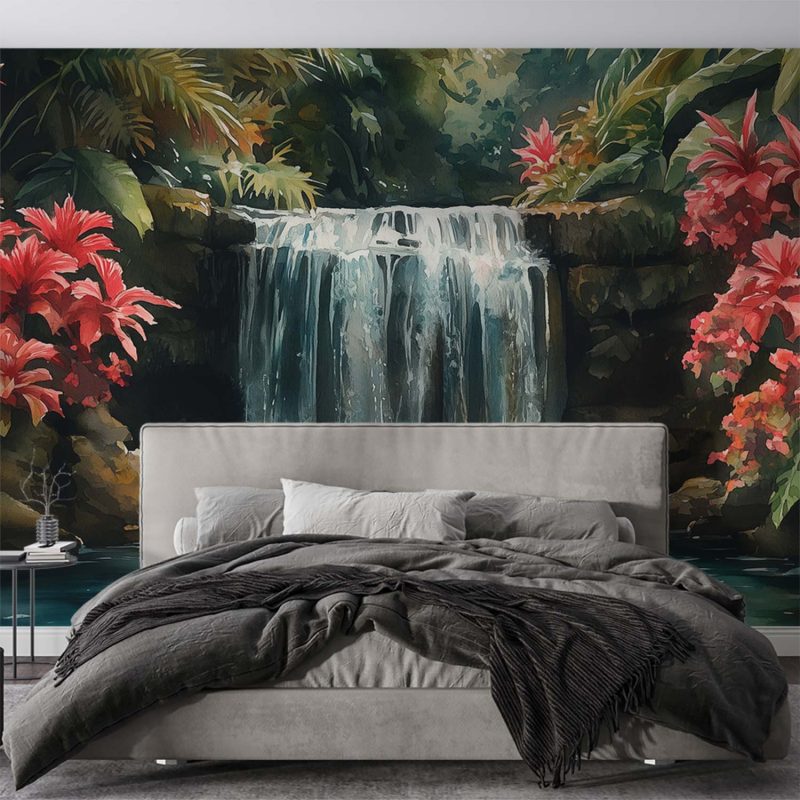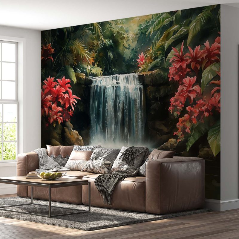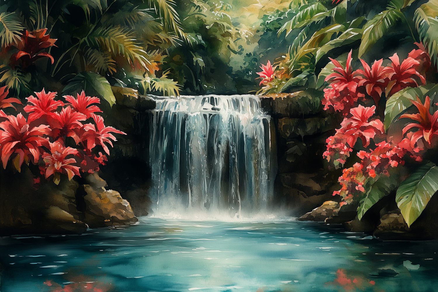 Verfrissende waterval stroomt levendig tussen weelderig groen en vlammende rode bloemen. Spiegelend water vangt de omringende natuur in een harmonie van blauw en groen. Dit realistische tafereel ademt pure rust en verbinding met de natuur. Breng deze serene sfeer in huis voor een altijd ontspannen gevoel van natuurlijke schoonheid.