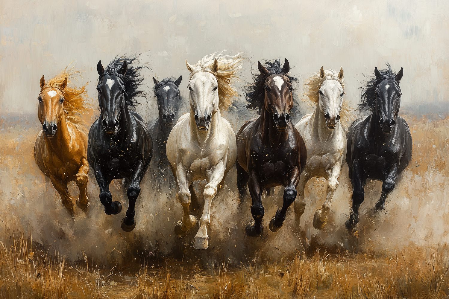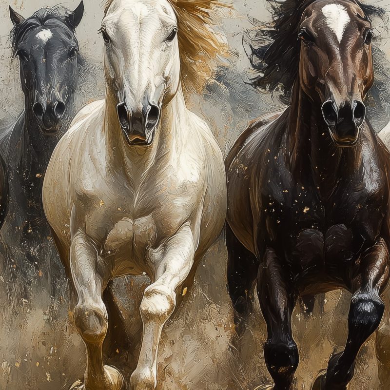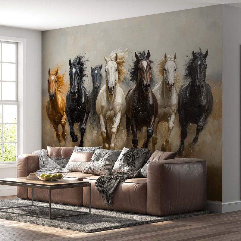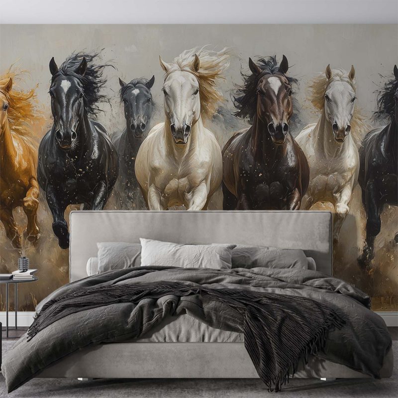 Vlammend van energie galopperen bonte paarden door het hoge gras. Hun manen wapperen in de wind, een werveling van bruin, zwart en wit. Dit levendige tafereel brengt pure dynamiek en vreugde in je ruimte. De realistische stijl en meeslepende beweging creëren een gevoel van vrijheid en ruimte, perfect om elke muur tot leven te wekken met ongedwongen elegantie.