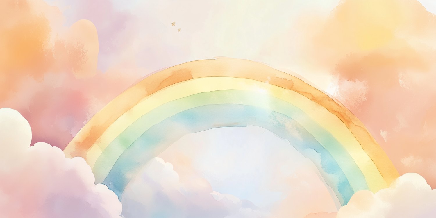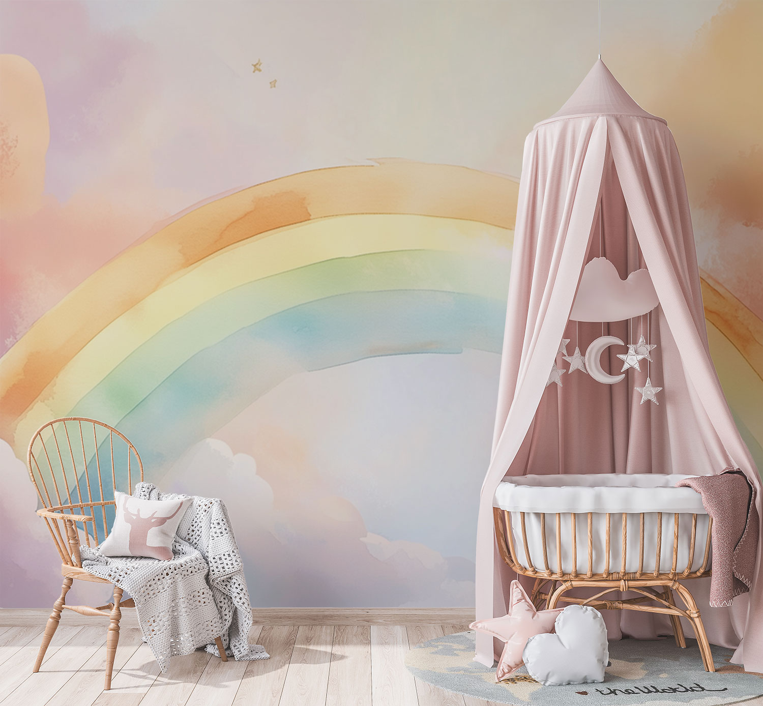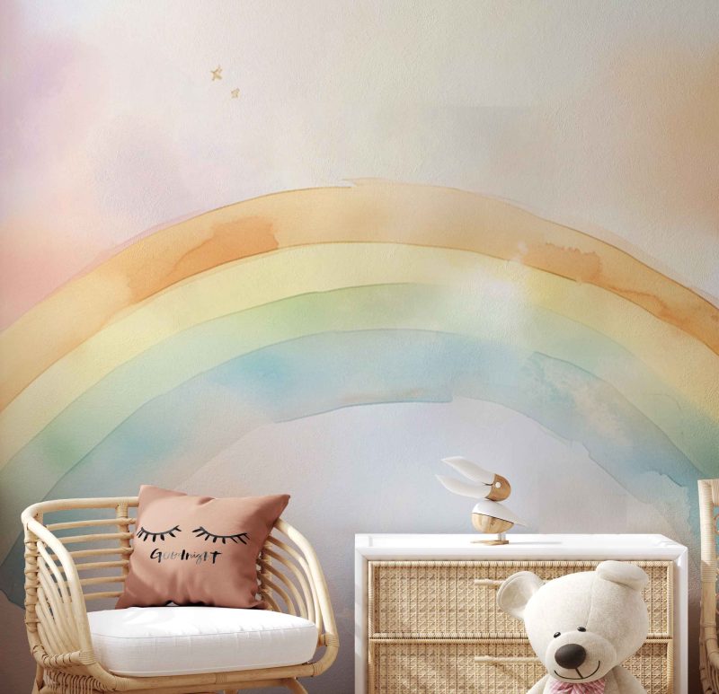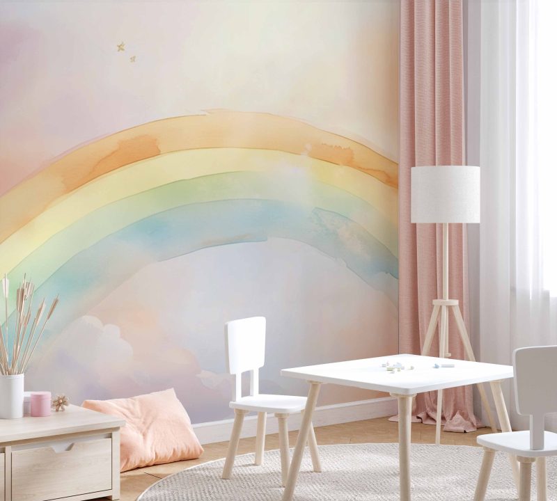 Dansende pastelkleuren wervelen over de muren terwijl een vrolijke regenboog zich sierlijk tussen pluizige wolken kronkelt. Deze dromerige scène brengt magie en warmte in de kamer, perfect om de fantasie van je kleintje te prikkelen en een rustige, vrolijke sfeer te creëren waar dromen tot leven komen.