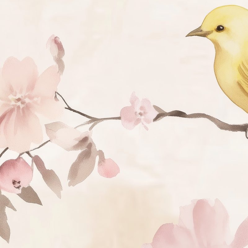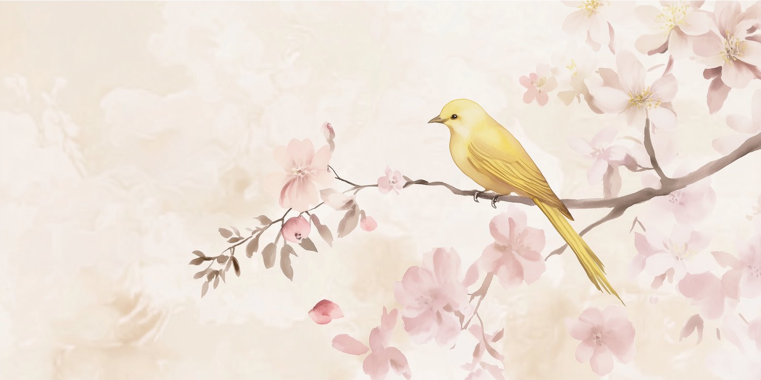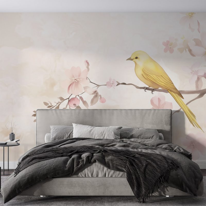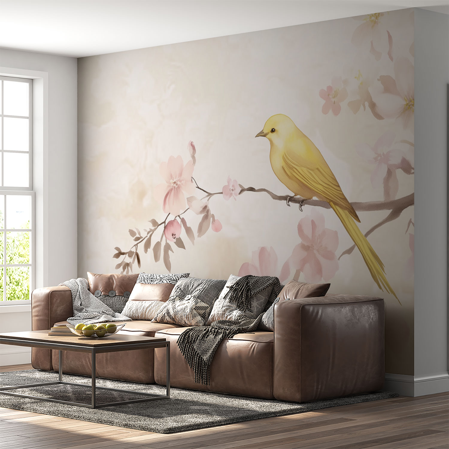 Een vrolijke gele vogel fladdert zachtjes tussen roze bloesemtakken. Zijn veren lichten op tegen de zachte roze achtergrond, een harmonieus tafereel vol rust en sereniteit. Dit behang brengt de zachte energie van de natuur naar binnen en creëert een kalme, levendige sfeer in elke ruimte. Perfect voor wie verlangt naar een vleugje vrolijke stilte in het interieur.