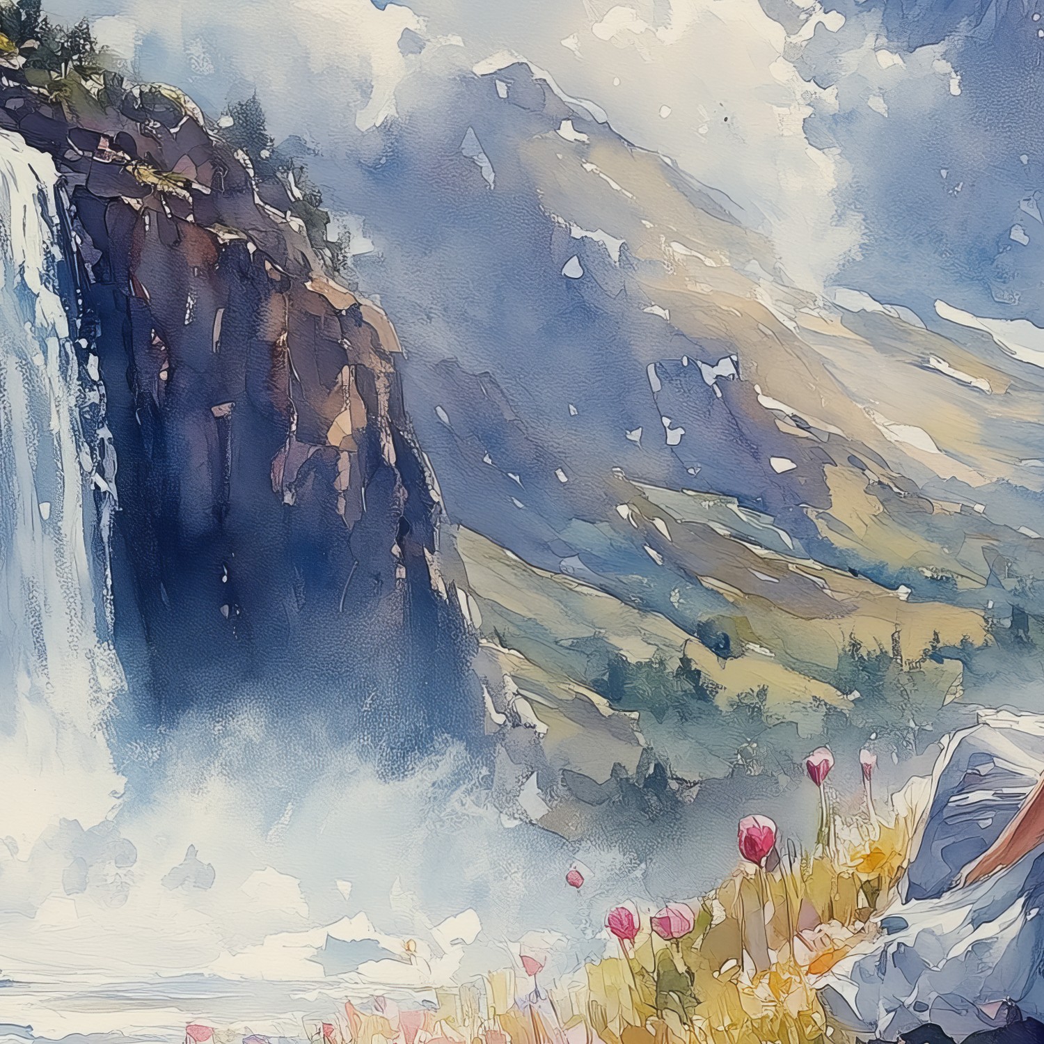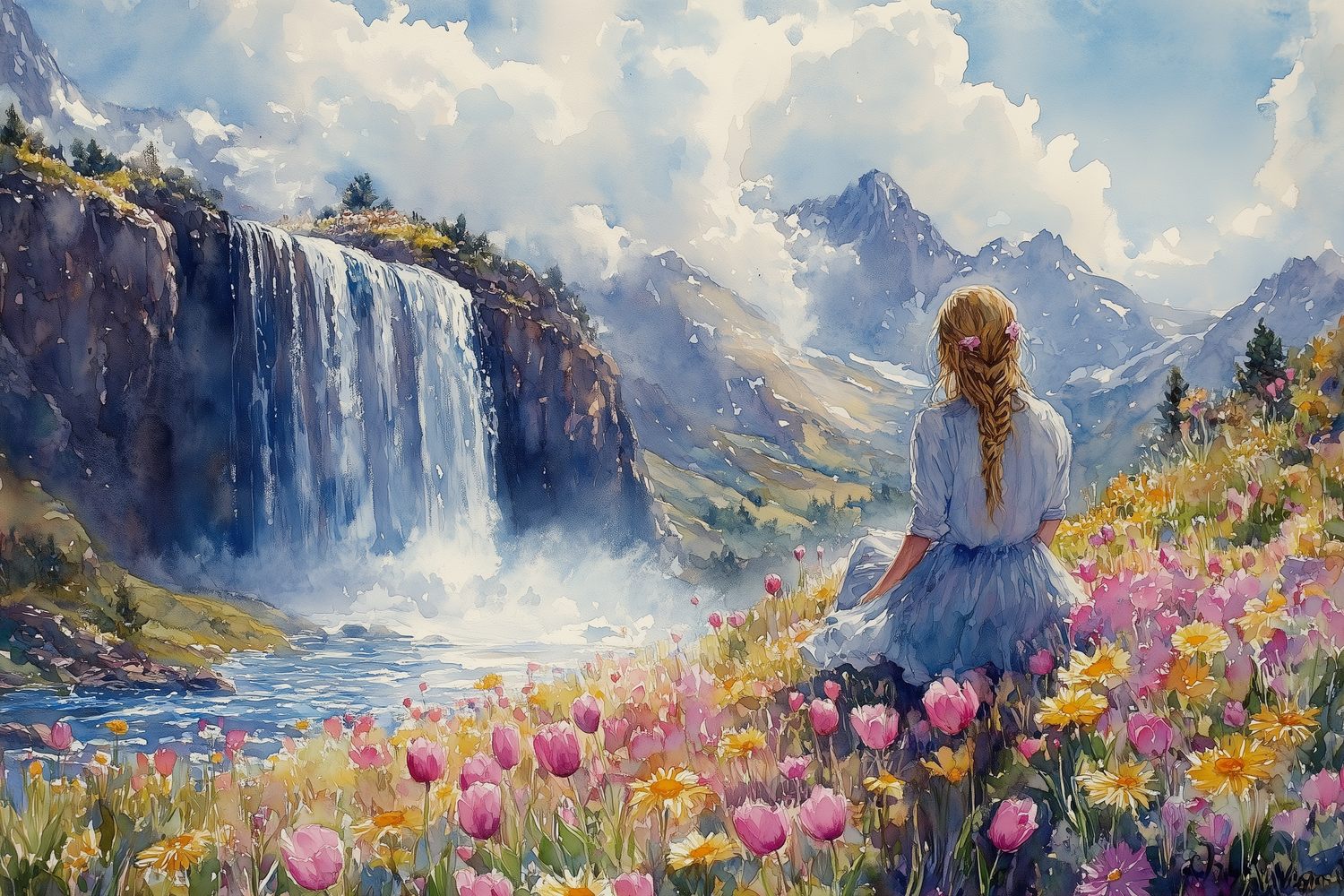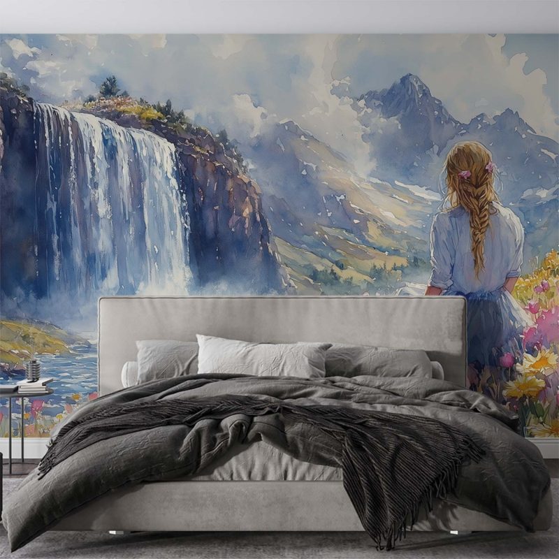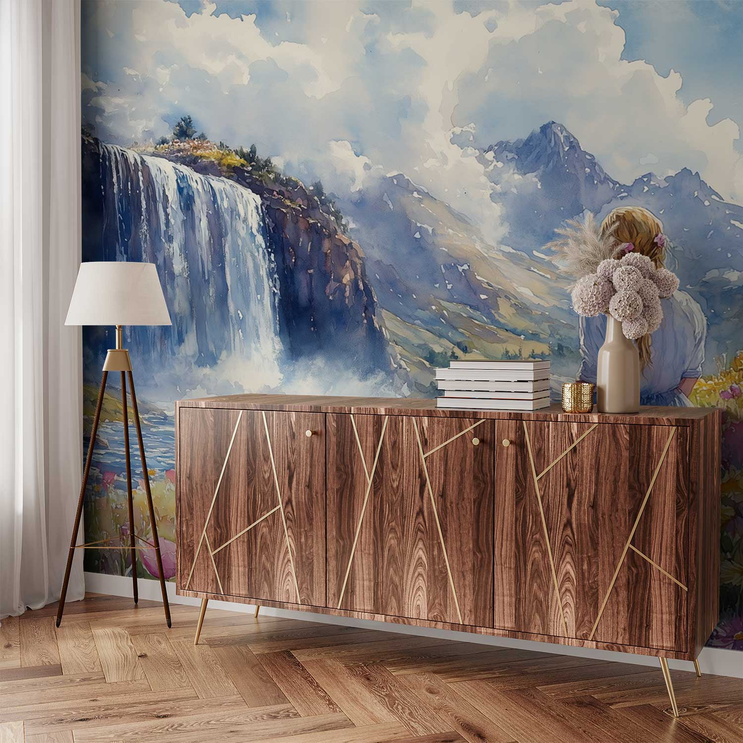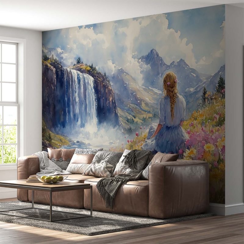 Zachte waterverfkleuren dansen over de muur. Een vrouw mijmert tussen bloemenweelde bij een kabbelende waterval. Frisse tinten blauw en groen omarmen zachtroze bloemen, waardoor een serene sfeer ontstaat. Dit behang brengt natuurrust binnen, perfect voor een kalme leefruimte waar je even kunt ontsnappen aan de dagelijkse drukte.