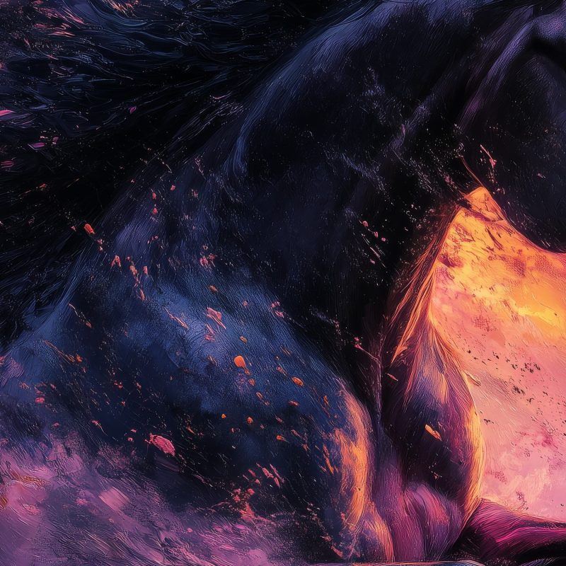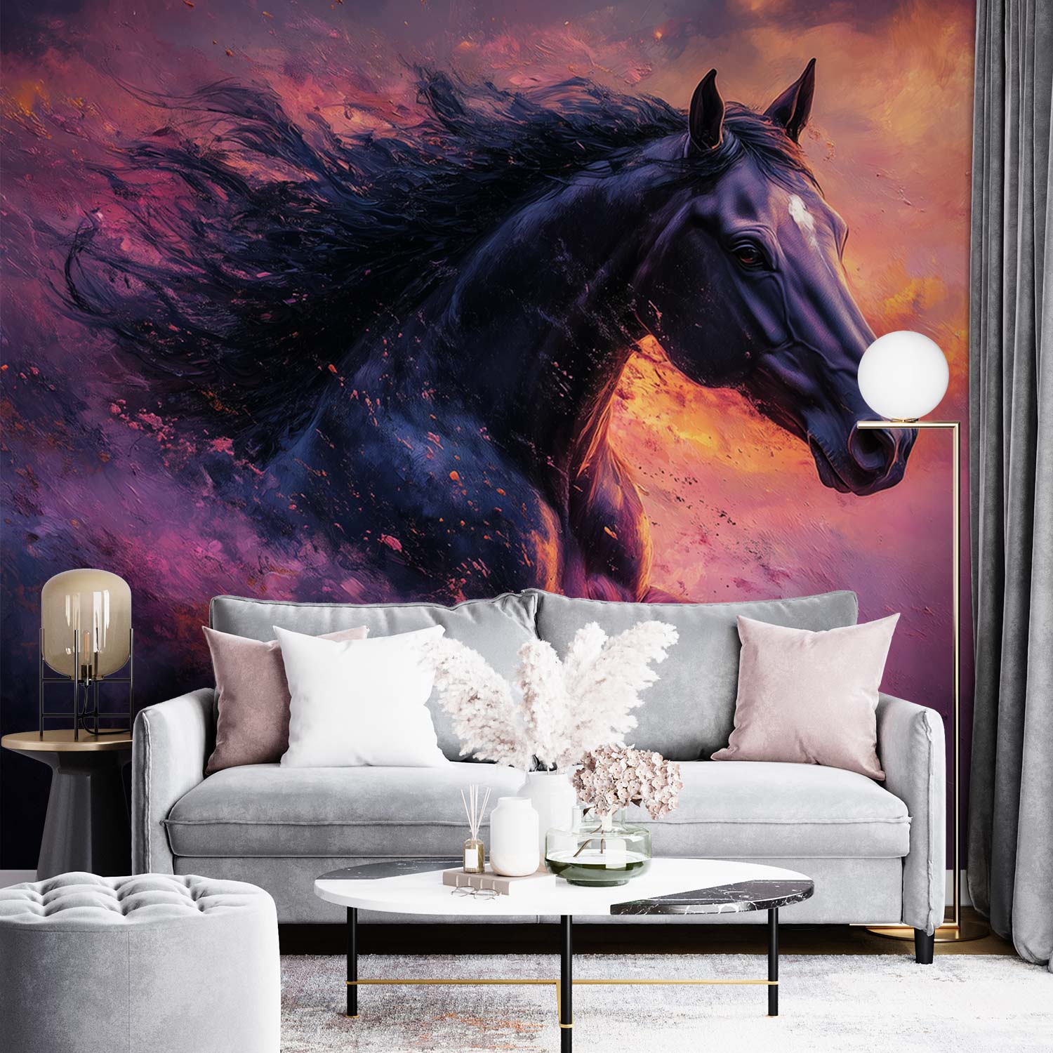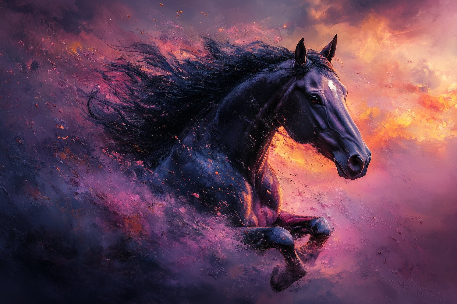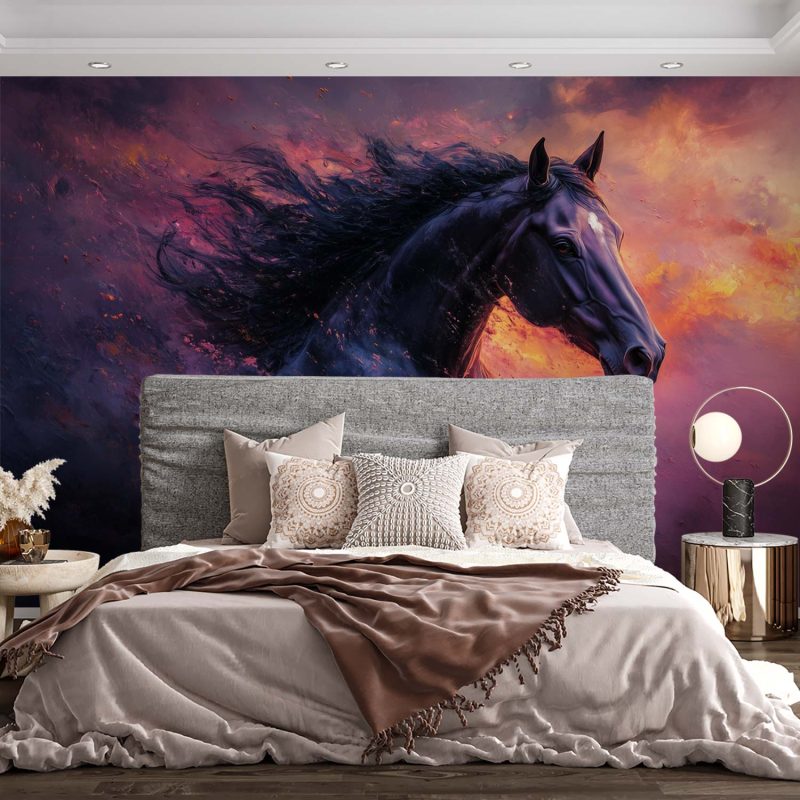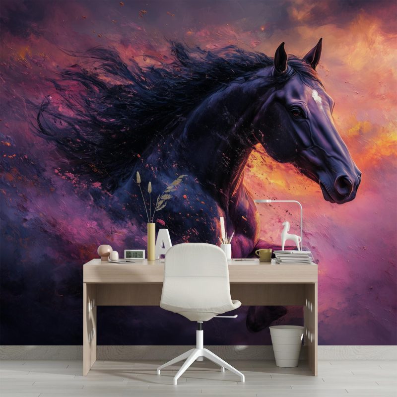 Vurige tinten dansen rond een zwart paard in volle galop. Levendige purperen, oranje en roze tinten wervelen in een wervelwind van energie. Dit krachtige tafereel brengt dynamiek en passie in elke ruimte. De meeslepende beweging en intense sfeer transformeren je muur tot een kunstwerk vol emotie. Perfect voor wie verlangt naar een interieur met karakter en levenskracht.