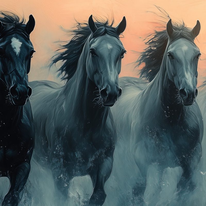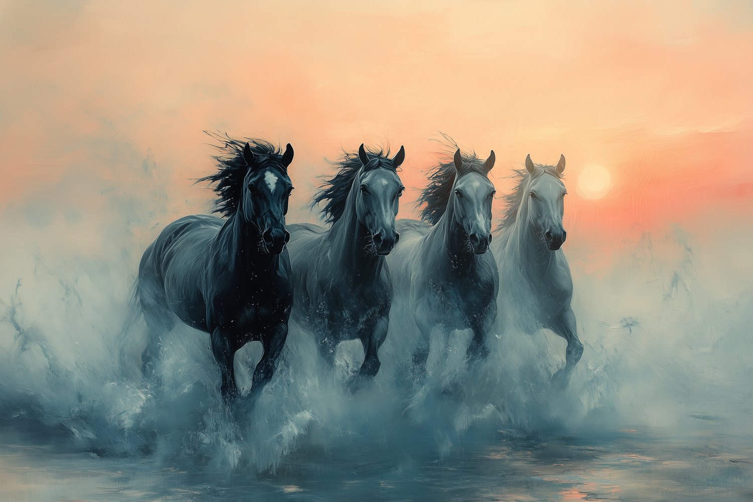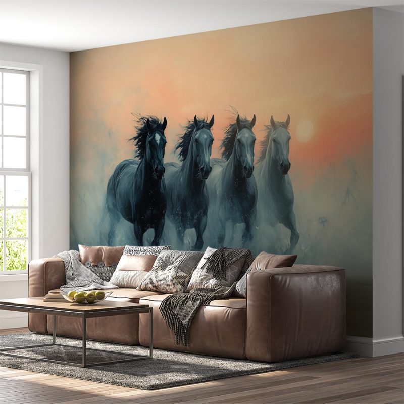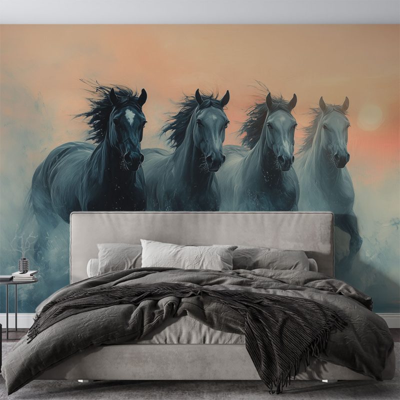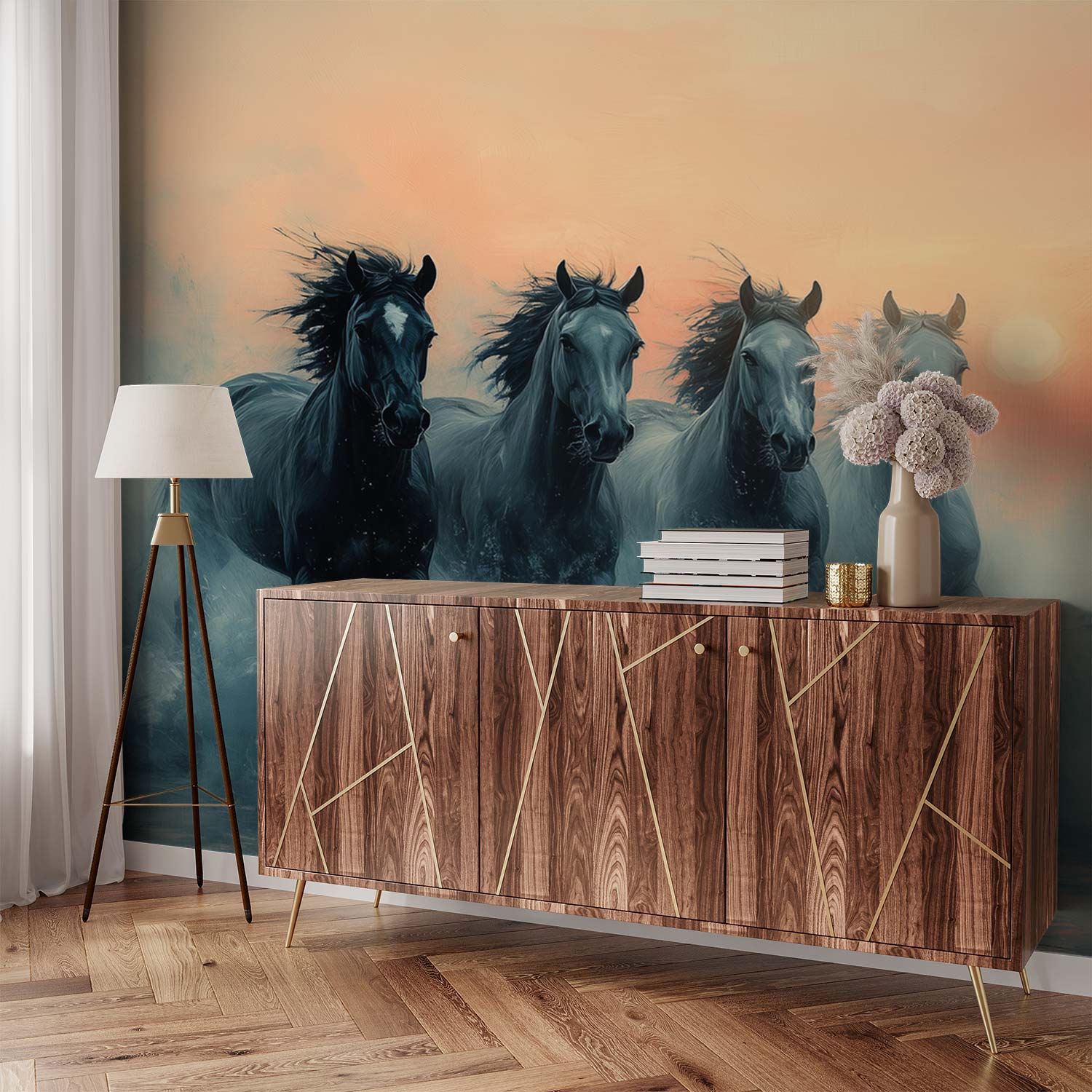 Vurige oranje en roze luchten omhullen vier zwarte paarden die vol overgave over het water galopperen. Hun dynamische beweging straalt pure energie en vrijheid uit. Dit levendige behang brengt een gevoel van avontuur en passie in je interieur, perfect voor wie houdt van een statement met warme, meeslepende sfeer.