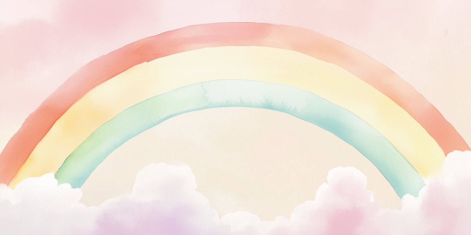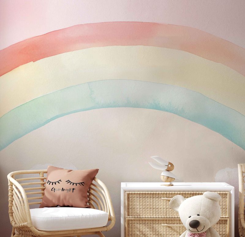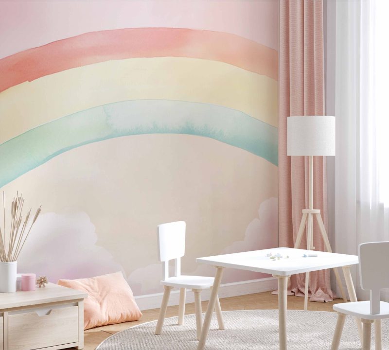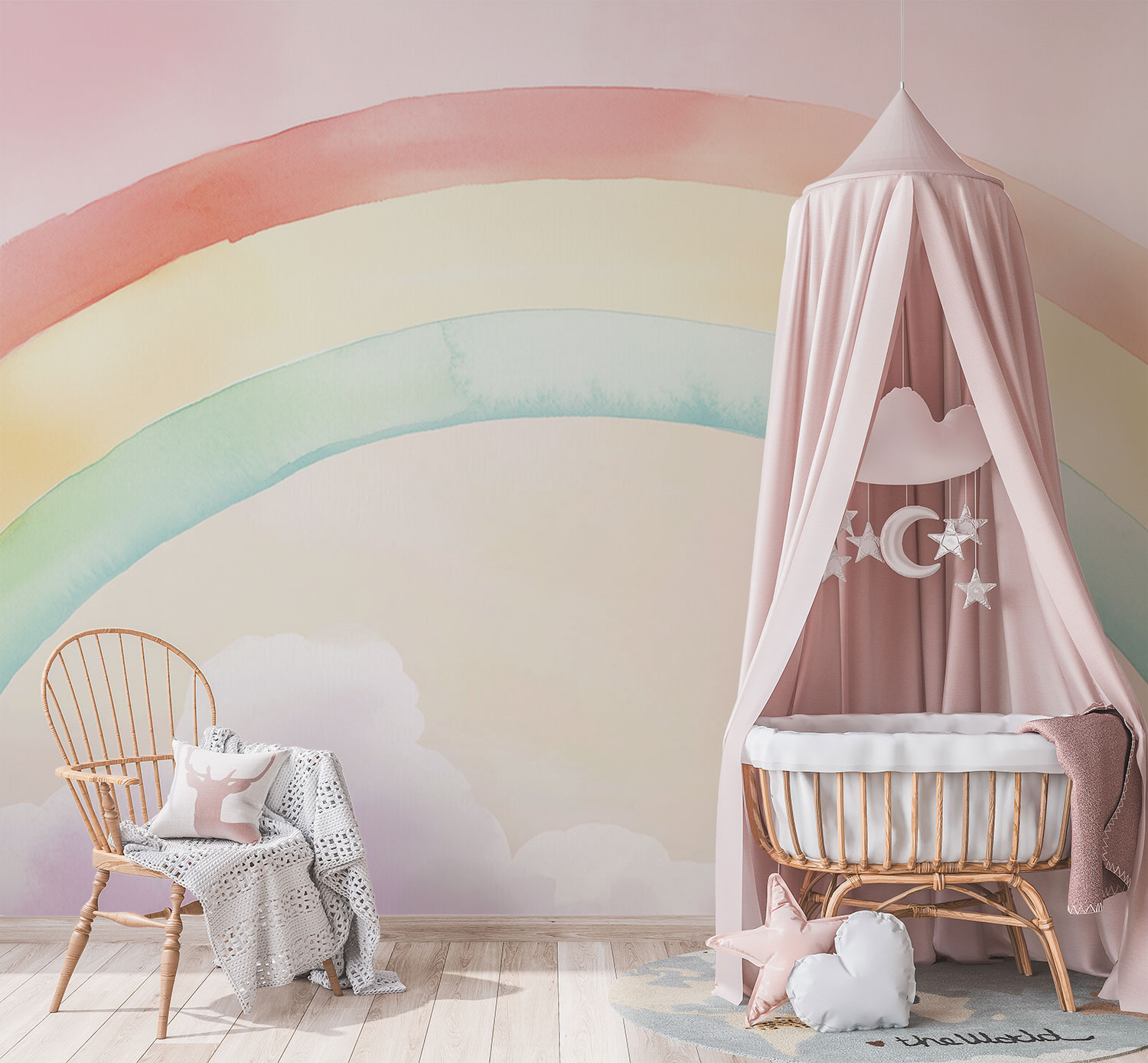 Vrolijke waterverfkleuren dansen over de muur in een speelse regenboogboog, omringd door dromerige wolken. Dit levendige tafereel brengt magie en verwondering in de kinderkamer, waar fantasie elke dag tot leven komt. De harmonieuze mix van tinten creëert een vrolijke sfeer die inspireert tot dromen en avontuur – perfect voor een ruimte vol verwondering en groei.