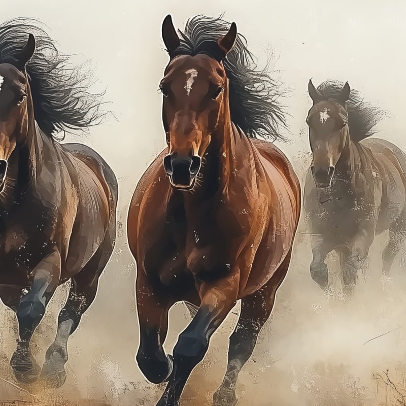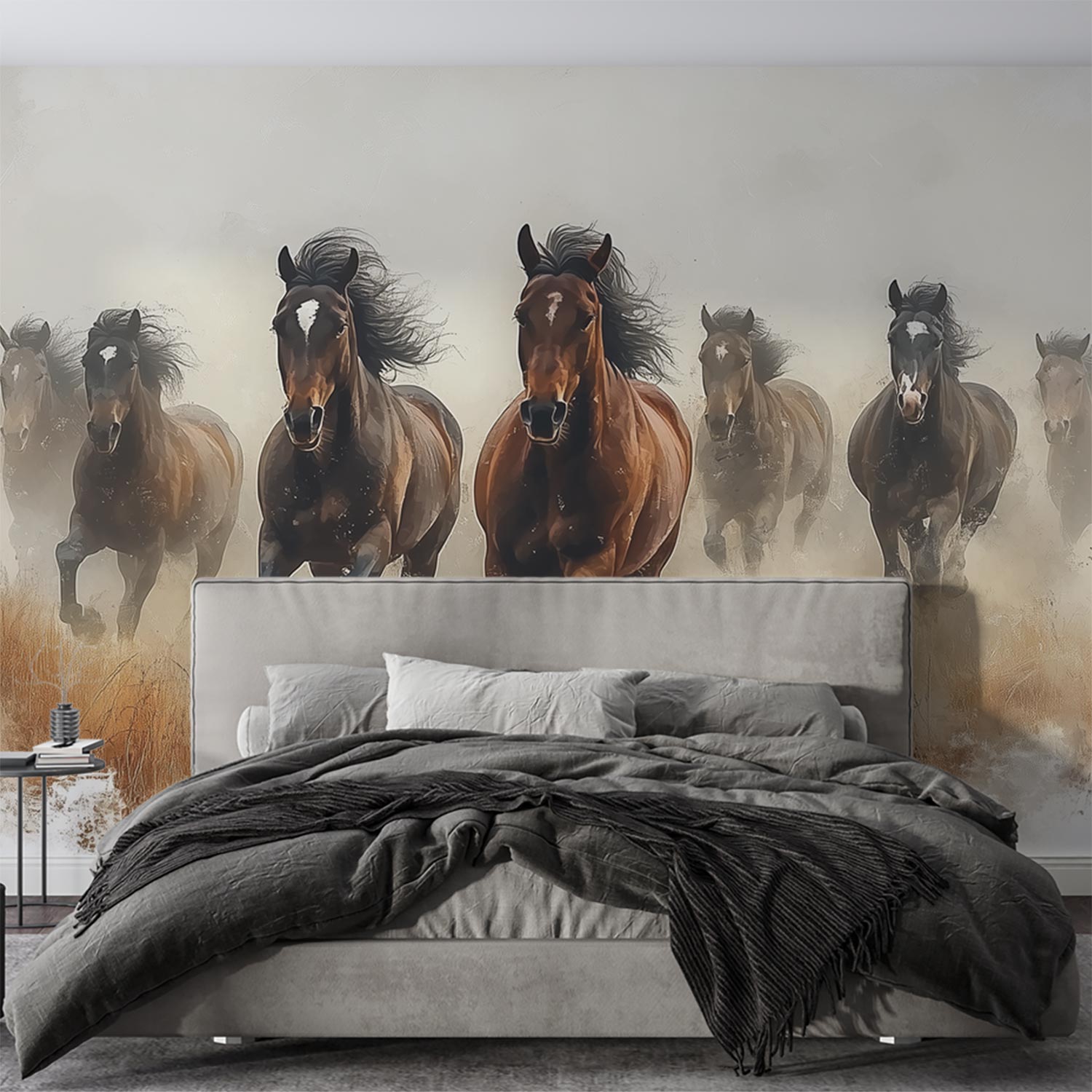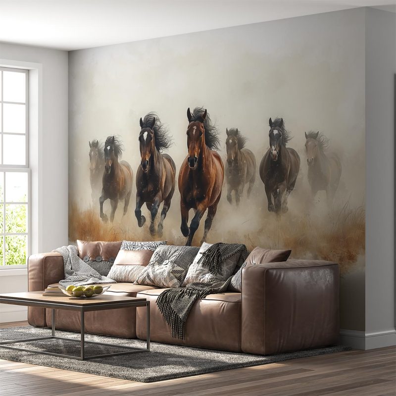 Vurig bruisen zes paarden door het veld, hun donkere manen wapperend in een werveling van stof. Deze bruine en zwarte krachten vangen pure energie en vrijheid, perfect voor een interieur dat dynamiek en avontuur ademt. Hun natuurlijke beweging brengt leven in elke ruimte, ideaal voor wie houdt van een wild en opwindend statement aan de muur.