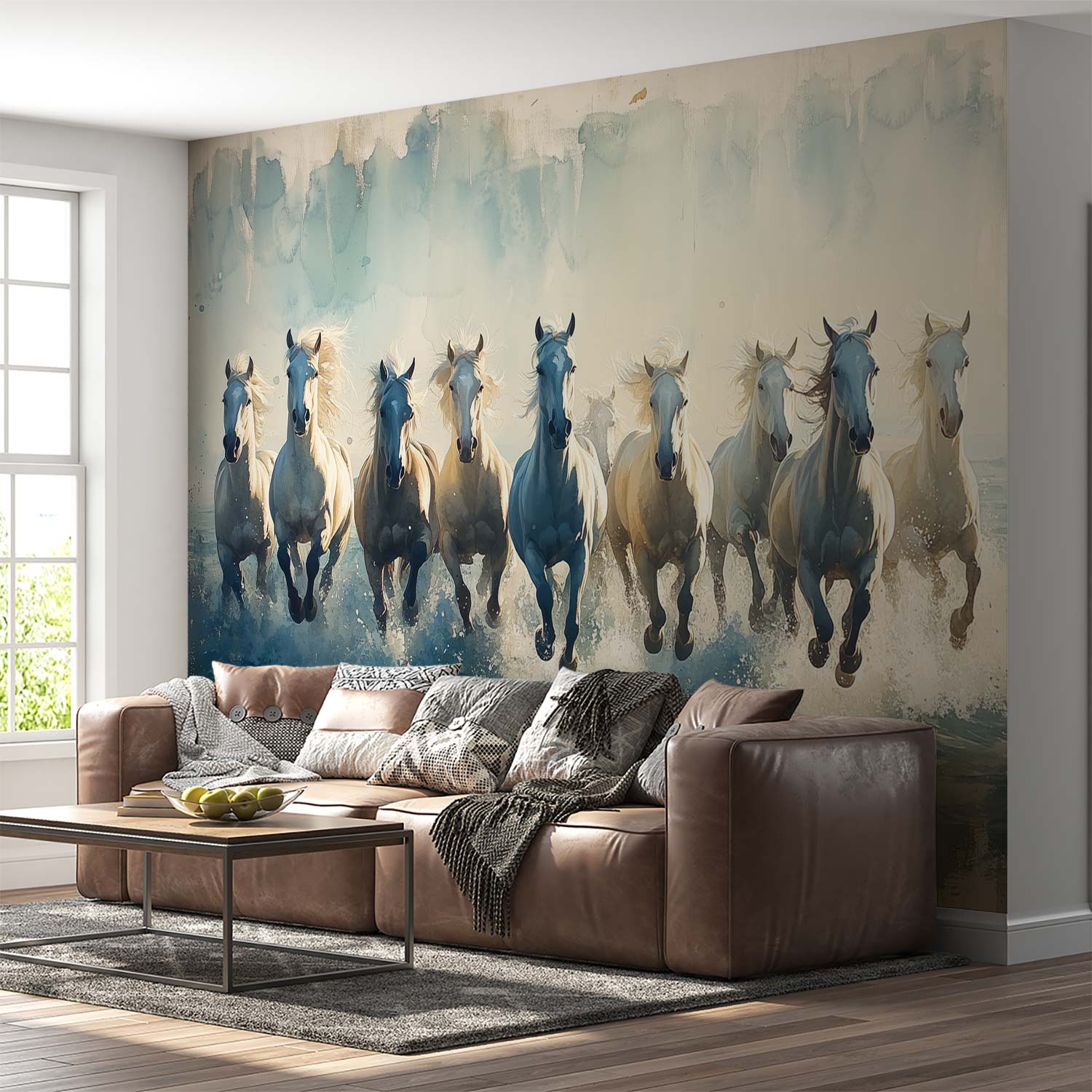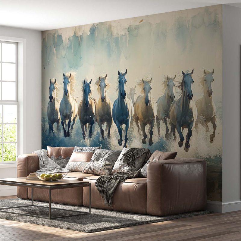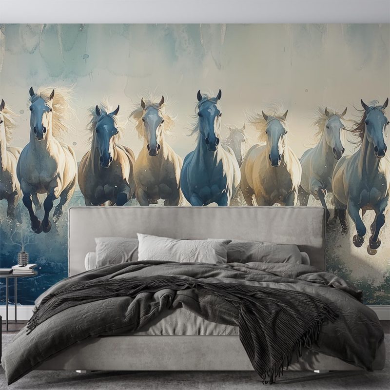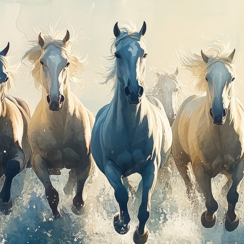 Vrijheid spat van de muur met deze galopperende paarden die wild door het water rennen. Hun witte vachten contrasteren prachtig met het diepe blauw van de zee en lucht. De dynamische compositie vol beweging en diepte brengt pure energie in je ruimte. Perfect voor wie verlangt naar avontuur en natuurlijke schoonheid in het interieur.