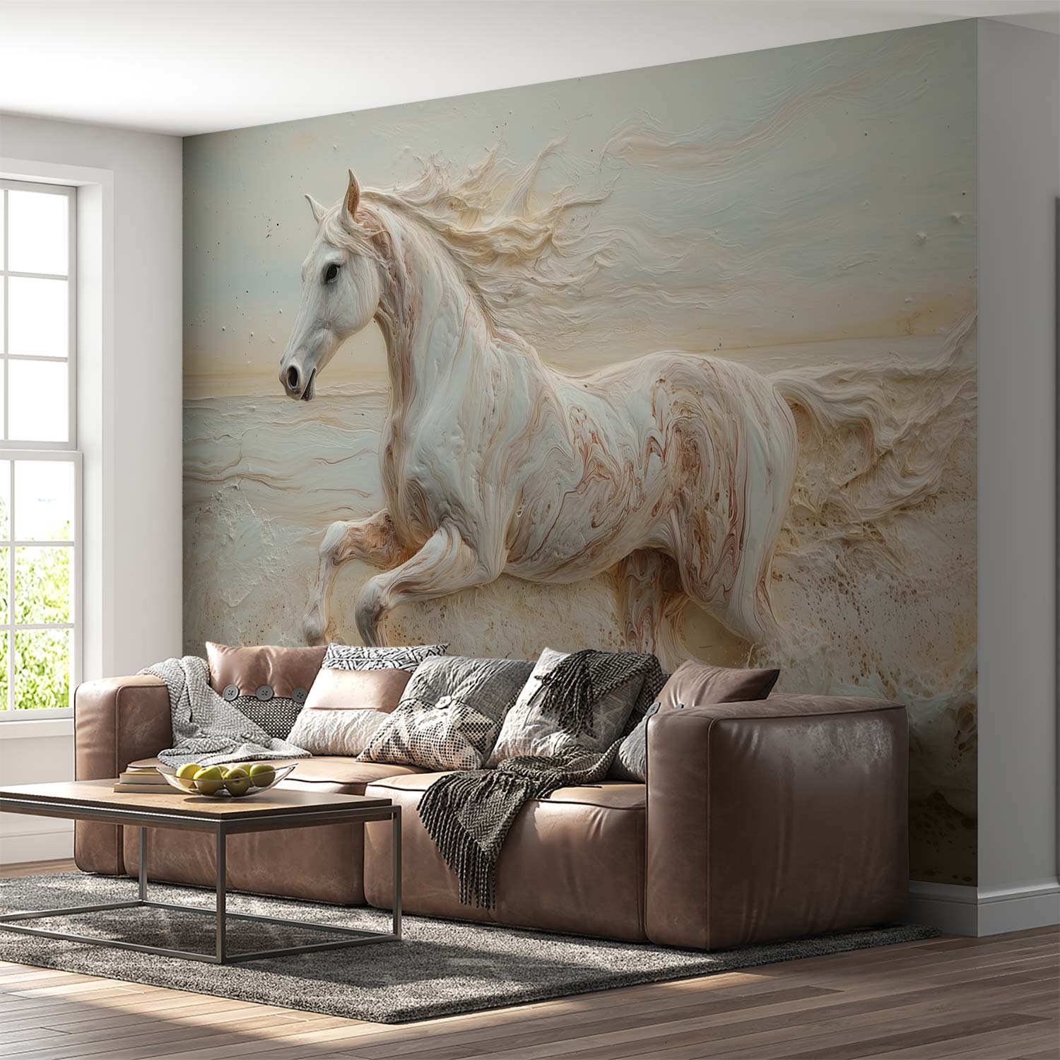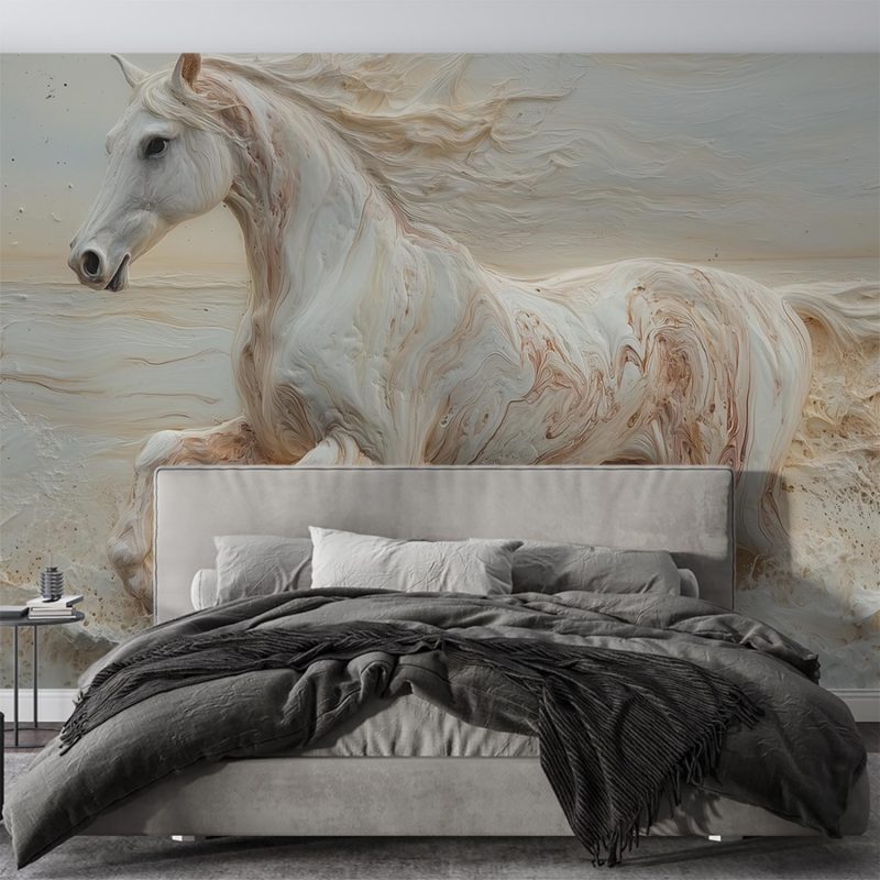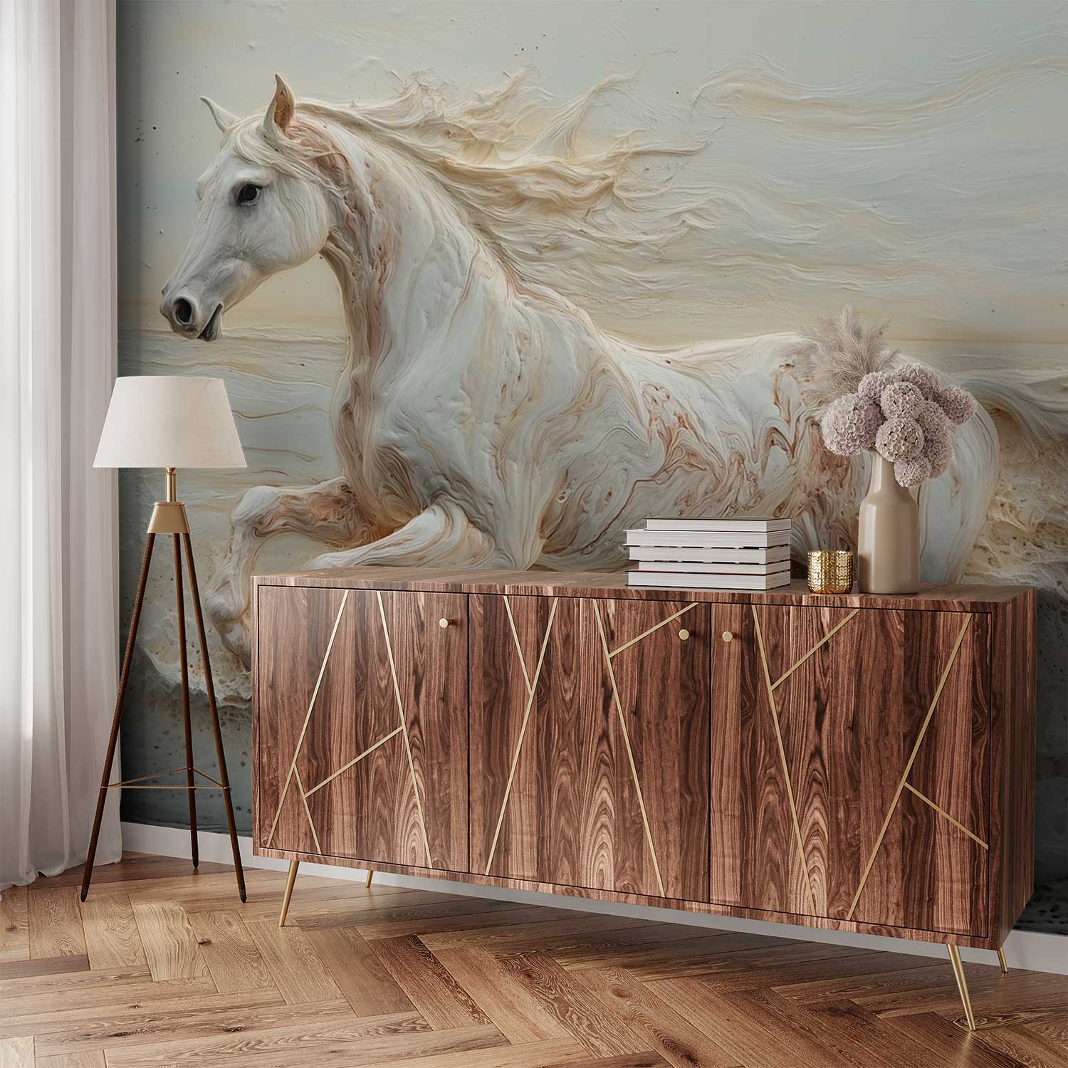 Vloeiend galoppeert dit witte paard over het strand, zijn manen dansen in de wind. Zandkleurige tinten omarmen de sculptuur vol dynamische energie, terwijl een serene sfeer van vrijheid doorklinkt. Brengt beweging en rust in uw interieur, perfect voor een ruimte die verlangt naar natuurlijke elegantie en poëtische verstilling.