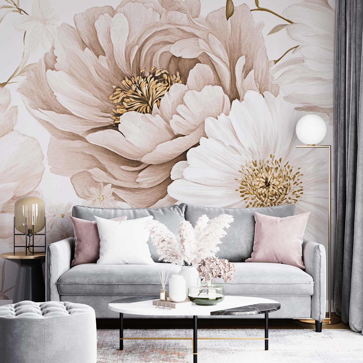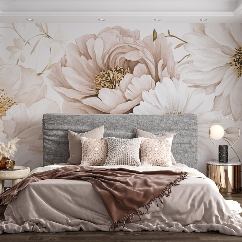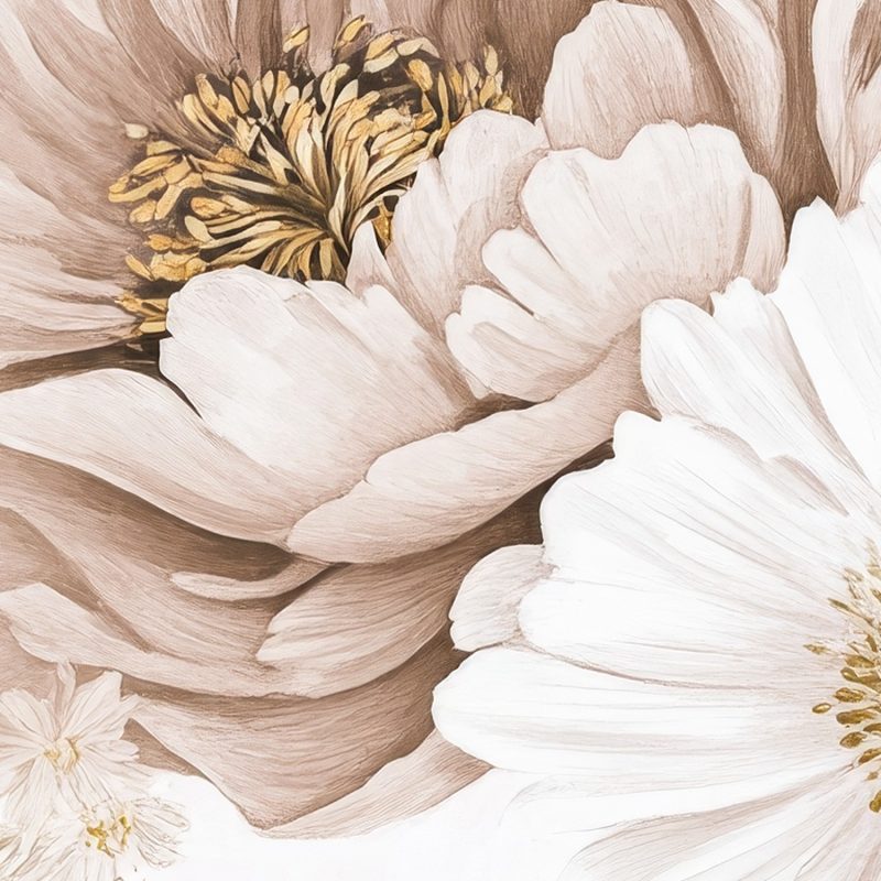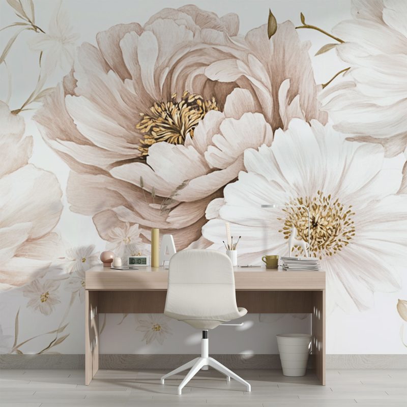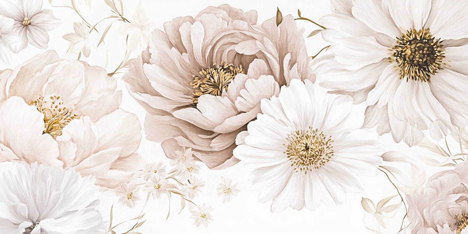 Zachte witte en beige bloemen dansen elegant over een serene achtergrond. Grote en kleine bloesems overlappen elkaar speels, creëren harmonie en ademen pure rust. Dit behang brengt een gevoel van tijdloze elegantie in je interieur, perfect voor een kalme en stijlvolle leefomgeving waar natuurlijke schoonheid centraal staat.