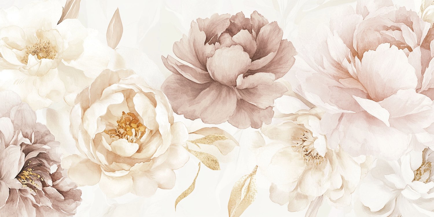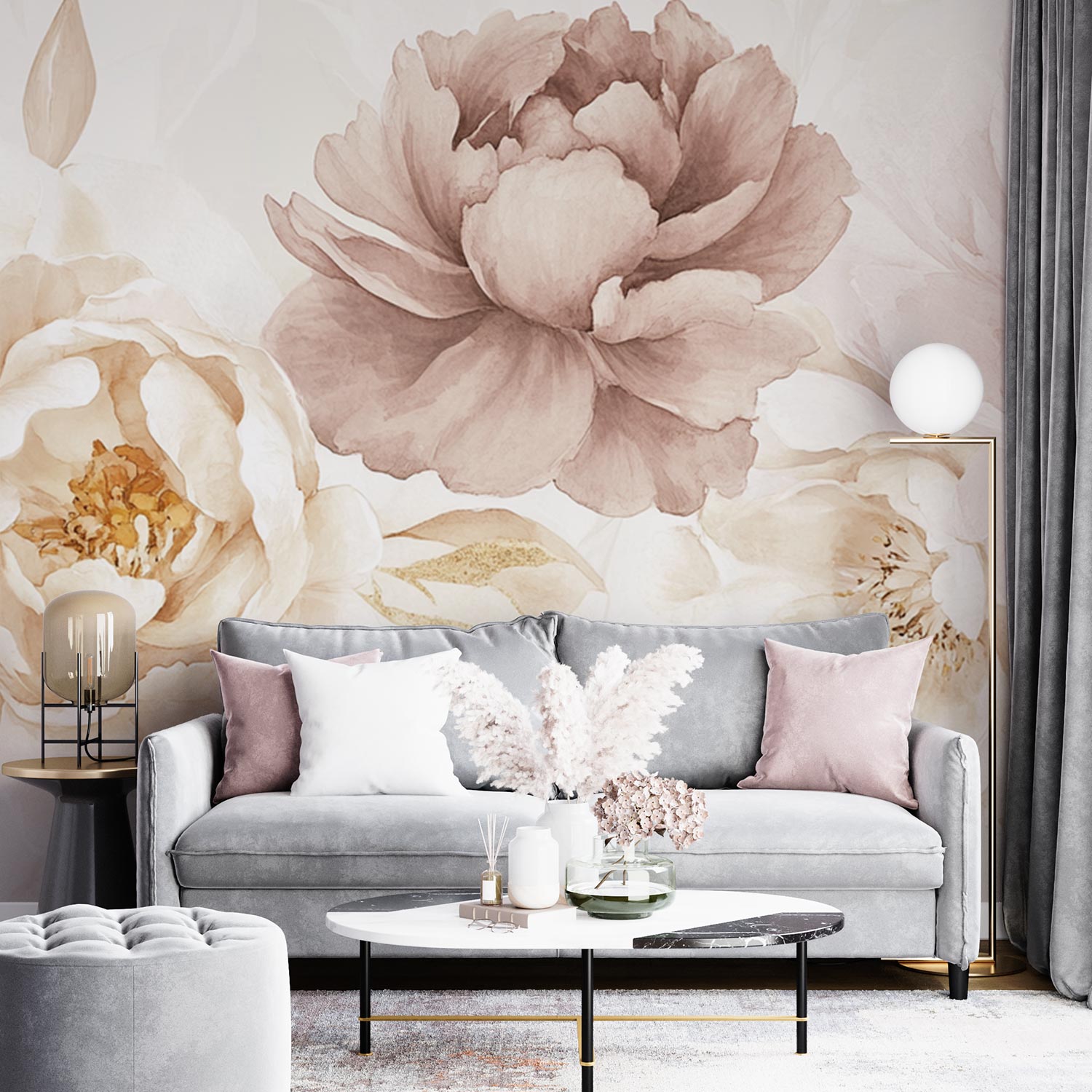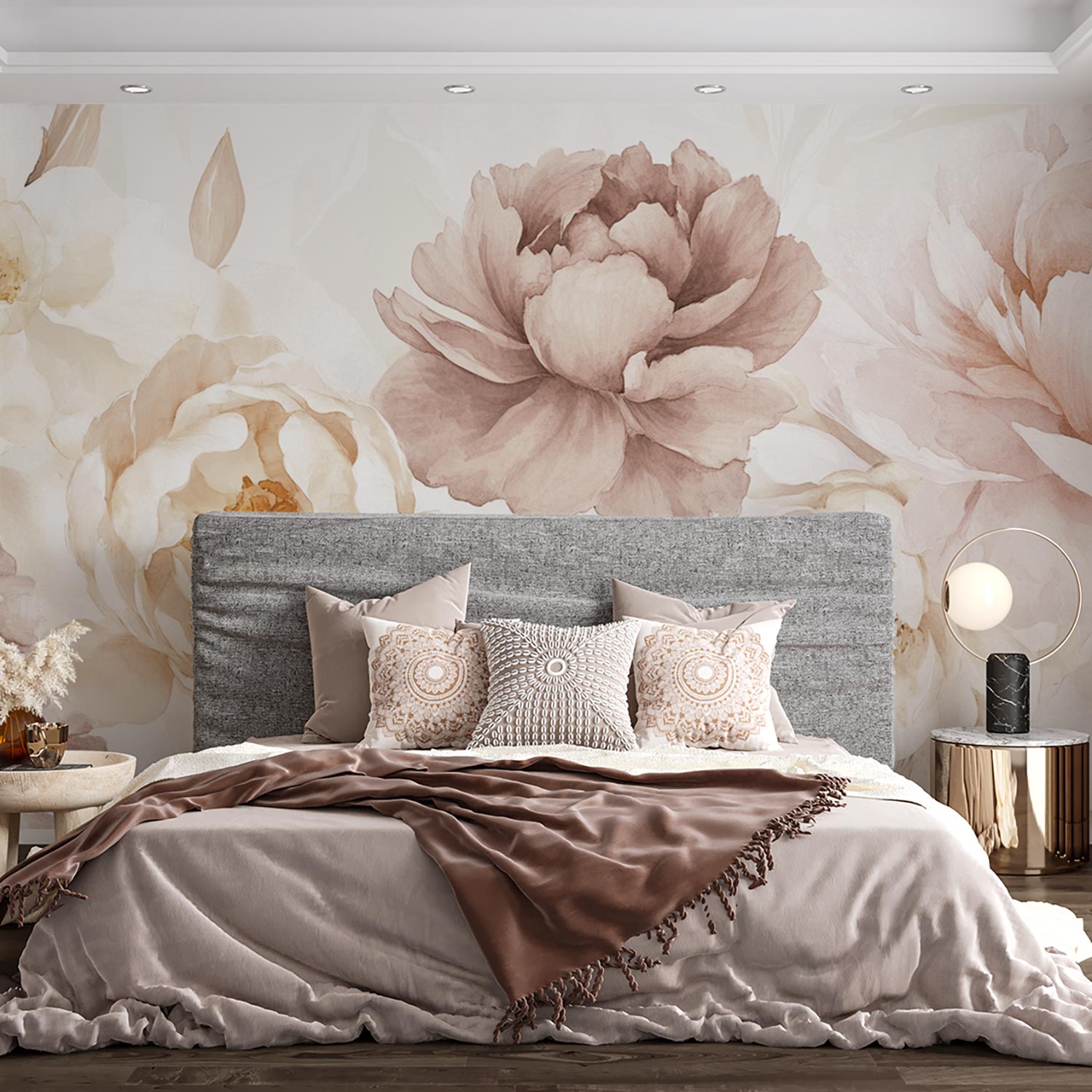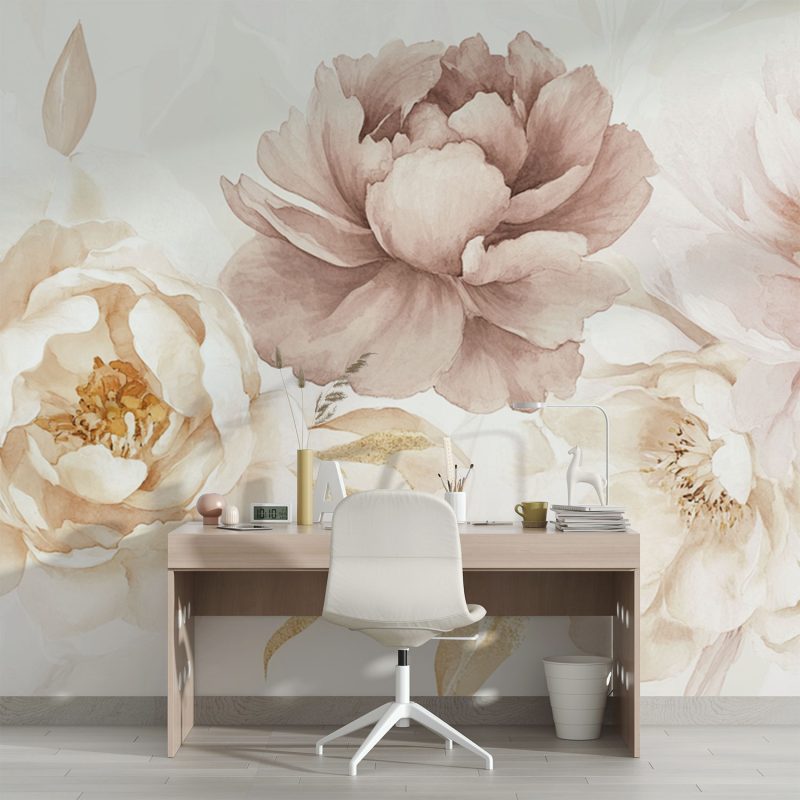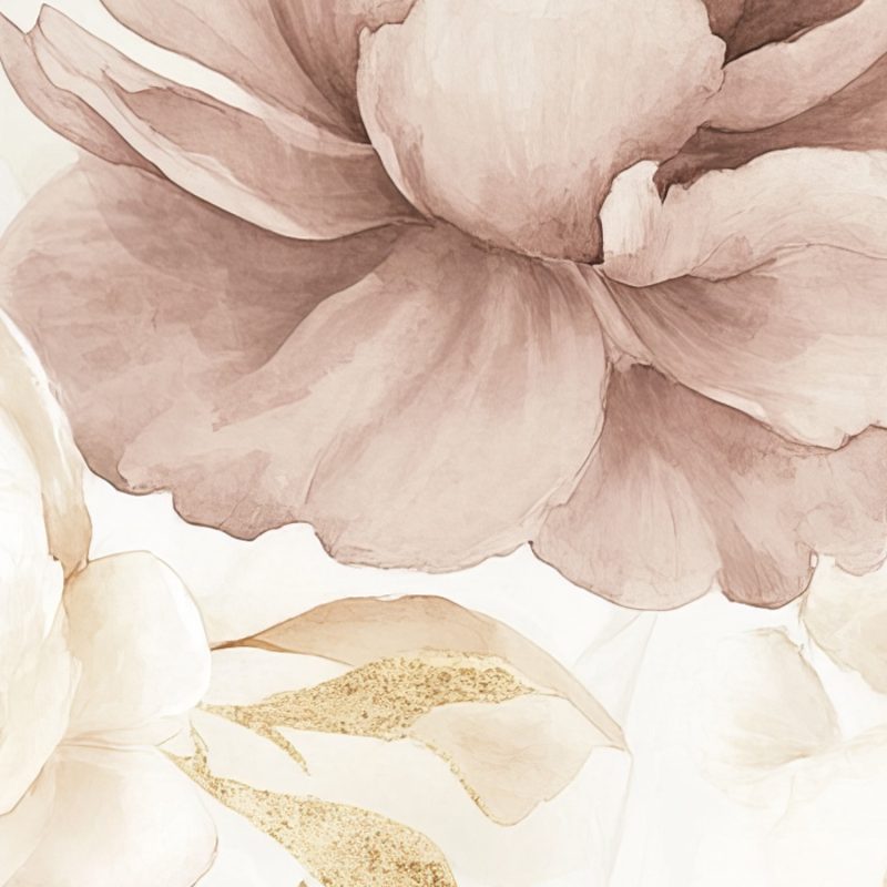 Zachte witte en beige bloemen dansen elegant over het behang, waarbij sommige elkaar overlappen terwijl anderen op zichzelf stralen. Hun harmonieuze compositie creëert diepte en beweging, alsof ze zachtjes in de wind wiegen. Dit serene bloementapijt brengt rust en natuurlijke elegantie in elke ruimte, perfect voor het creëren van een kalme, tijdloze sfeer in je huis.