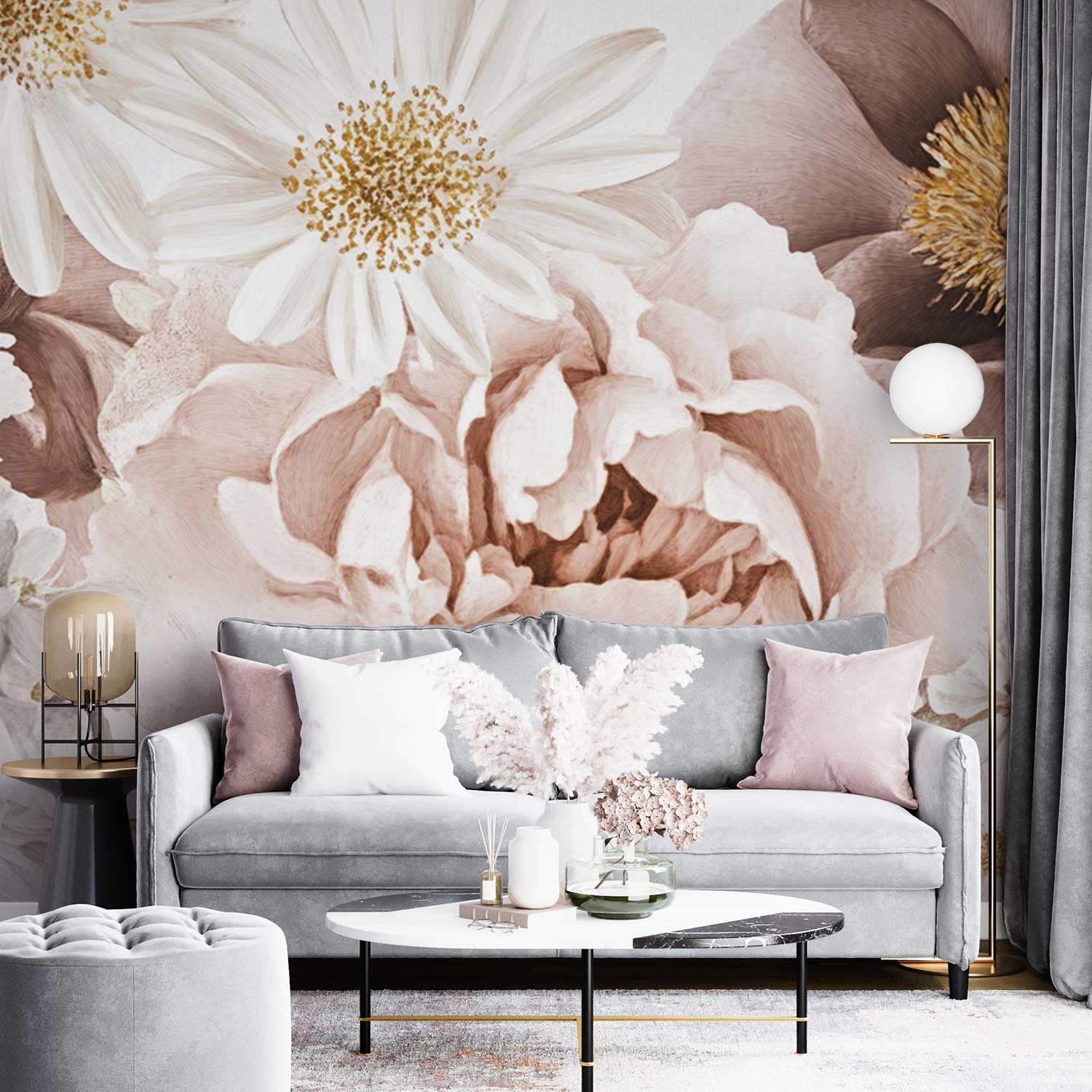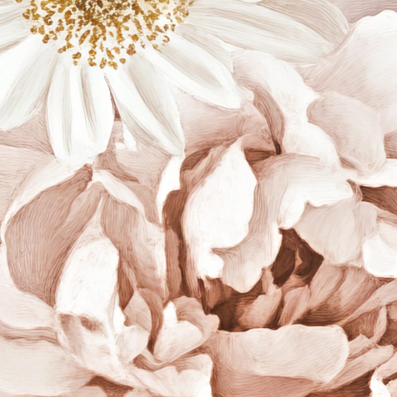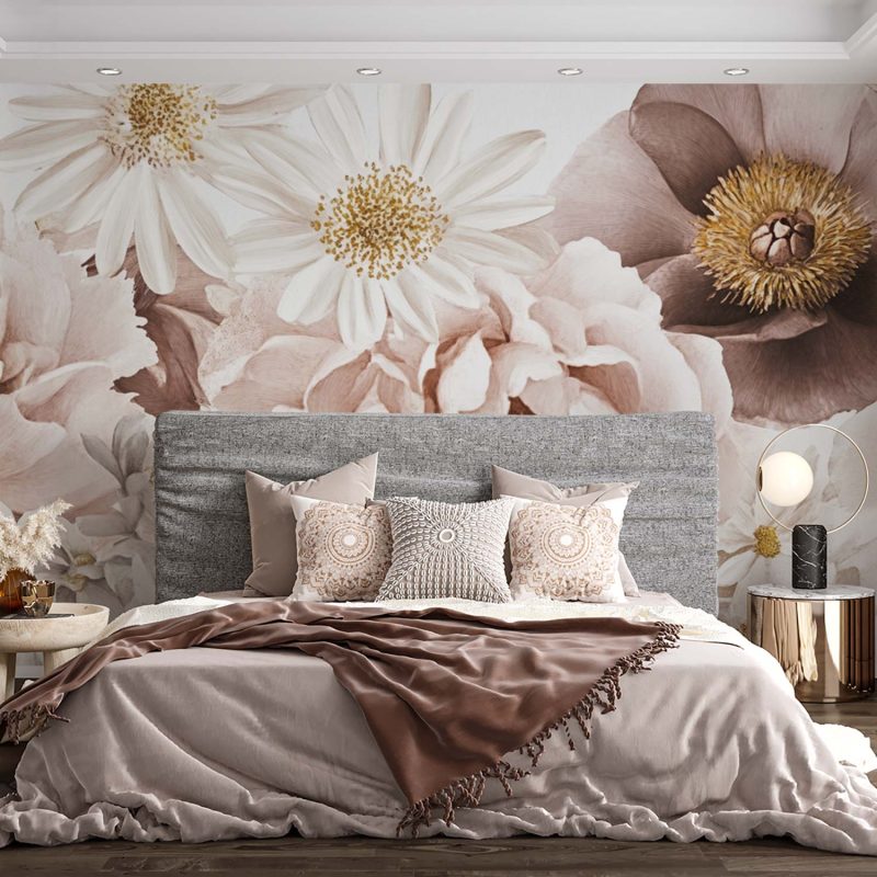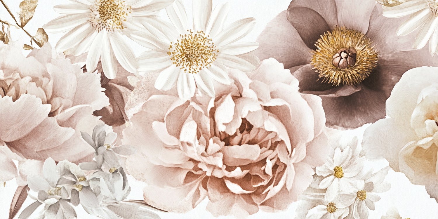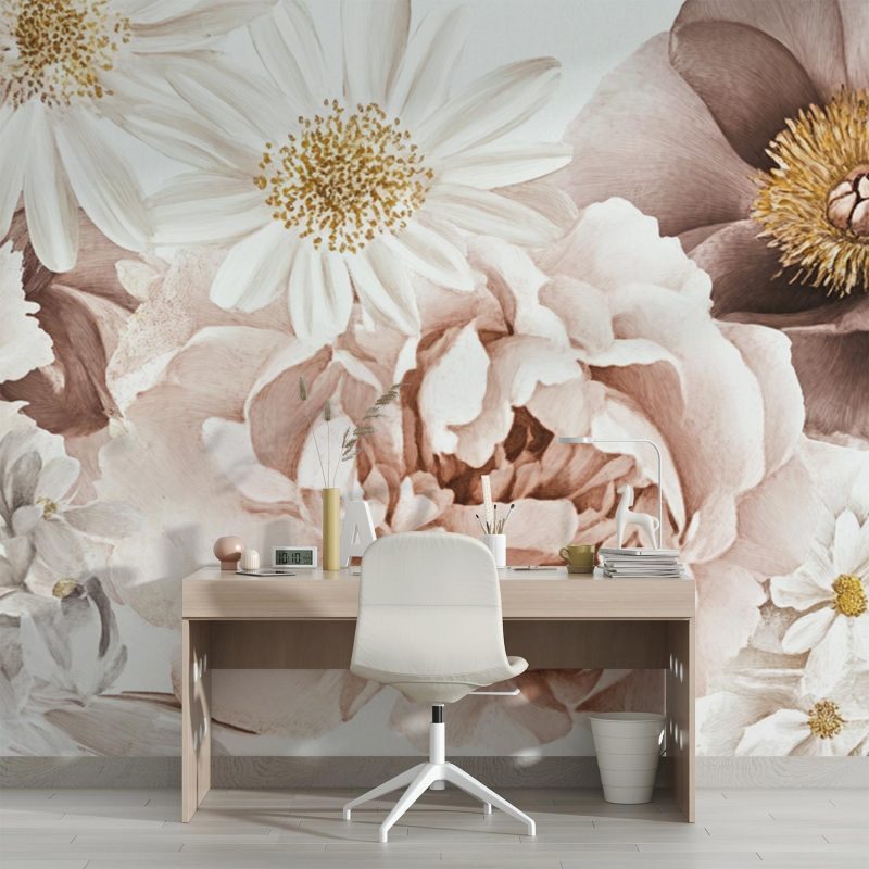 Verfijnde witte en beige bloemen dansen in volle bloei over het behang, hun delicate bloemblaadjes stralen een serene rust uit. Dit levendige botanische tafereel brengt harmonie en natuurlijke elegantie in elke ruimte, perfect voor een kalme en stijlvolle sfeer.