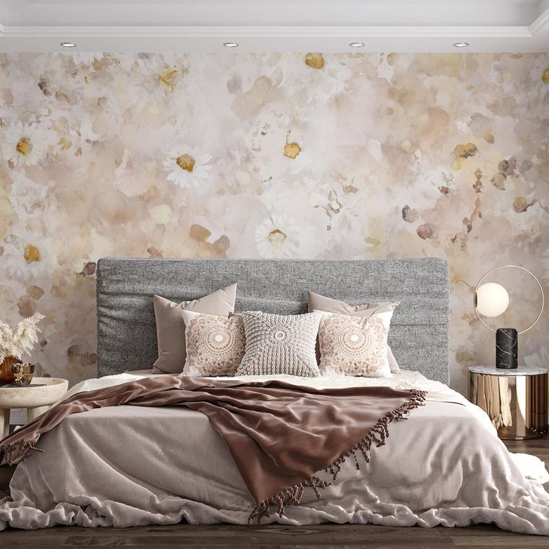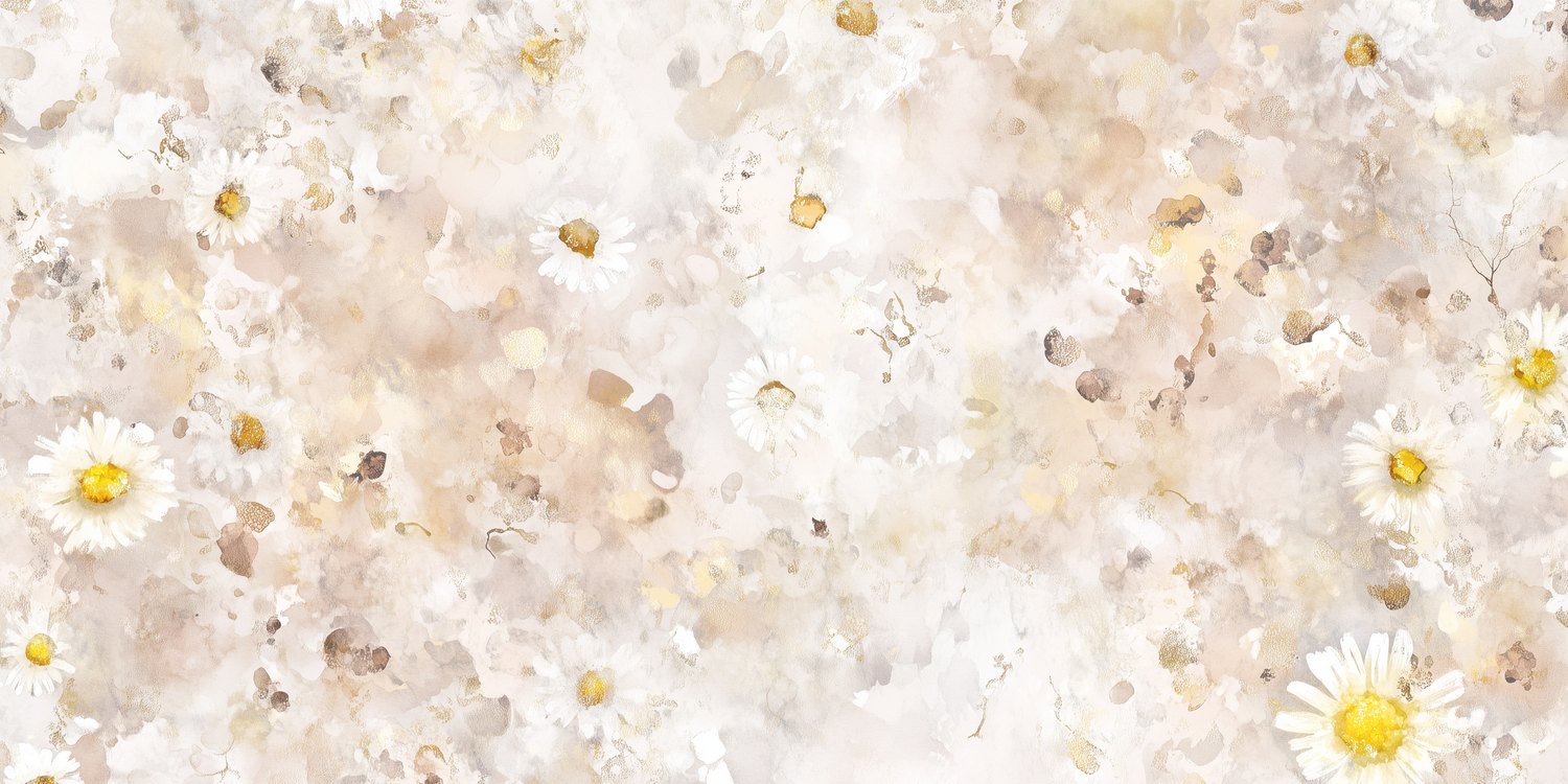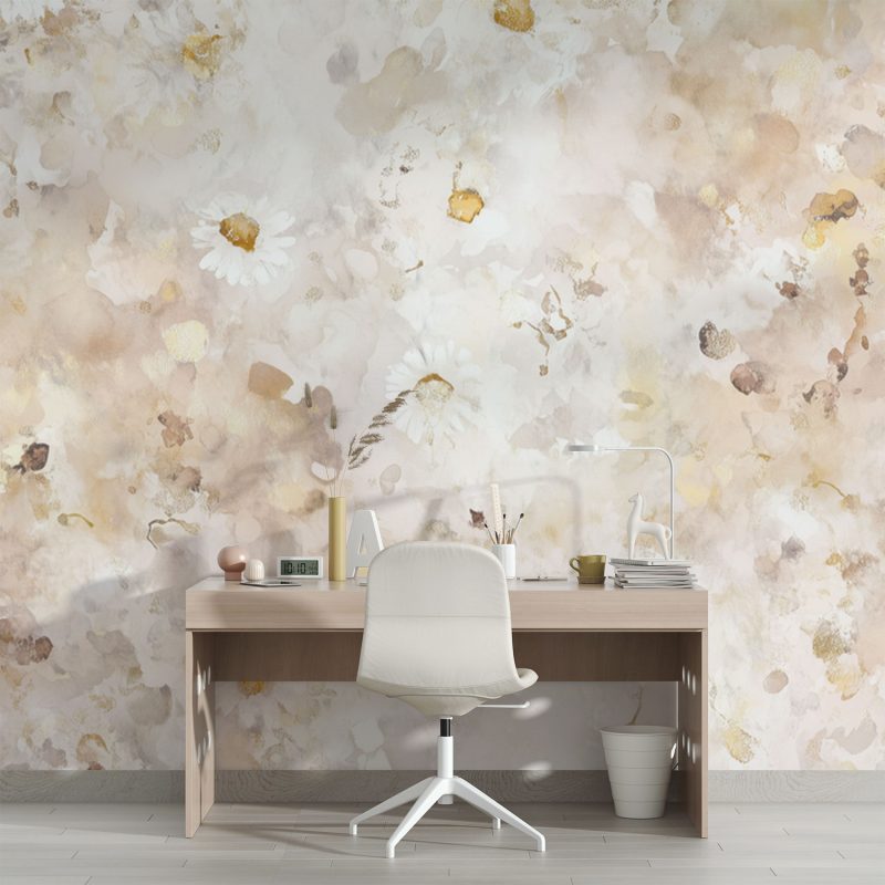 Zachte beige tinten vormen een rustgevend decor voor een speelse verstrooiing van witte en gele bloemen. Deze levendige bloemenpracht danst elegant over de muur en brengt de serene schoonheid van de natuur naar binnen. Perfect voor wie verfijnde rust zoekt in de woonruimte, dit behang creëert harmonie en een tijdloze natuurlijke uitstraling.