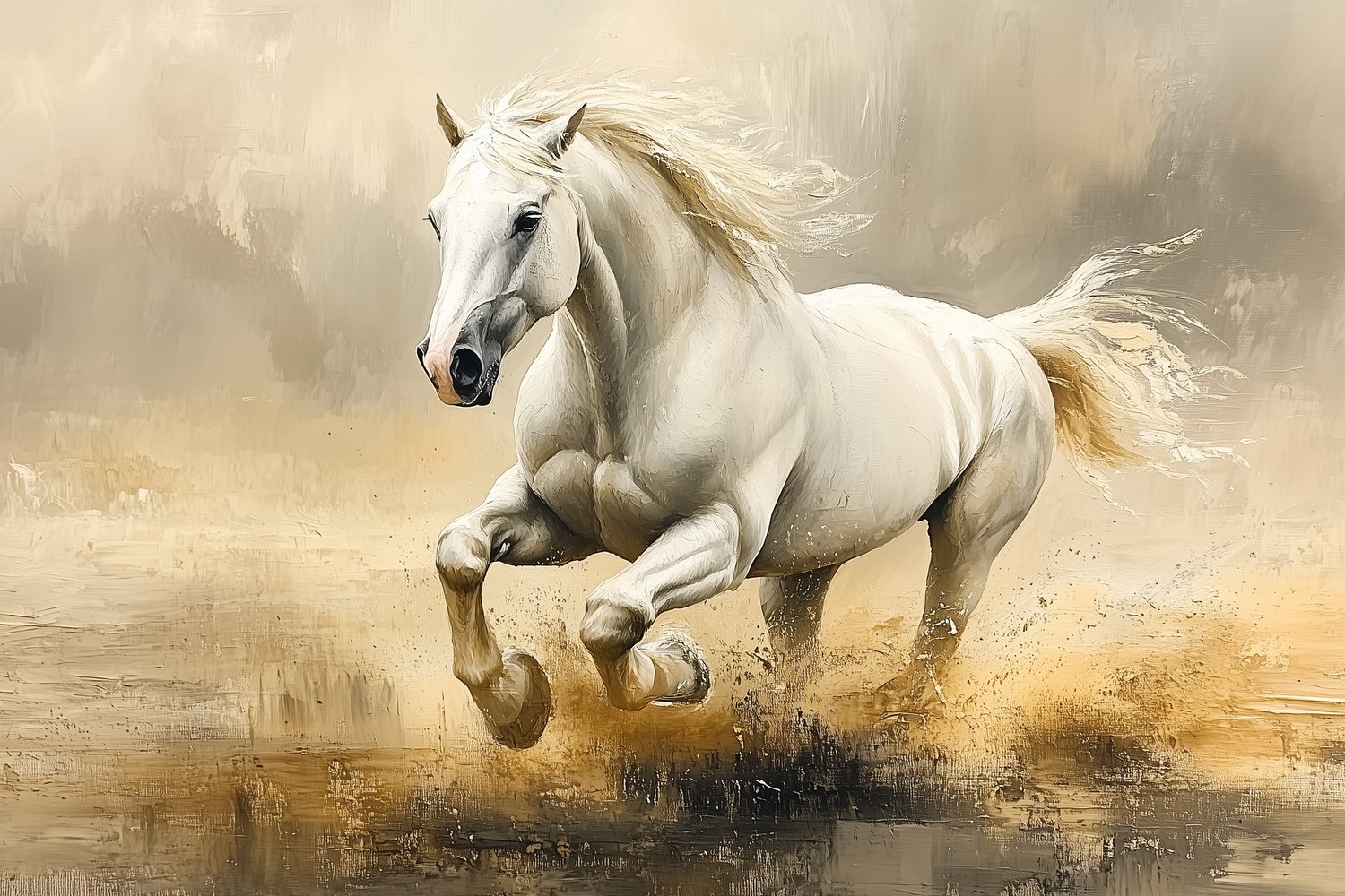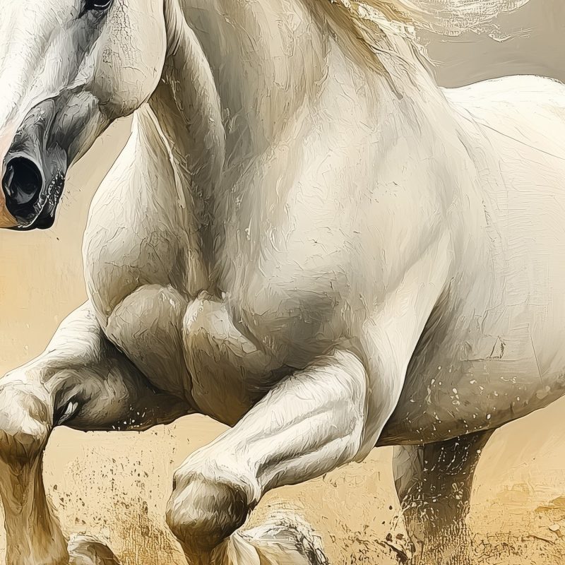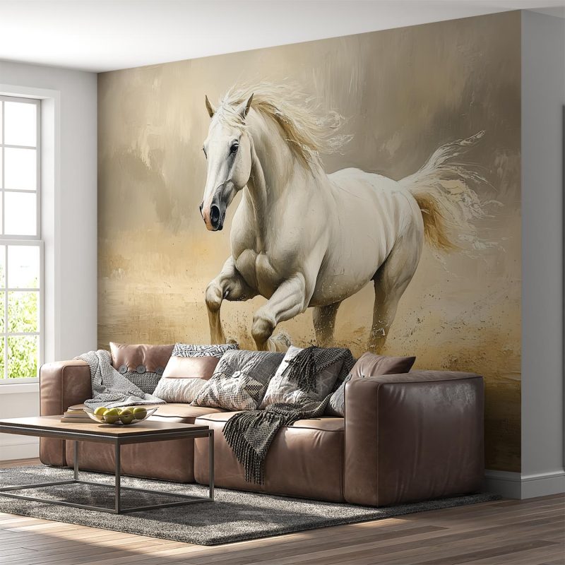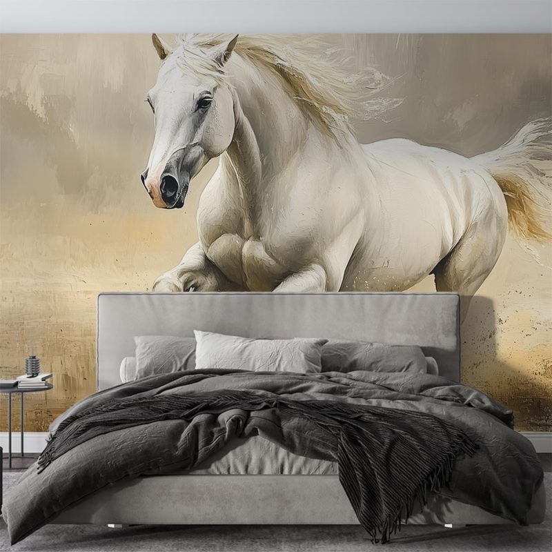 Vloeiend galoppeert een witte hengst door een aards getint landschap. Zijn gespierde lijf en wapperende manen stralen pure kracht en vrijheid uit. Dit realistische tafereel brengt dynamische elegantie in je ruimte, ideaal voor een statement muur die energie en natuurlijke schoonheid toevoegt.
