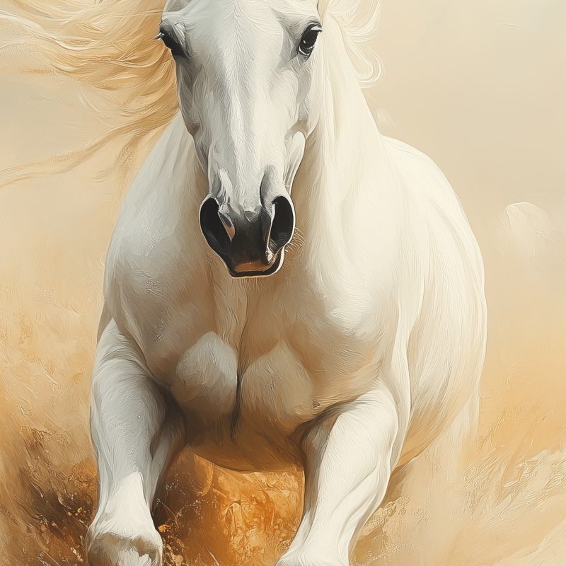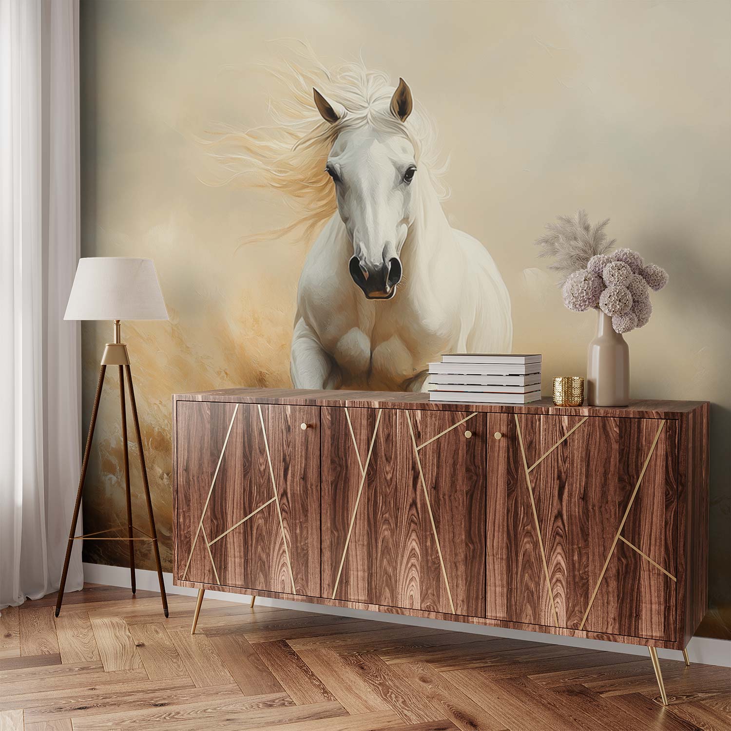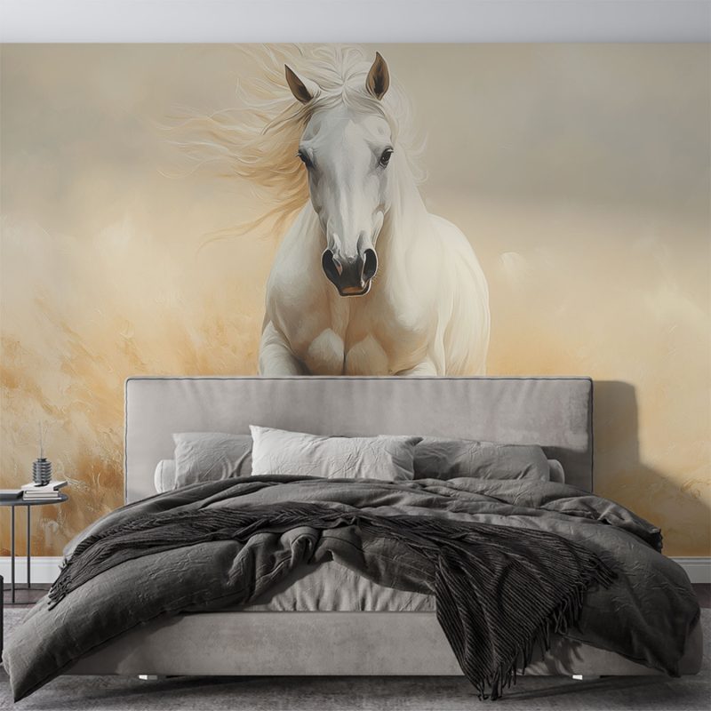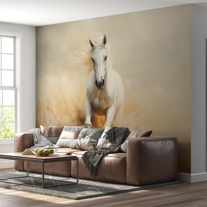 Vrijheid en kracht stralen uit dit realistische behang. Een wit paard galoppeert dynamisch door een aardsbruin veld. Zijn wapperende manen en gespierde lijf komen tot leven. Deze levendige scène brengt natuurlijke elegantie en beweging in je interieur. Het creëert een focal point vol energie en rusteloze schoonheid. Perfect voor wie verlangt naar de ongetemde geest van de natuur binnenhuis.