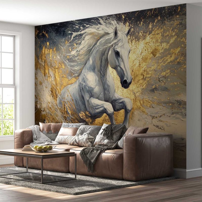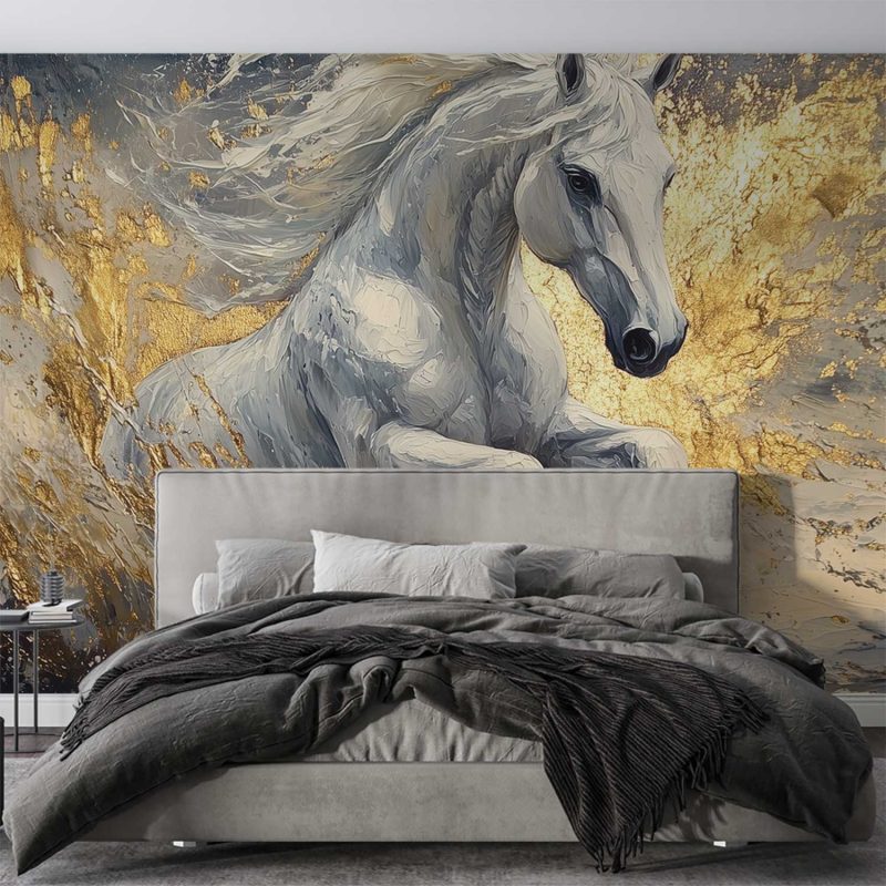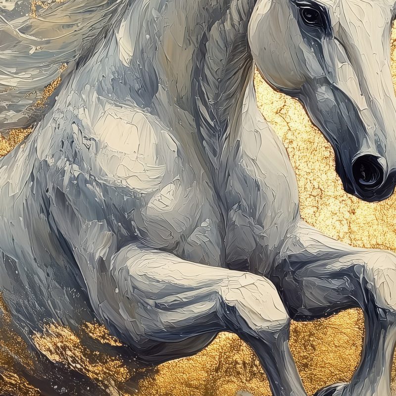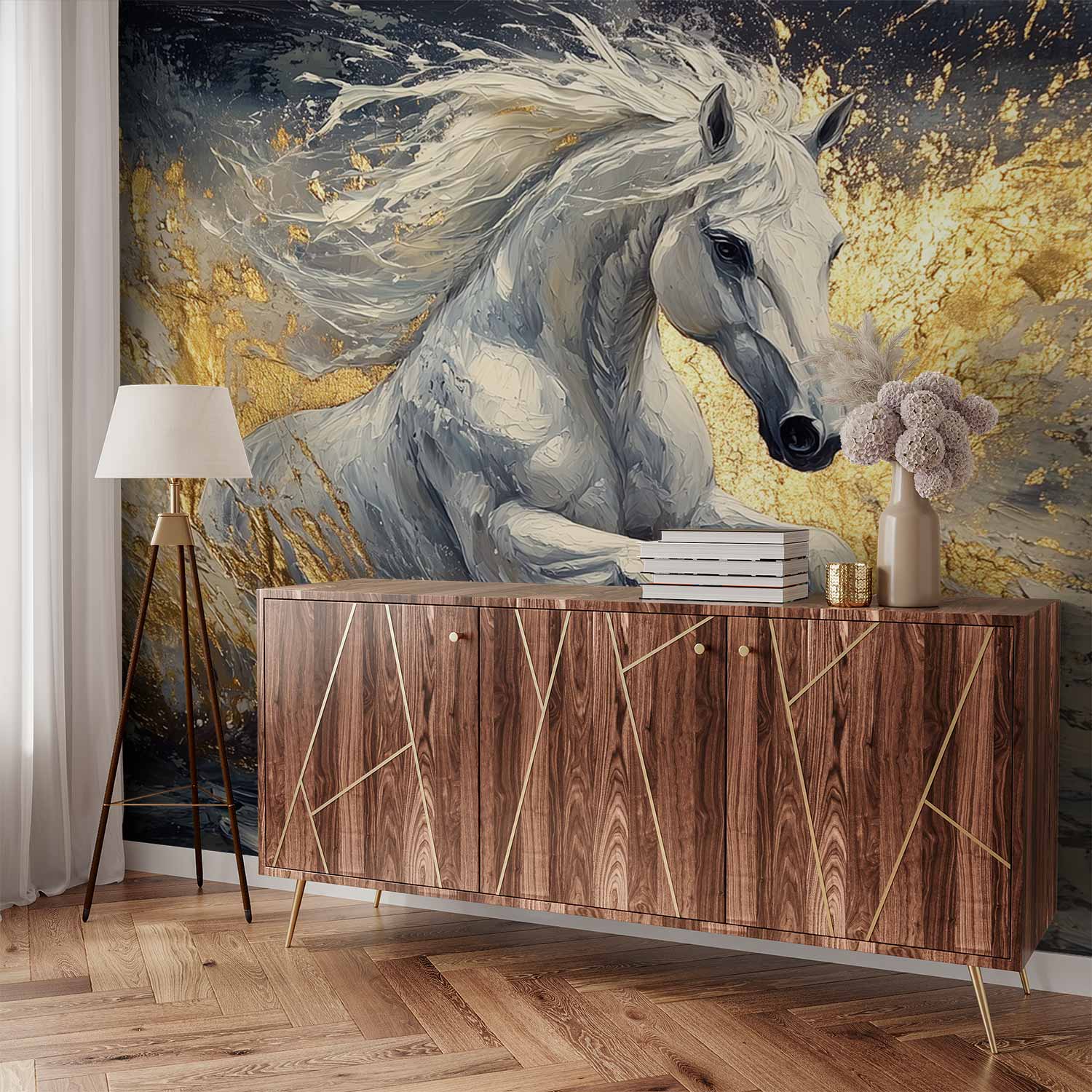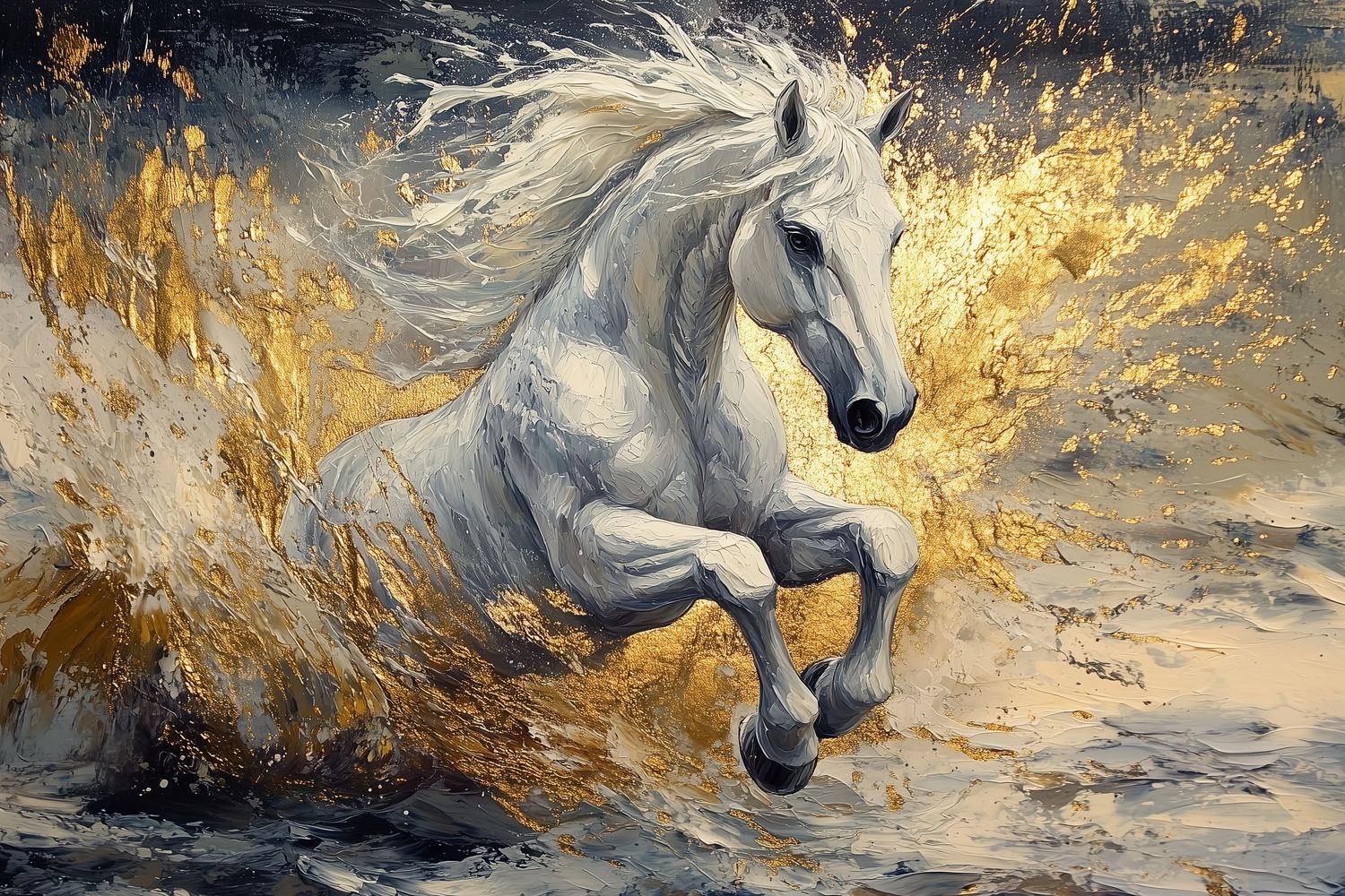 Vloeiend galoppeert een majestueus wit paard door donker water, zijn manen en staart fonkelend van goud. De dynamische beweging en dramatische kleurcontrasten brengen pure energie in je ruimte. Dit kunstwerk ademt vrijheid en gratie, en transformeert elke muur in een levendig statement vol elegantie en kracht.