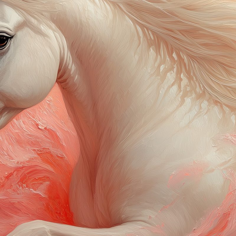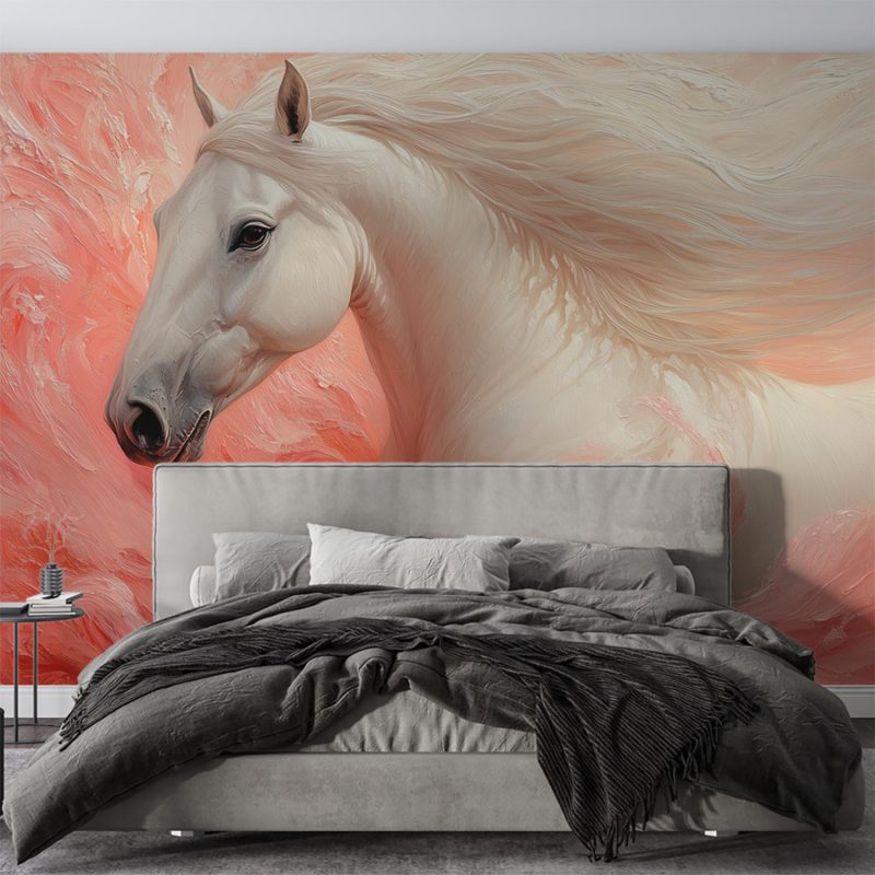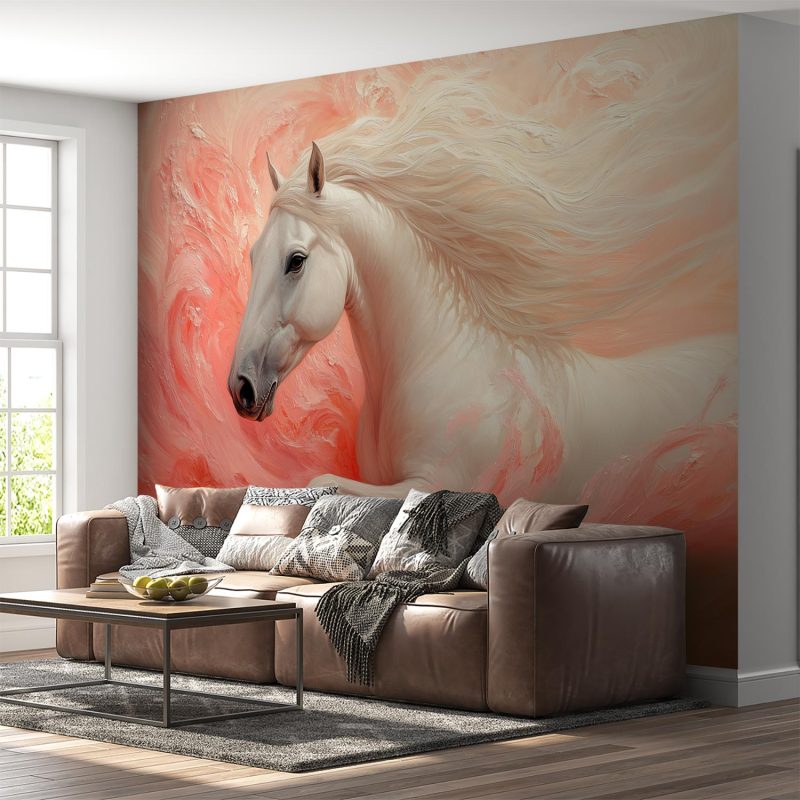 Vurige roze en rode wervelingen omarmen een majestueus wit paard in volle galop. Zijn zwevende manen dansen door de lucht vol energie en elegantie. Deze levendige scène brengt passie en dynamiek in je ruimte, terwijl het krachtige contrast een artistiek statement maakt. Perfect voor wie verfijnde dramatiek zoekt in het interieur.