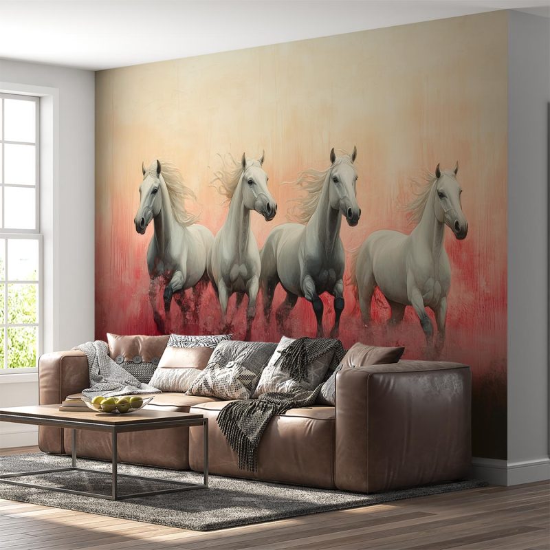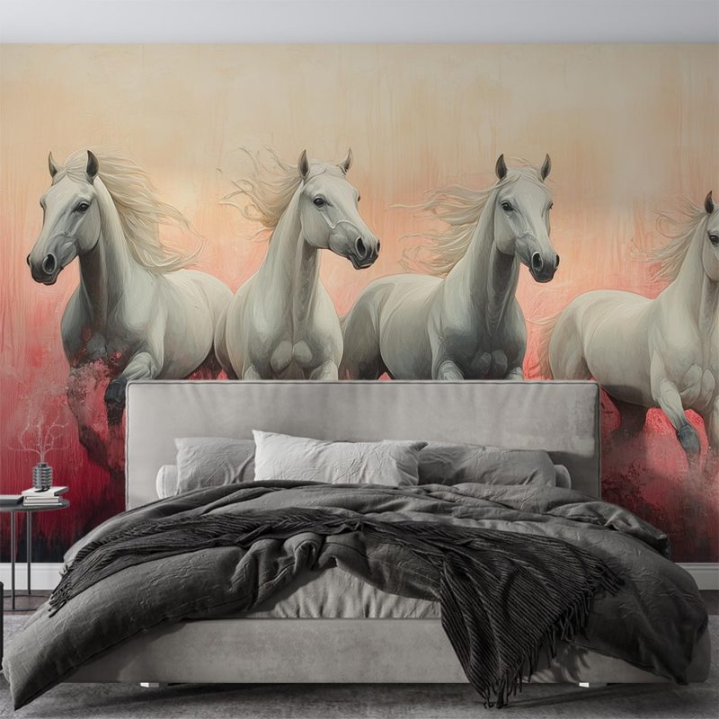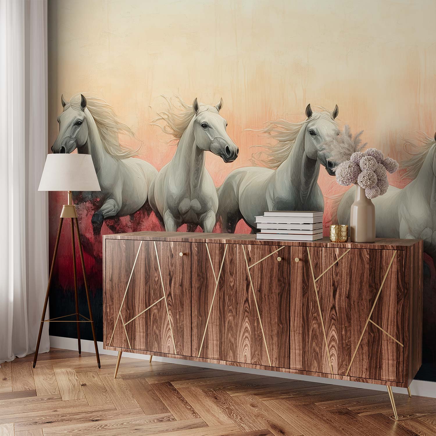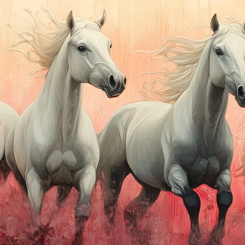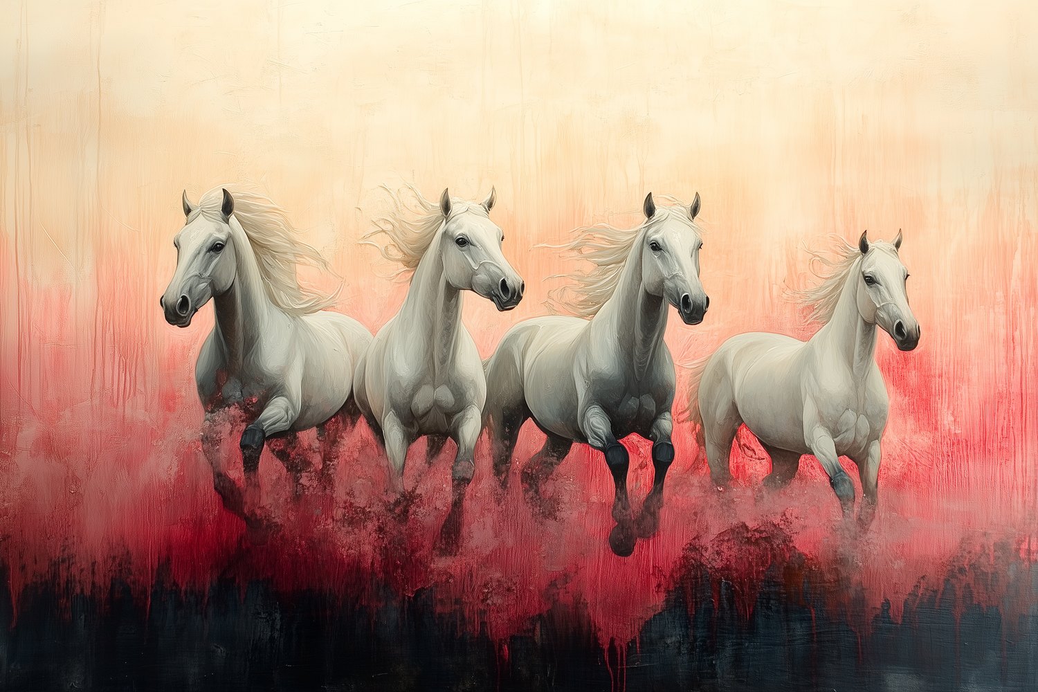 Vurige rode en zwarte tinten vormen een dramatisch podium voor vier witte paarden in volle galop. Hun dynamische beweging straalt pure energie en kracht uit, gevangen in een oogverblindend moment. Dit krachtige statement brengt leven en passie in moderne ruimtes, waar het direct de blik vangt als een meeslepend middelpunt.