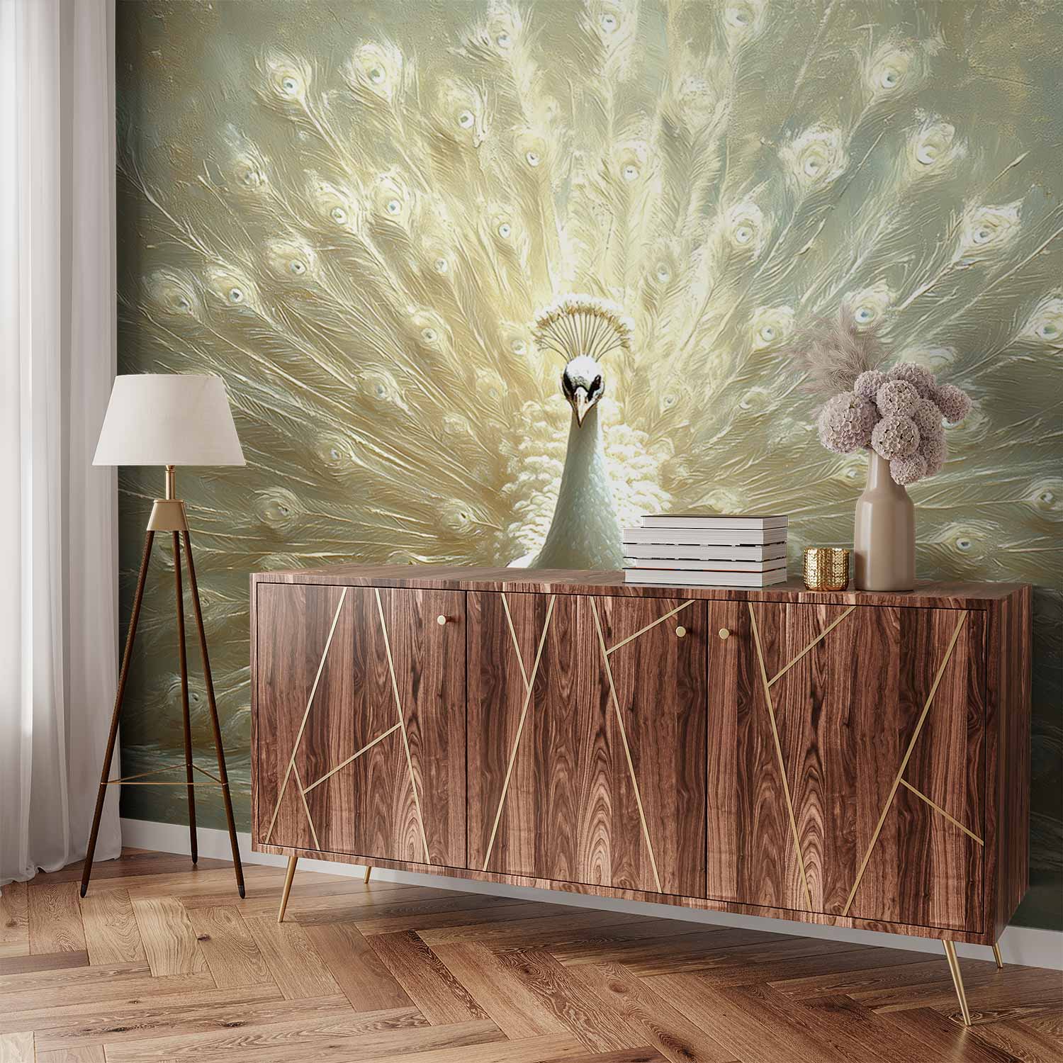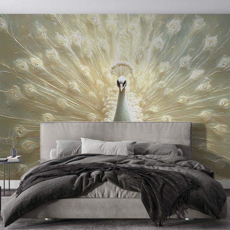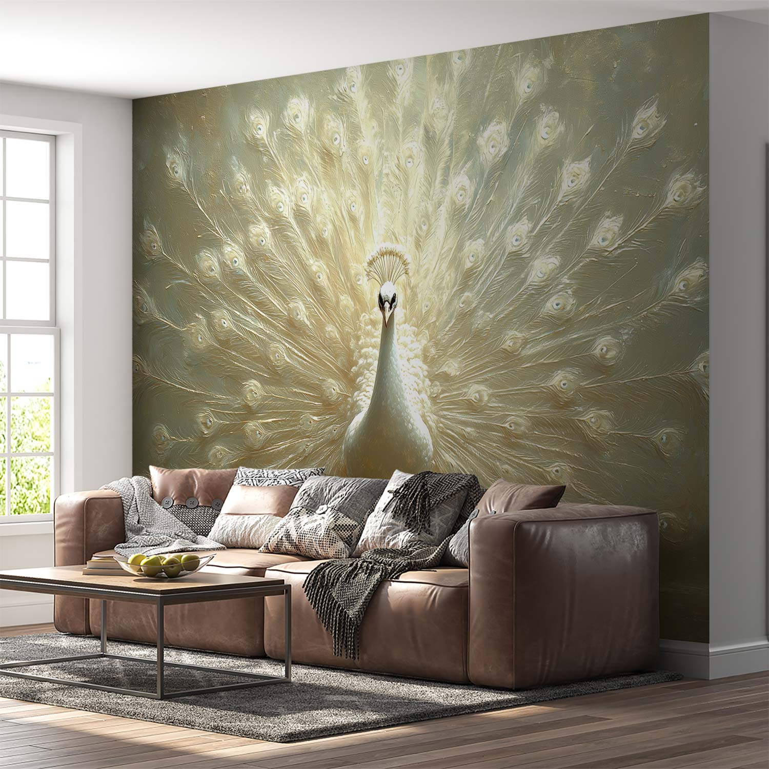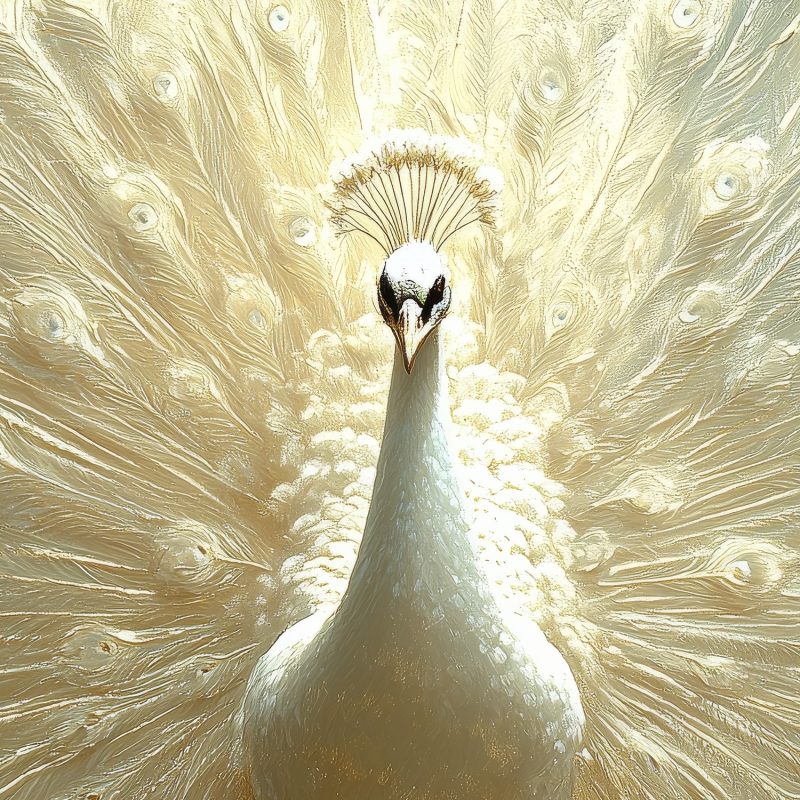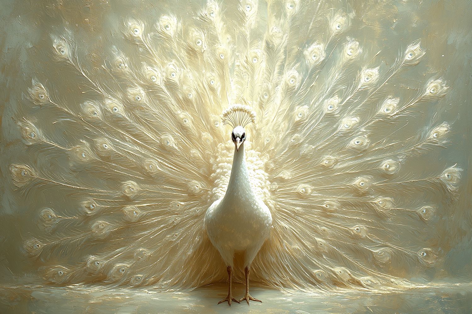 Majestueus spreidt de witte pauw zijn veren in een serene dans. Lichtbeige achtergrond laat zijn sneeuwwitte pracht stralen. Deze betoverende verschijning brengt elegante rust en natuurlijke gratie in je interieur. Zijn hypnotiserende schoonheid transformeert elke ruimte tot een oase van pure verstilling.