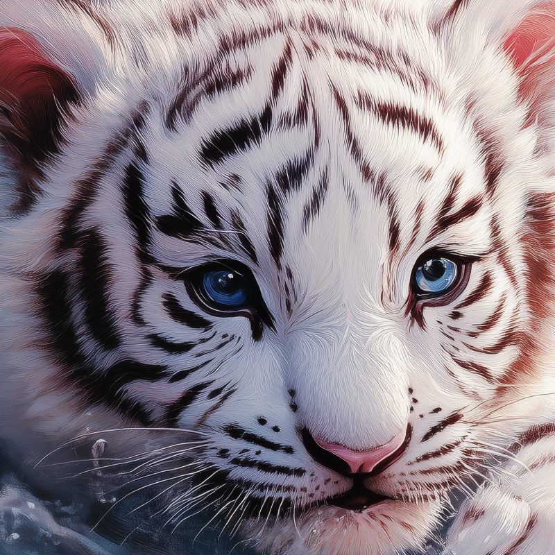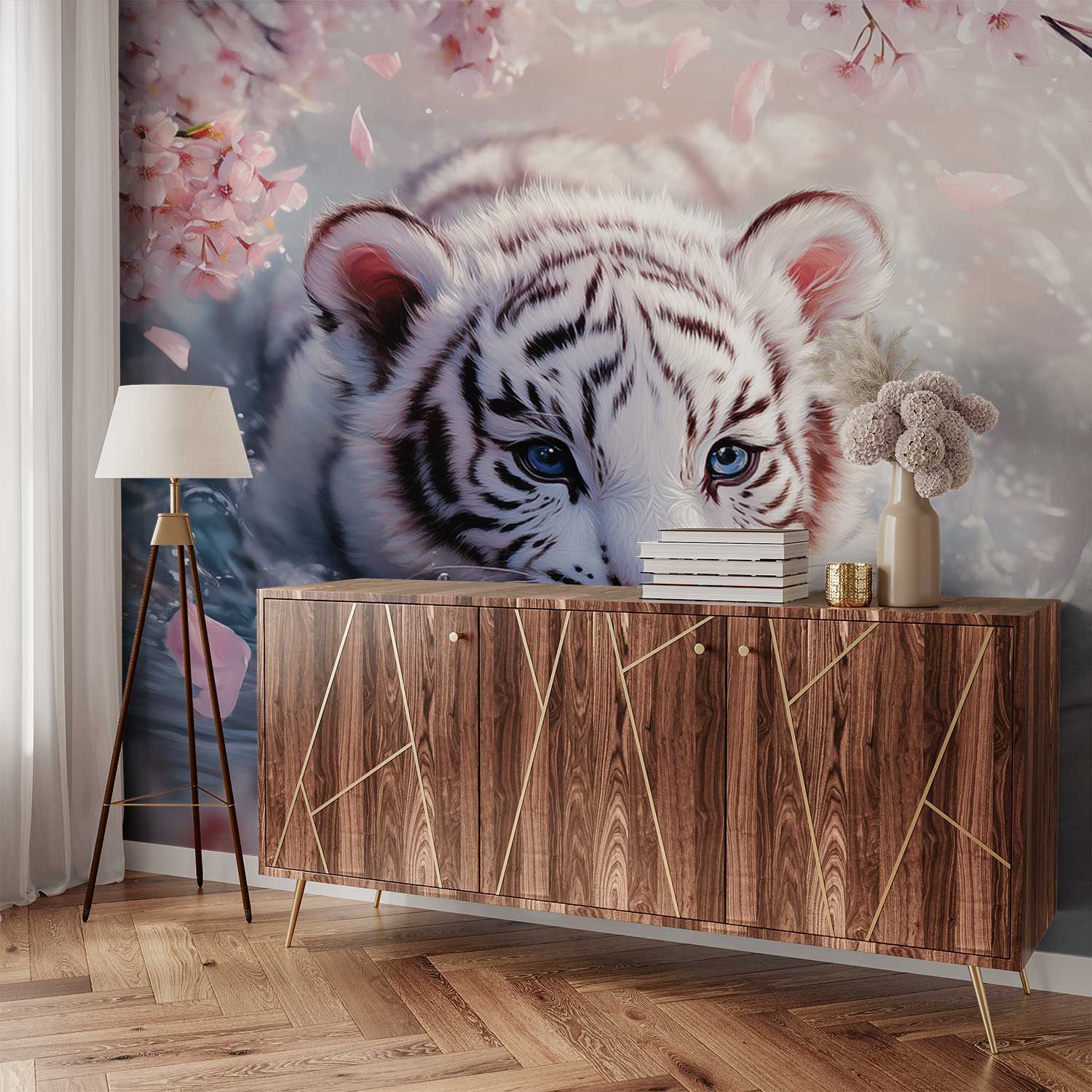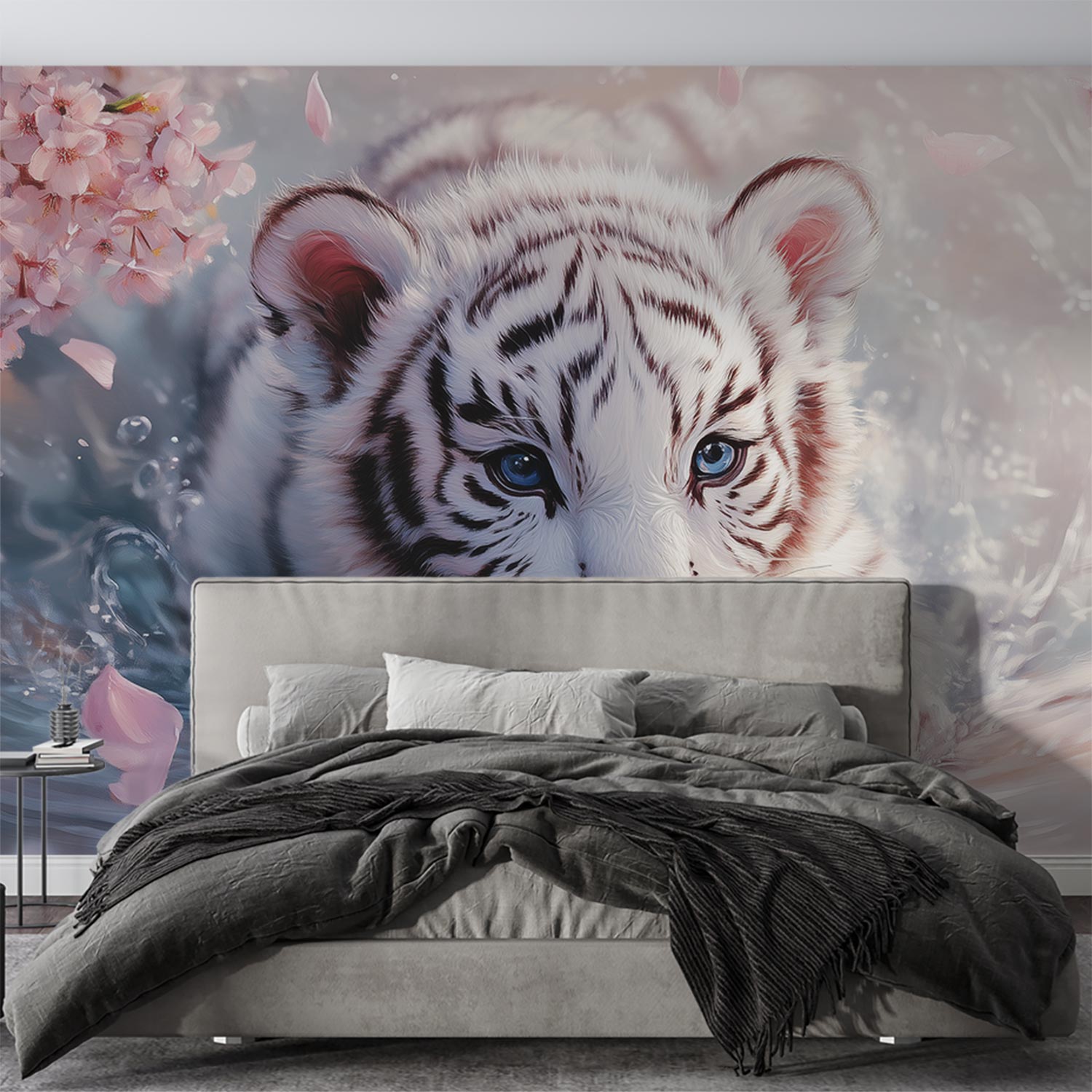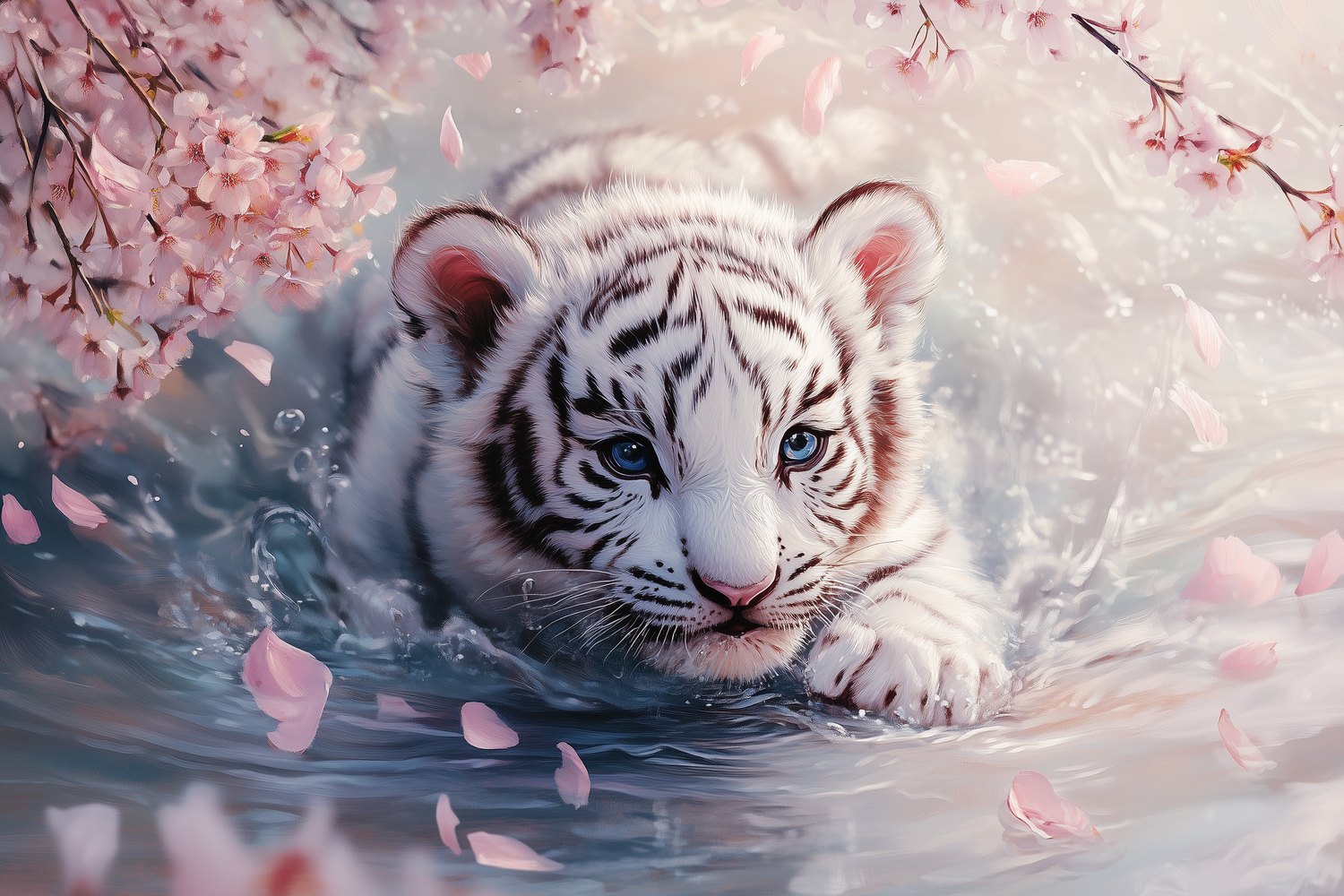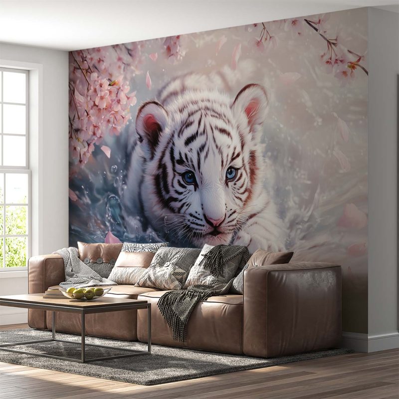 Zachte blauwe wateren omarmen een speelse witte tijgerwelp, omringd door drijvende roze bloesems. Zijn kop glinstert boven het oppervlak terwijl hij elegant door de serene omgeving beweegt. Deze betoverende scène brengt een vleugje wildernis en rust in je interieur, perfect voor een kalme sfeer in elke leefruimte.