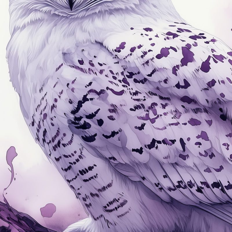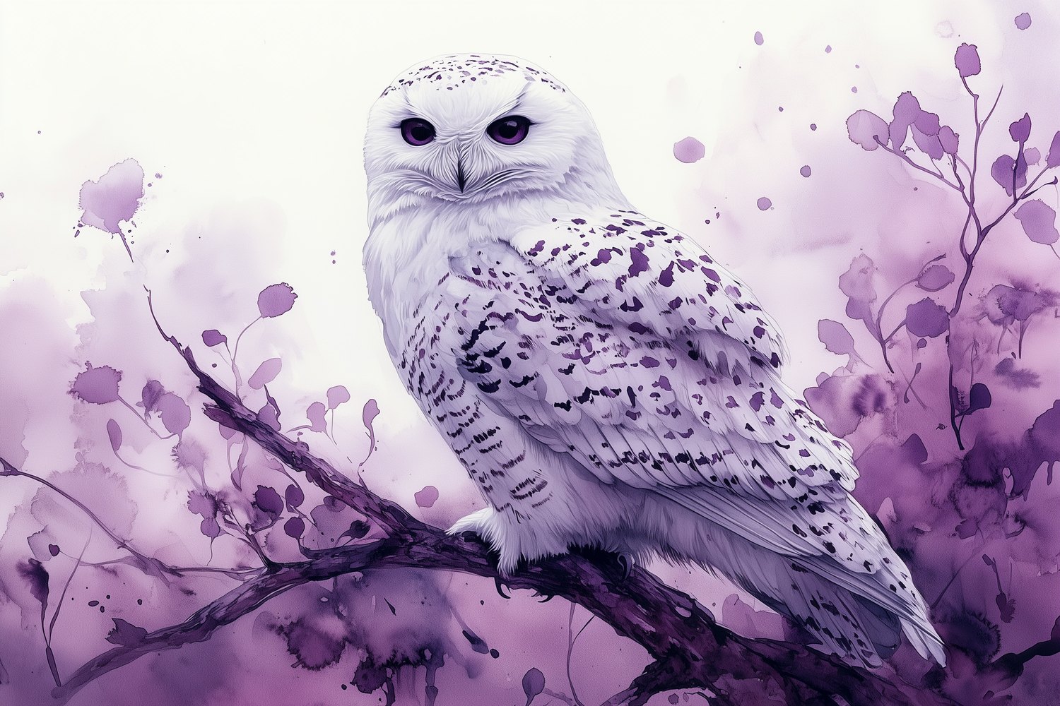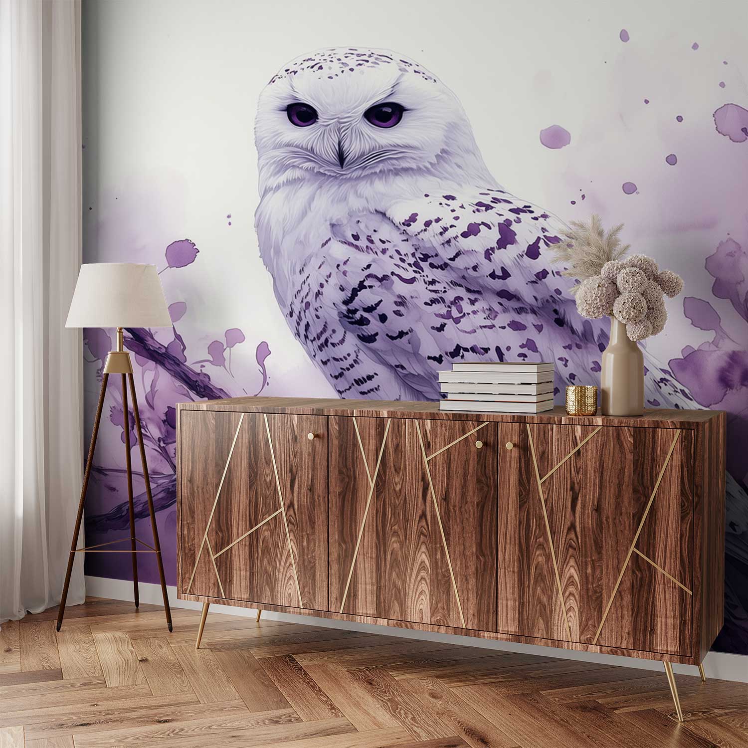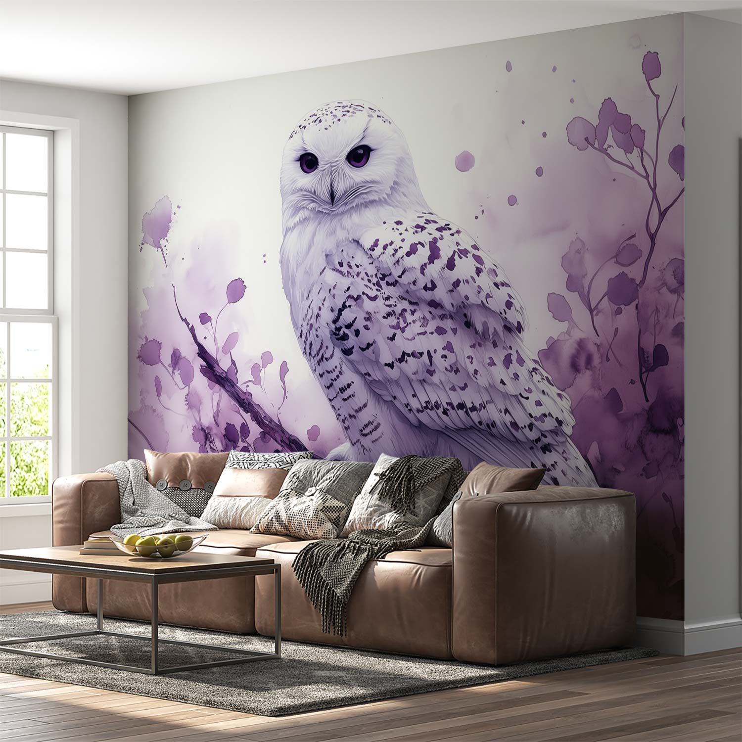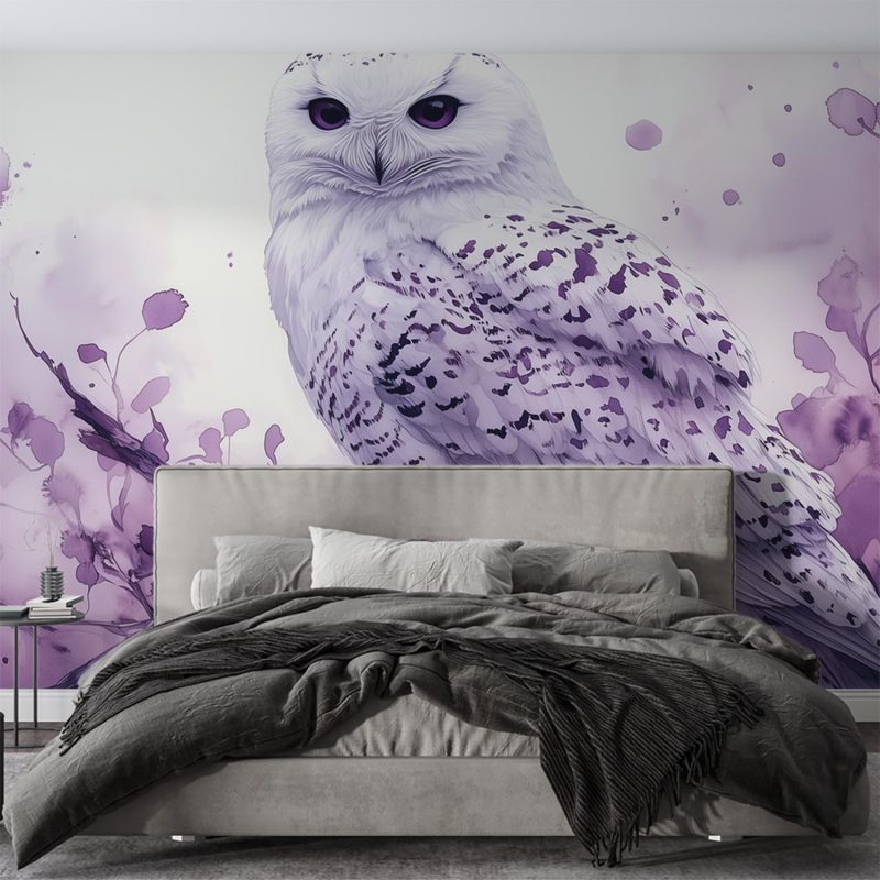 Zacht paars omringt een majestueuze witte uil, rustend op een tak. Bloemen dansen zachtjes om hem heen in een serene compositie. Deze kalmerende scène brengt de rust van de natuur naar binnen, perfect voor een accentmuur in je woonkamer of slaapkamer. Het creëert een vredige sfeer en voegt een vleugje elegantie toe aan elk interieur.