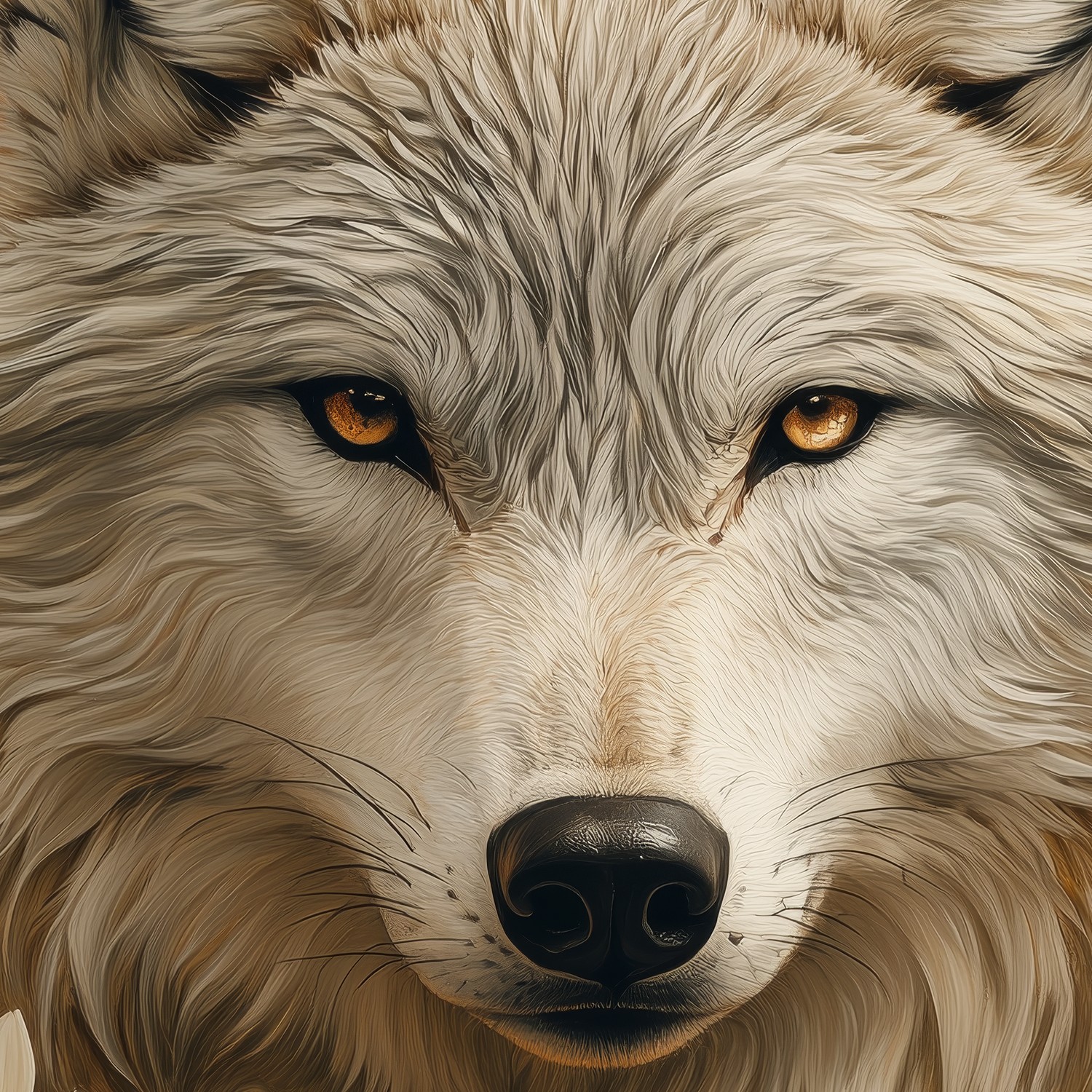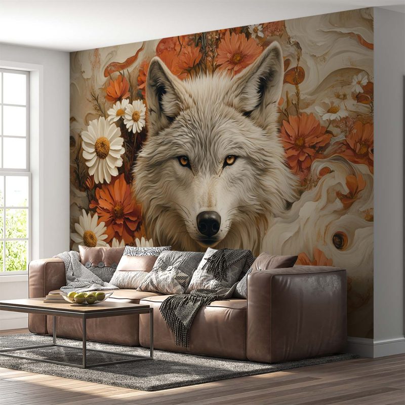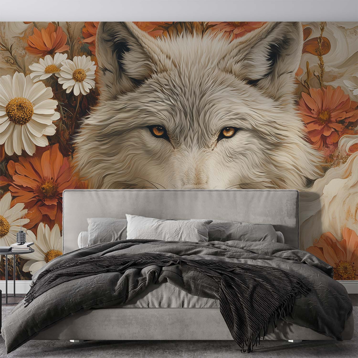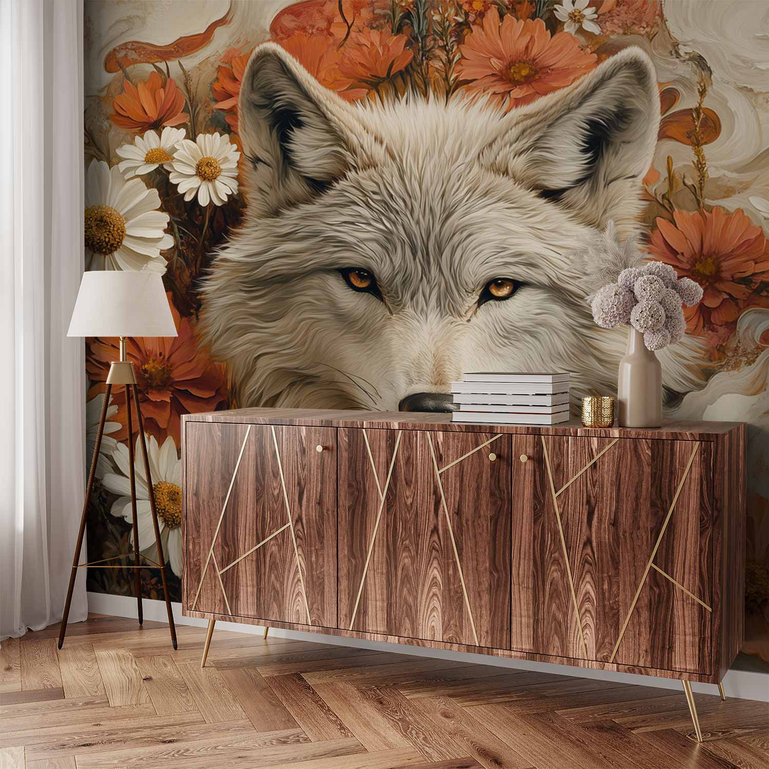Vibrante oranje en witte bloemen dansen rond de nieuwsgierige blik van een wolf. Zijn alertheid en de levendige bloemenzee creëren een betoverende diepte die je interieur tot leven wekt. Dit kunstzinnige tafereel brengt mysterie en natuurharmonie in je ruimte, perfect voor wie verfijnde wildheid zoekt. De dynamische compositie voegt fascinerende energie toe aan elke muur.