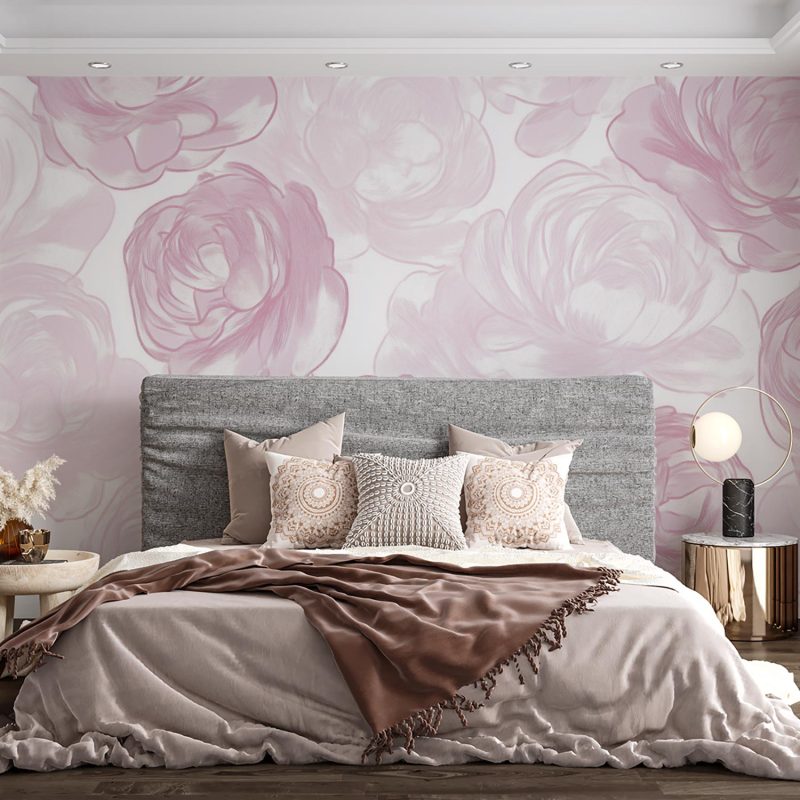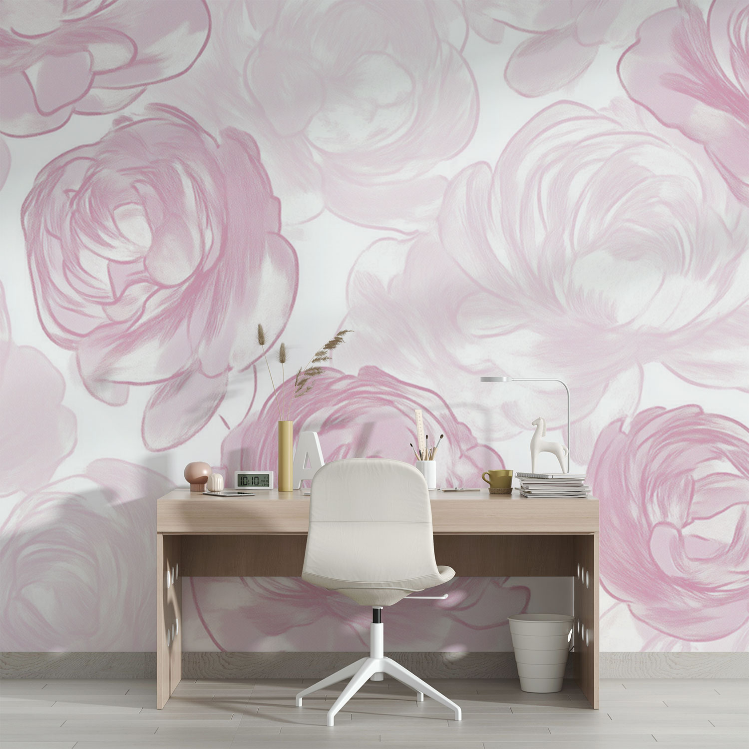 Zachte roze rozen dansen over een witte achtergrond, hun delicate bloemblaadjes lijken te zweven in een eeuwige lente. Dit behang brengt een gevoel van sereniteit en tijdloze elegantie in elke ruimte. De subtiele diepte en harmonieuze compositie creëren een kalmerende sfeer die perfect werkt in slaapkamers of woonruimtes waar rust en schoonheid centraal staan.