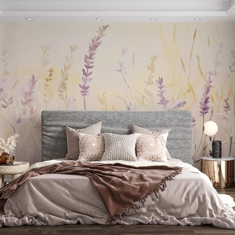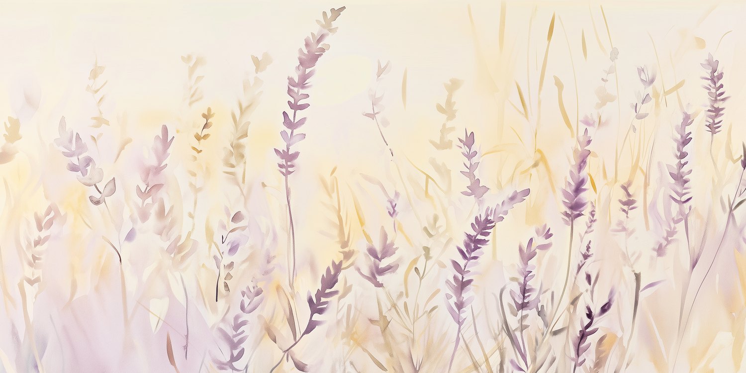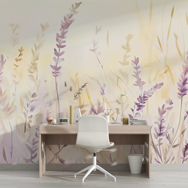 Zacht watercolor paars bloemenveld behang